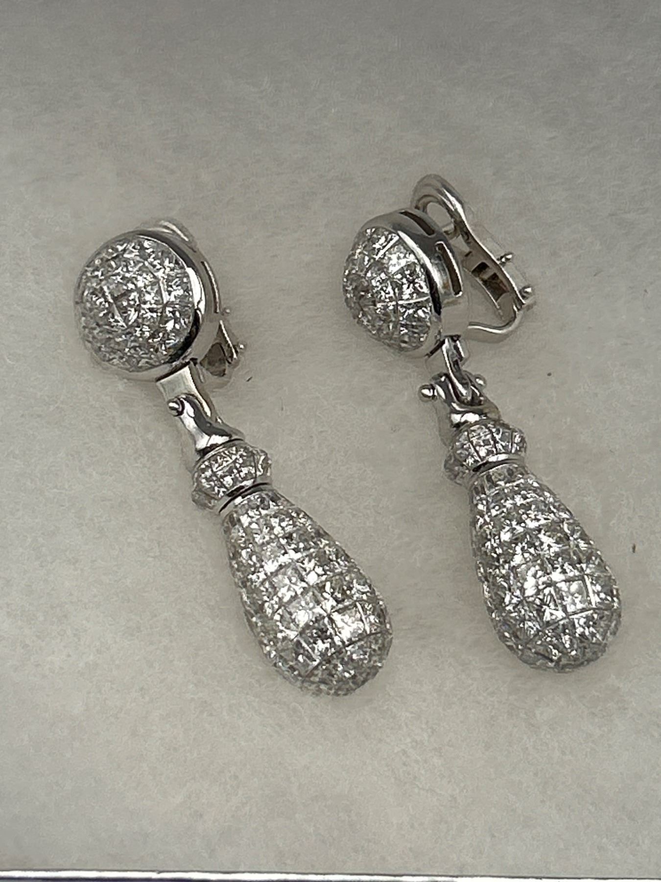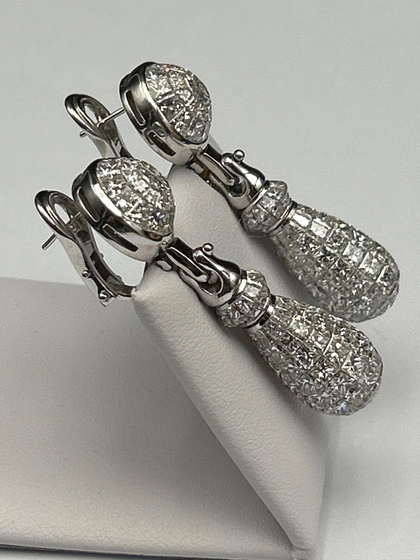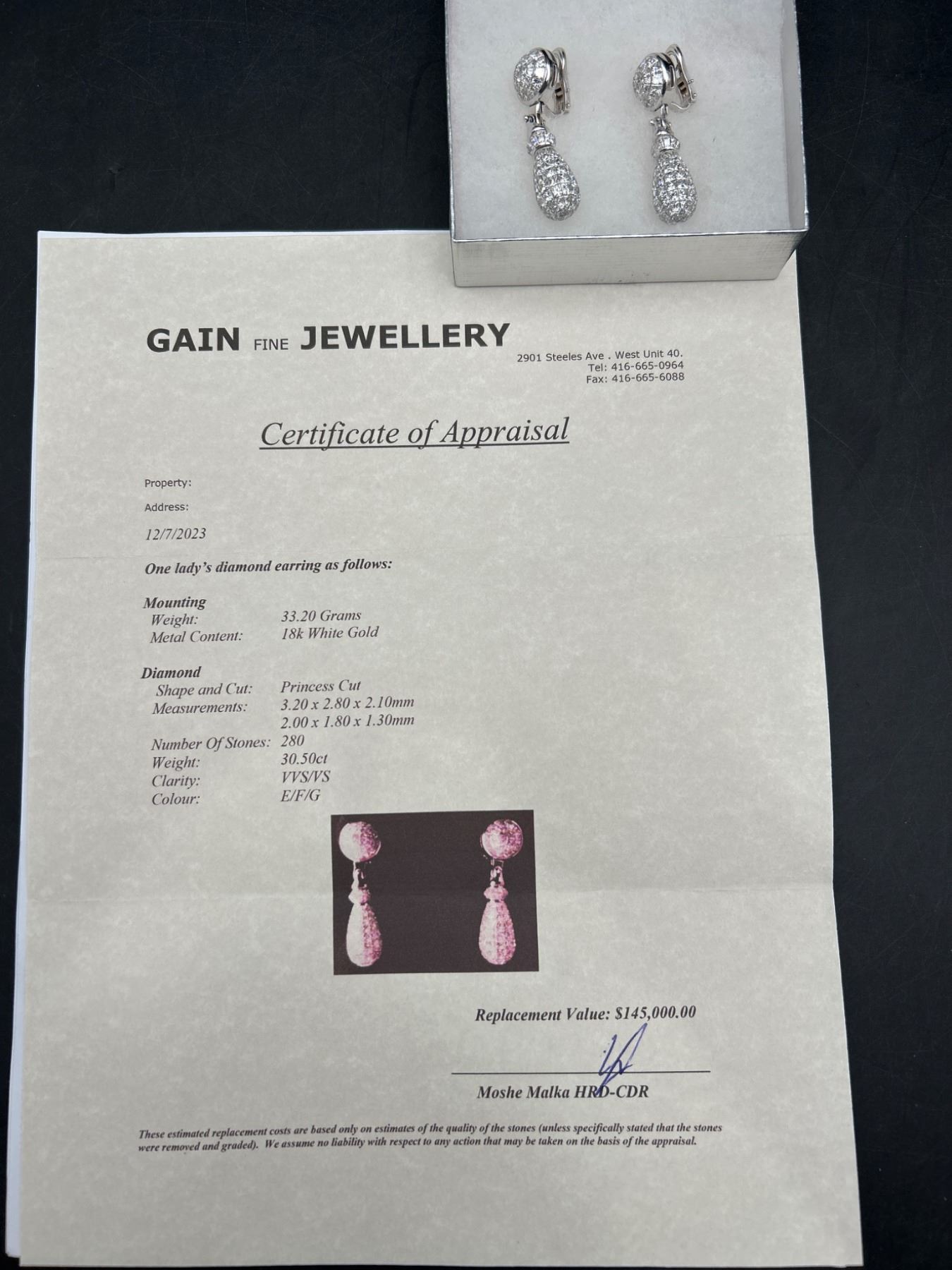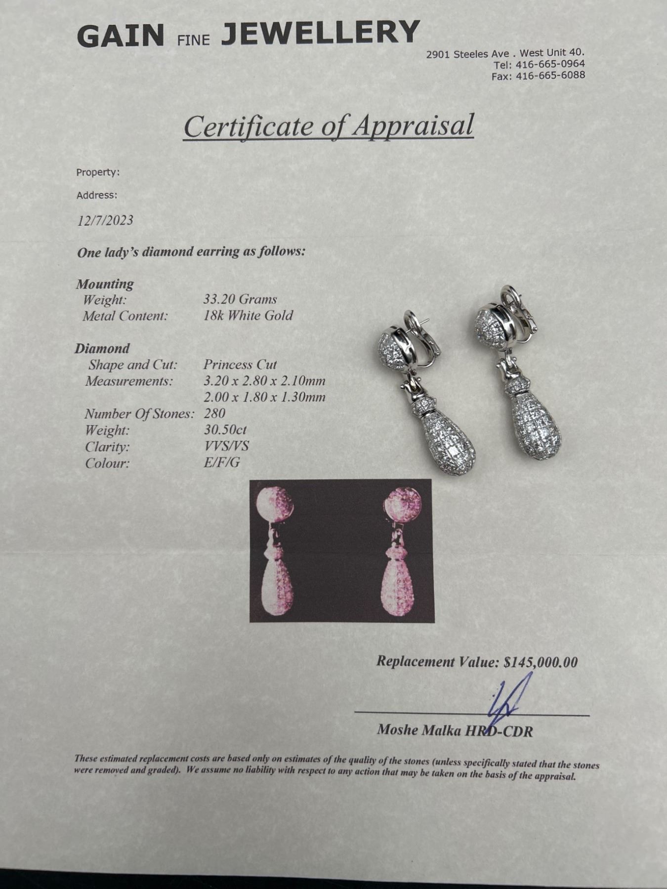 One pair of diamond earrings crafted in 18K white gold. The earrings feature a total gold weight of 33.20 grams and contain 280, 30.15 carats of princess-cut diamonds. The stones are graded as VS/FS in clarity and E/F/G in color. Includes a certificate verifying details and valuation with certificate of appraisal of $145,000.00