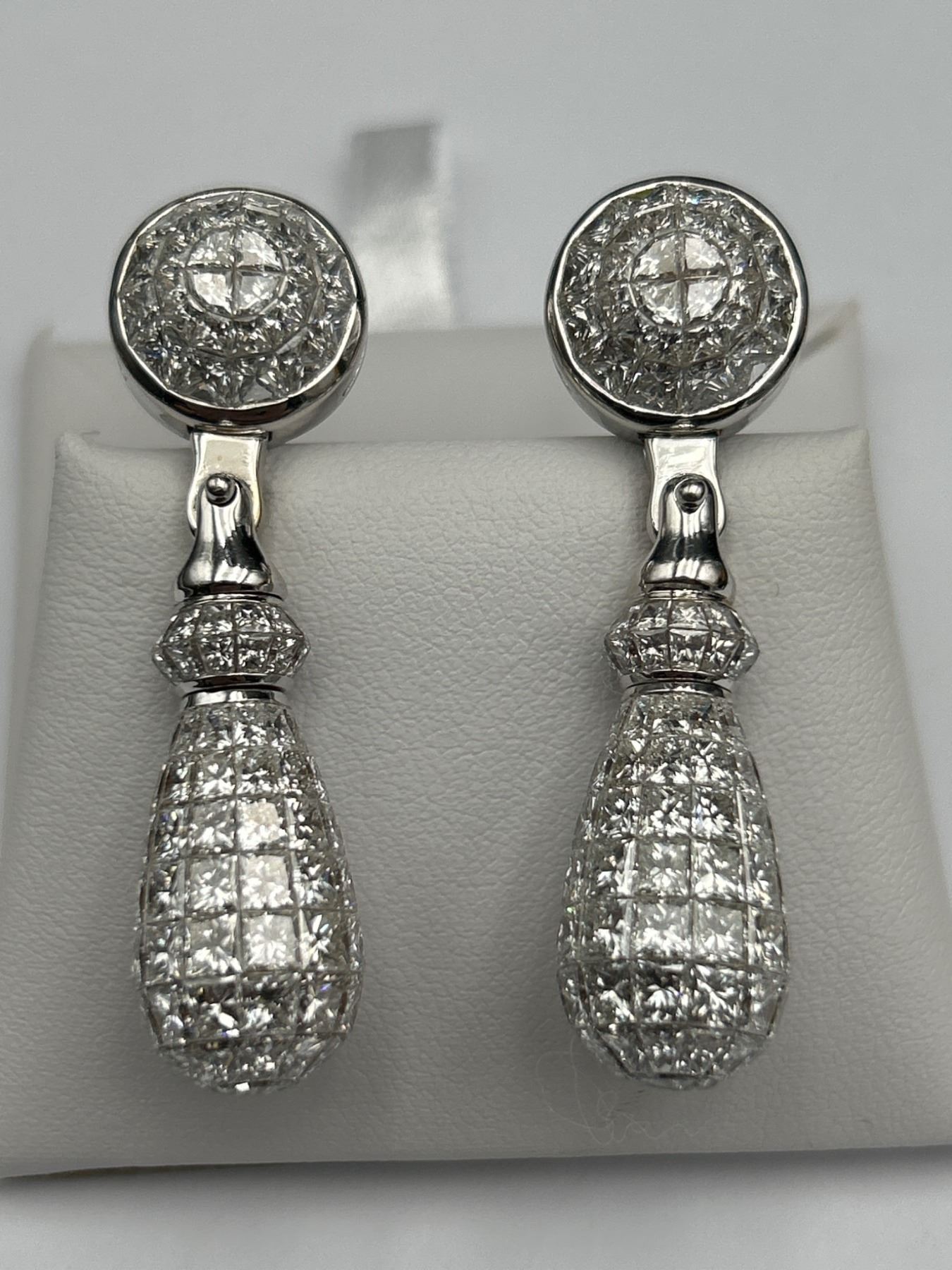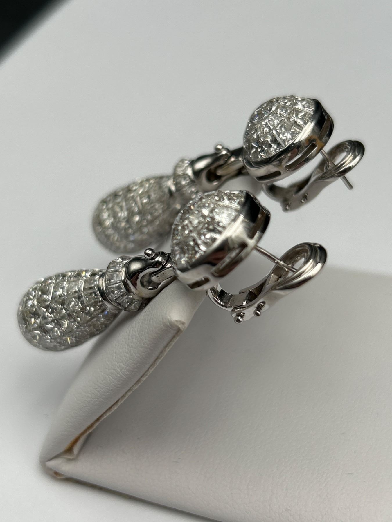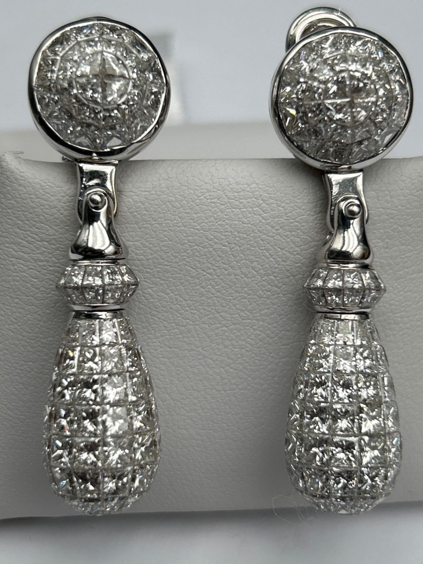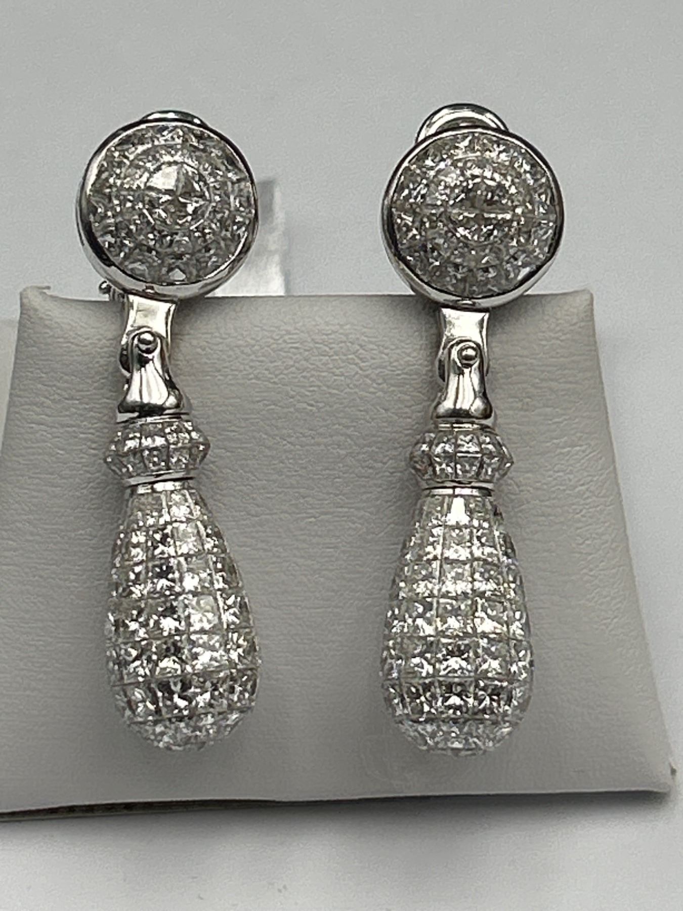 One pair of diamond earrings crafted in 18K white gold. The earrings feature a total gold weight of 33.20 grams and contain 280, 30.15 carats of princess-cut diamonds. The stones are graded as VS/FS in clarity and E/F/G in color. Includes a certificate verifying details and valuation with certificate of appraisal of $145,000.00