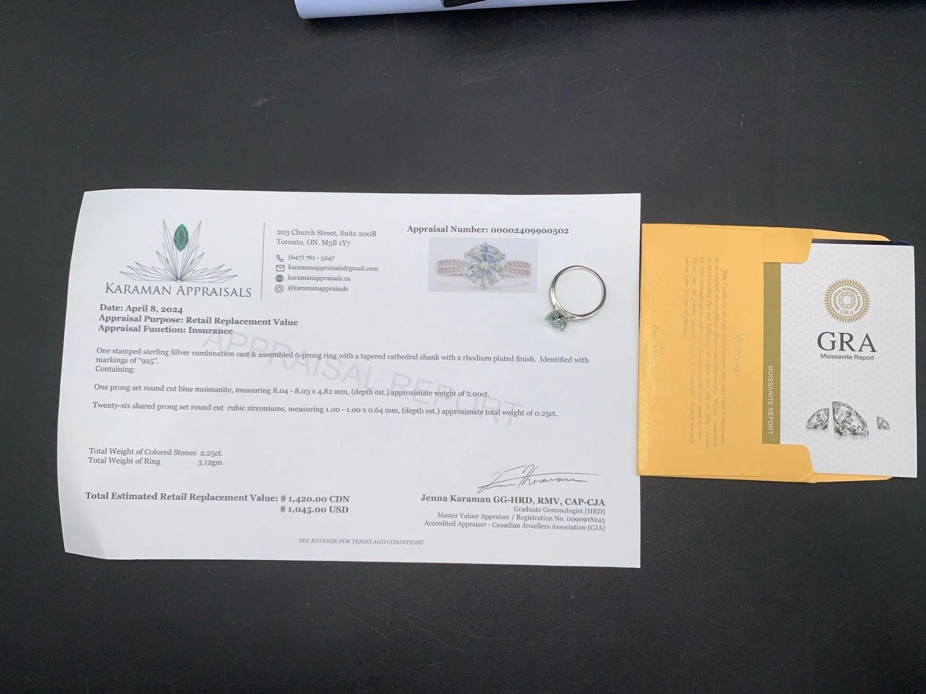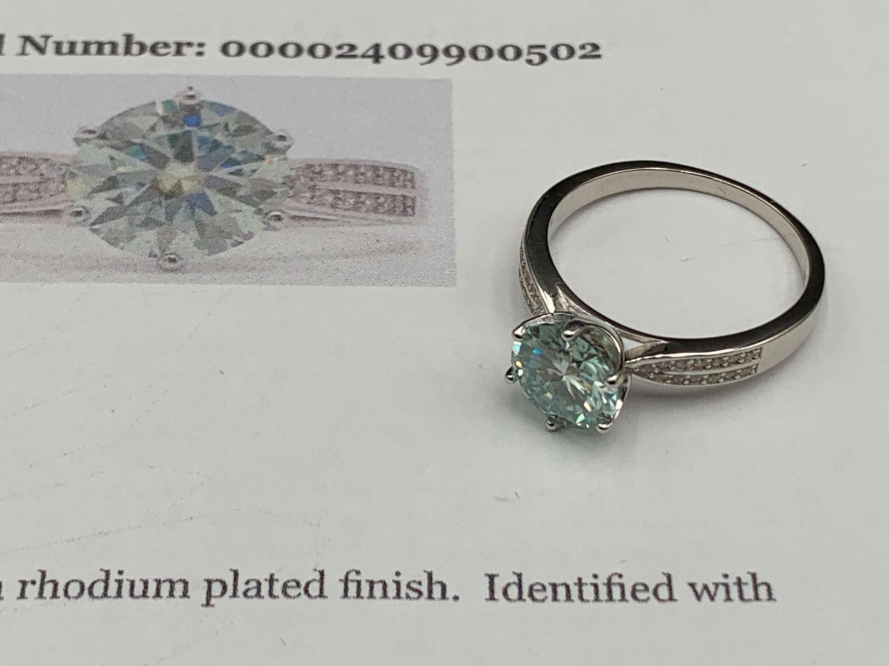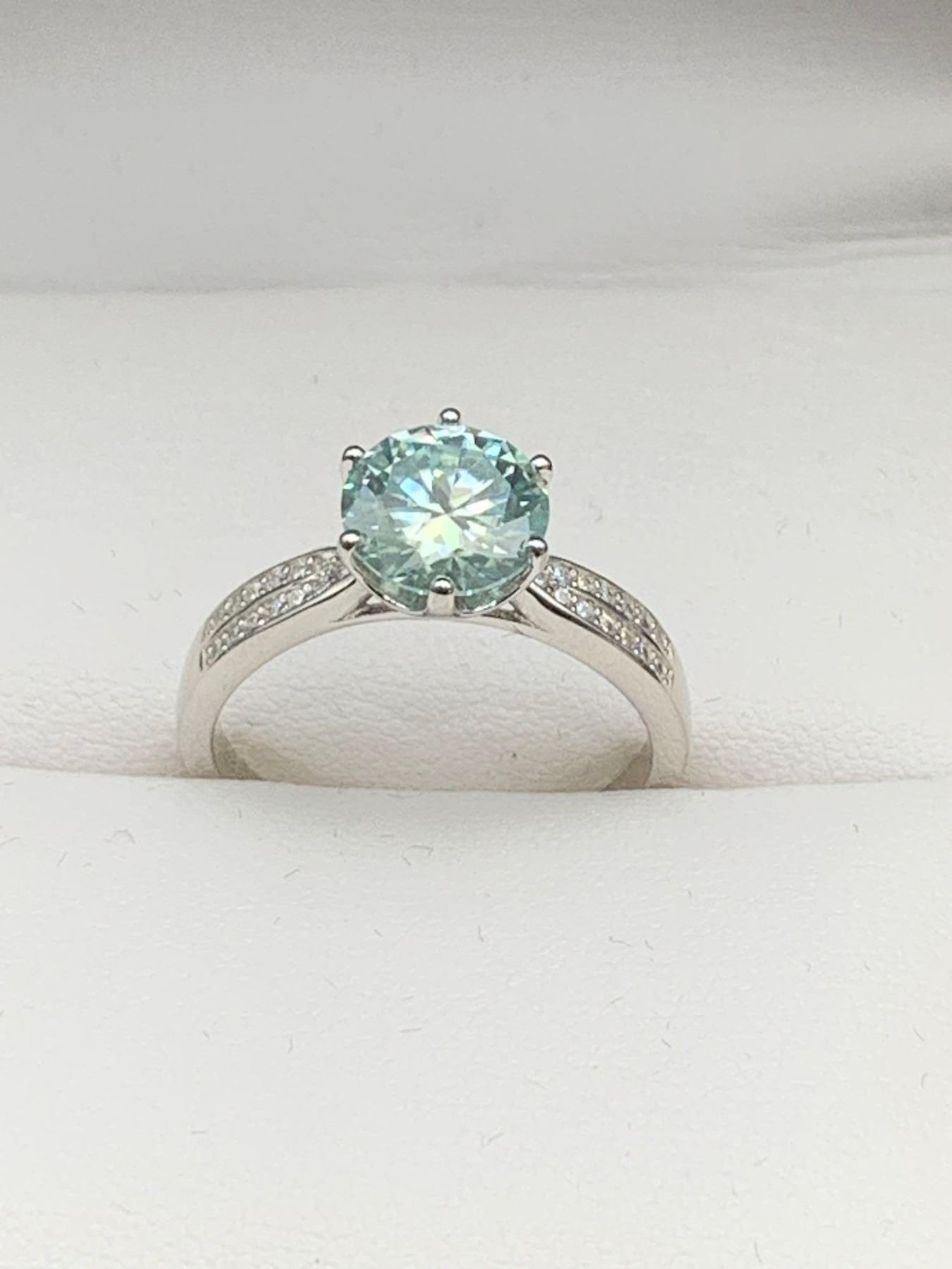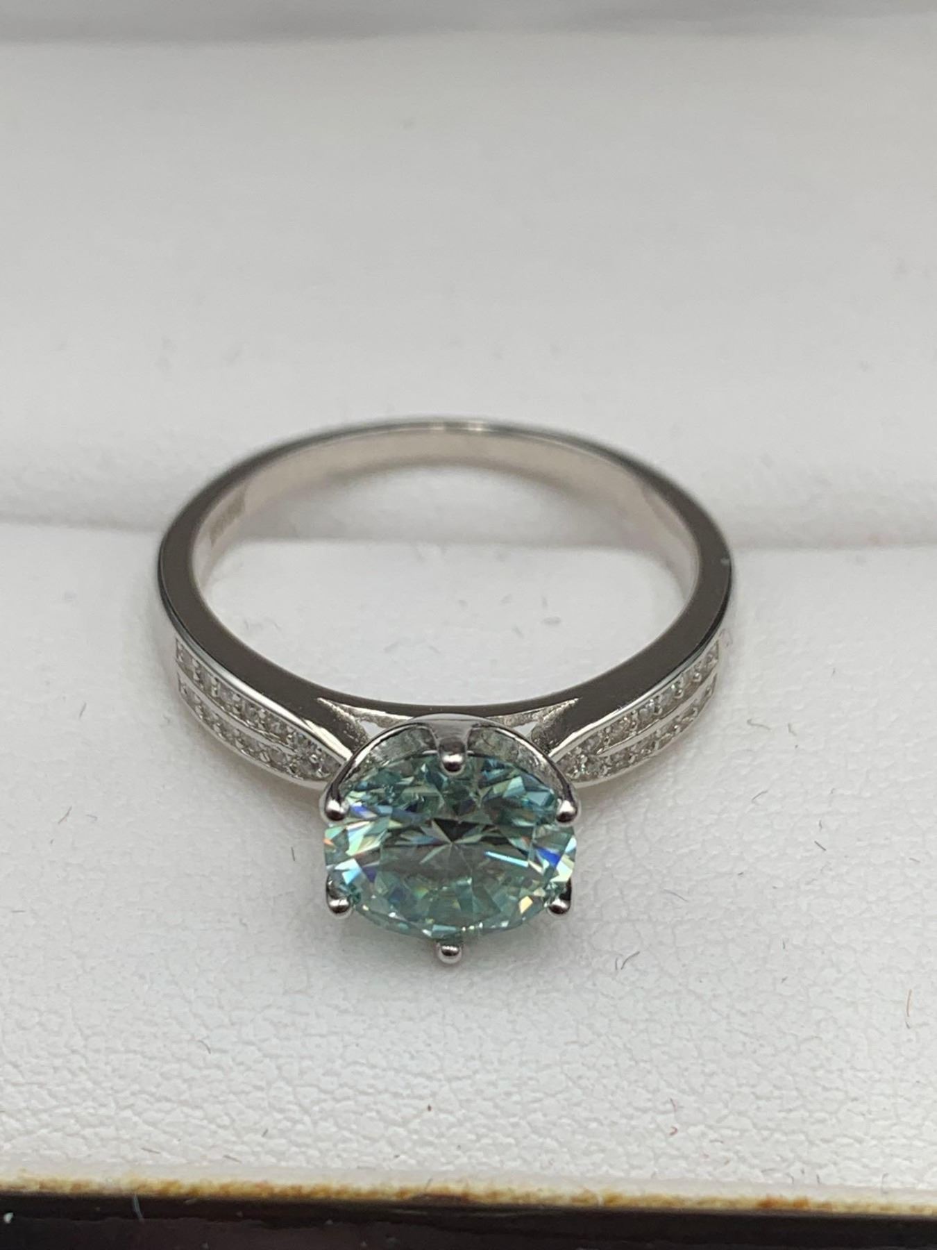 2.00 CT GRA CERTIFIED MOISSANITE VVS BLUE COLOR SET IN 6 CLAW HEAD WITH 26 ROUND CUT CUBIC ZIRCONIA SET IN BOTH TAPERED SHANKS WEIGHING A TOTAL 0.25 CT SET IN STERLING SILVER RETAIL REPLACEMENT $1,420.00