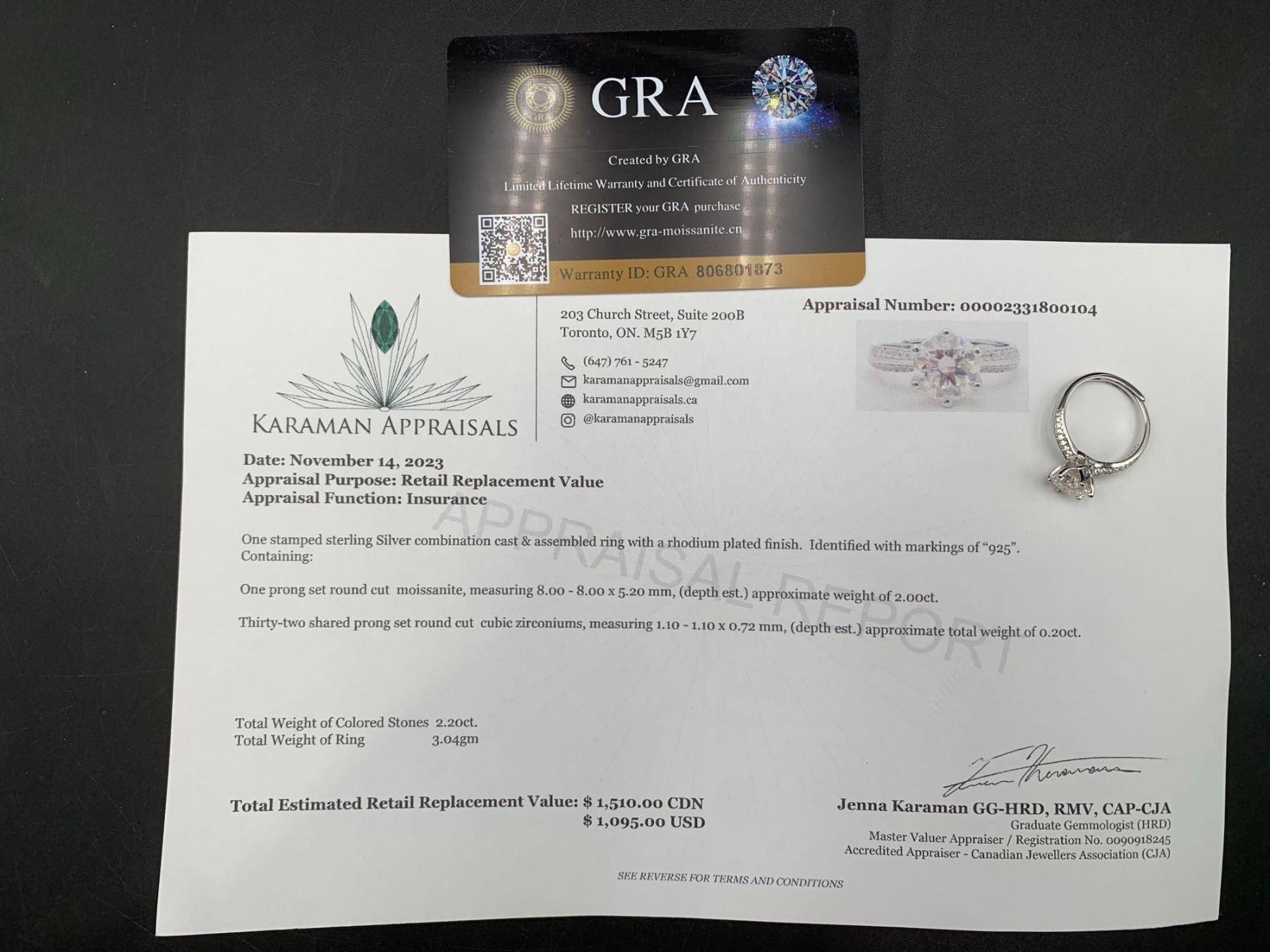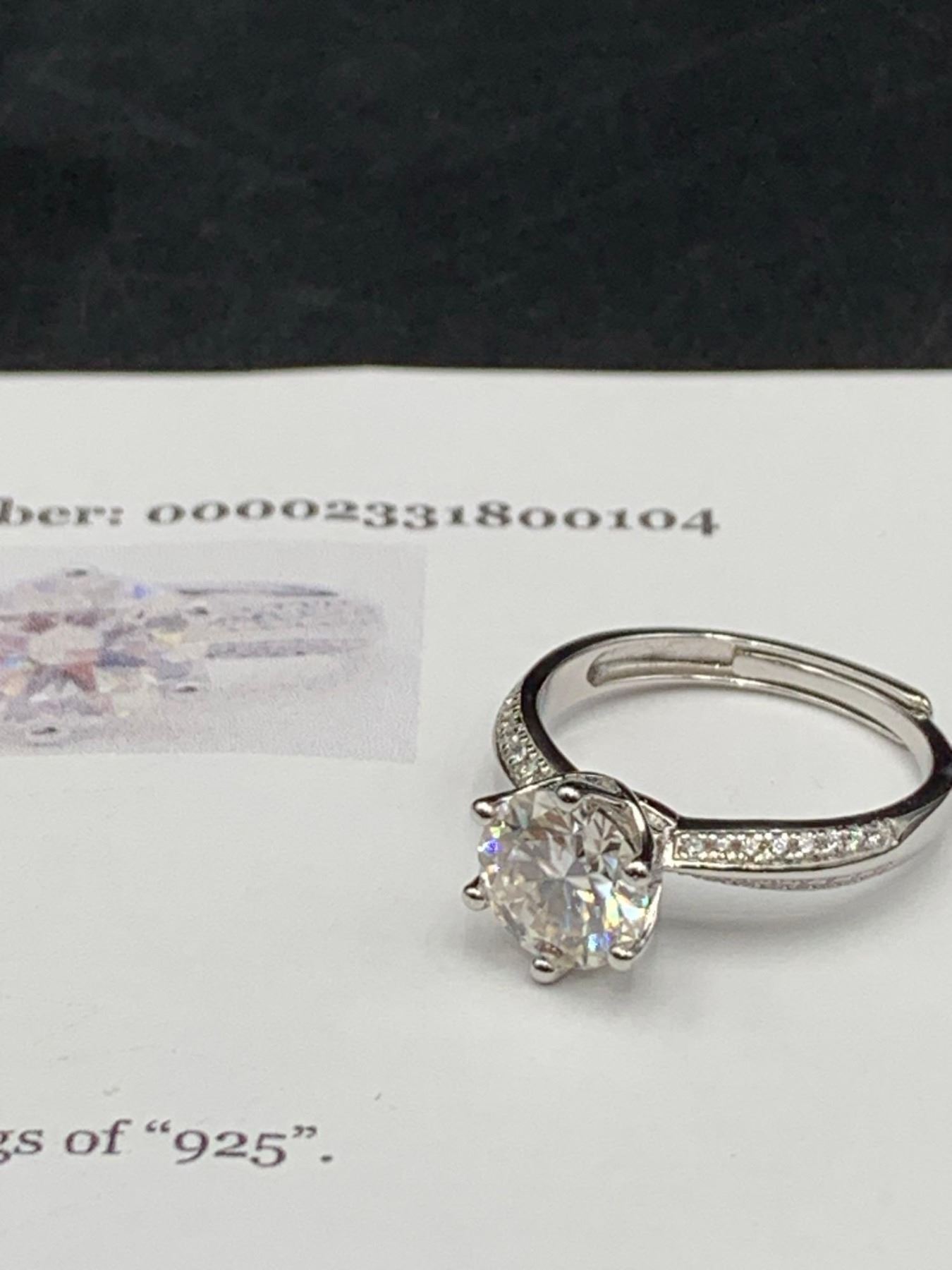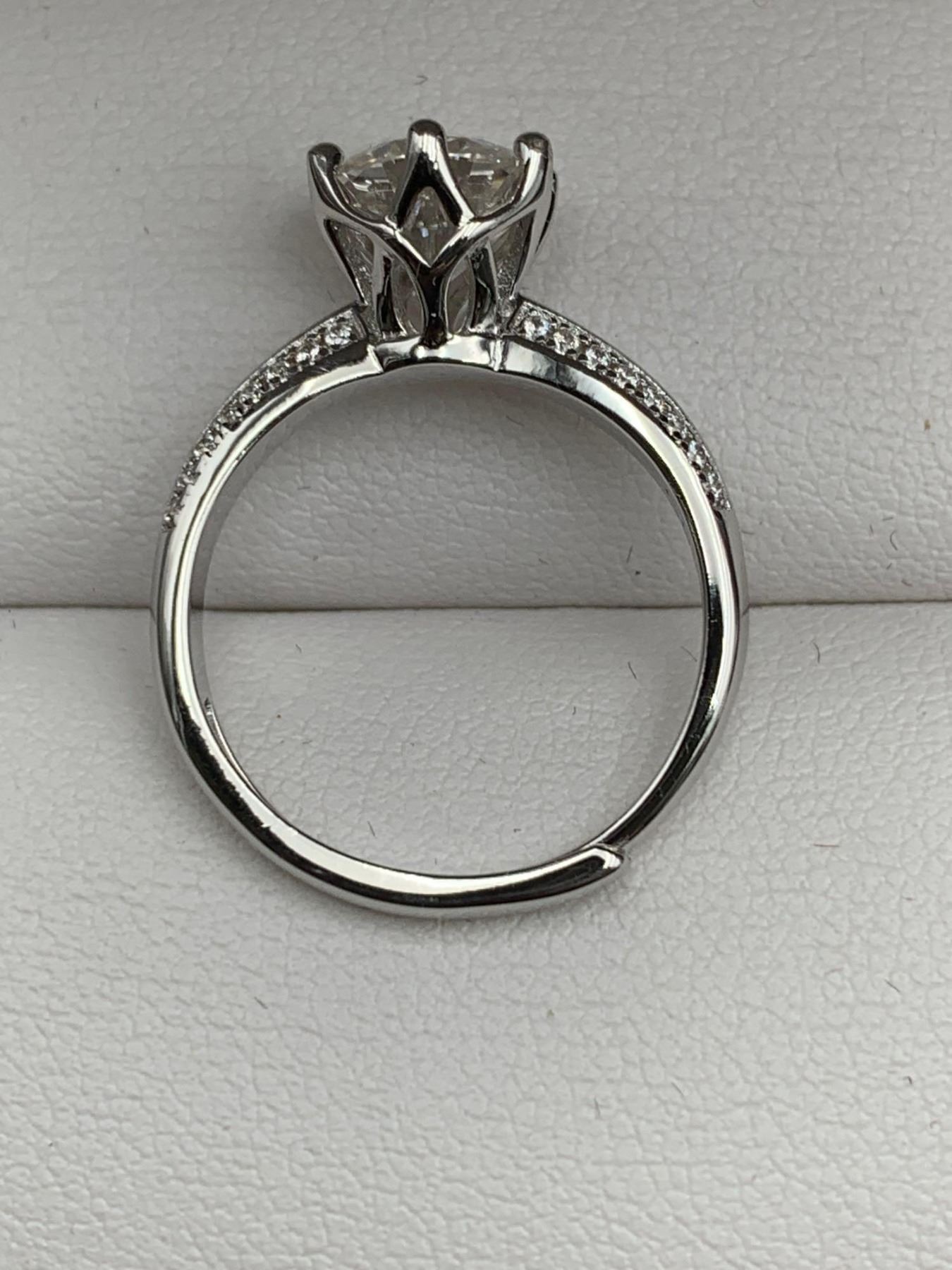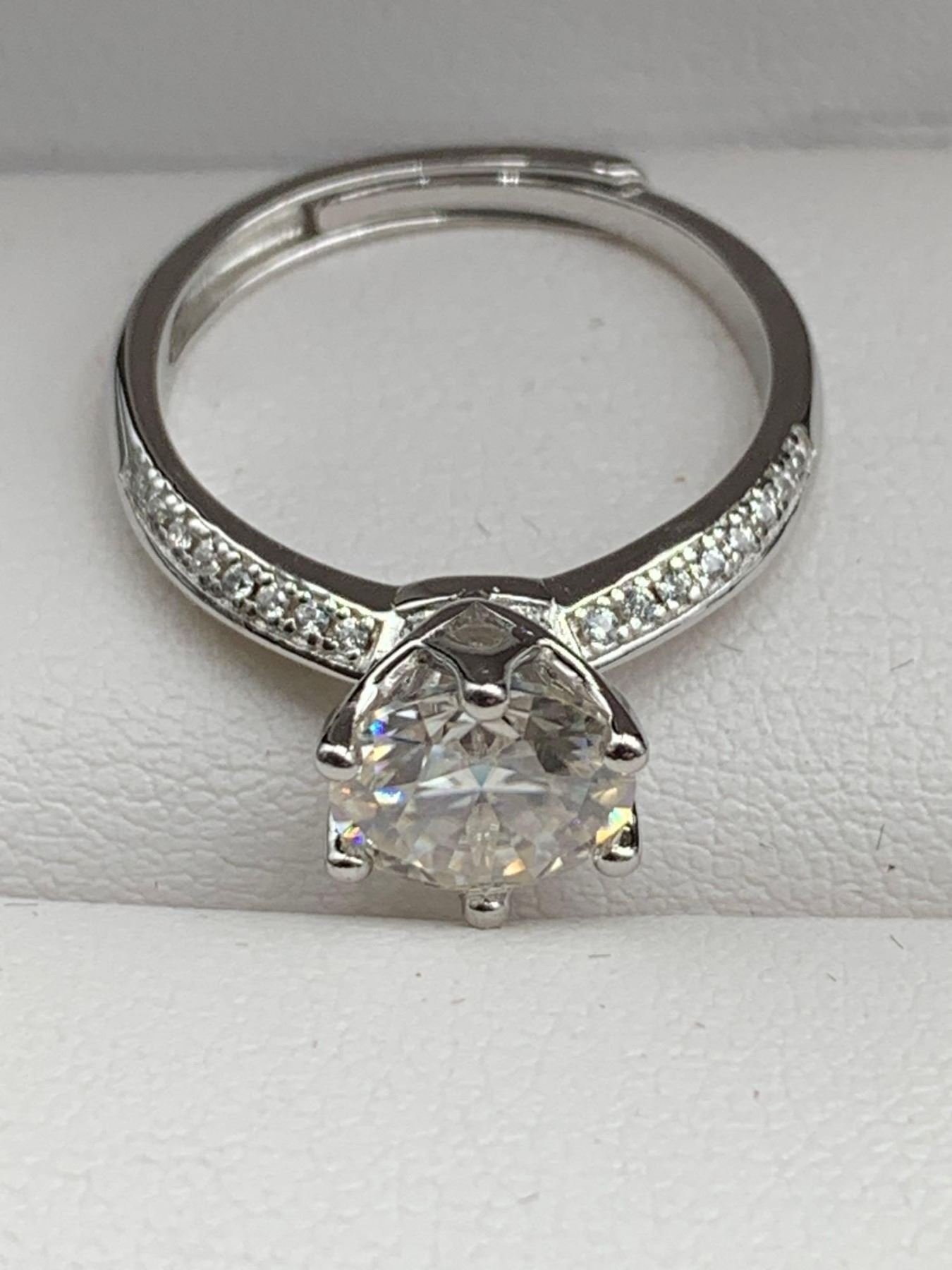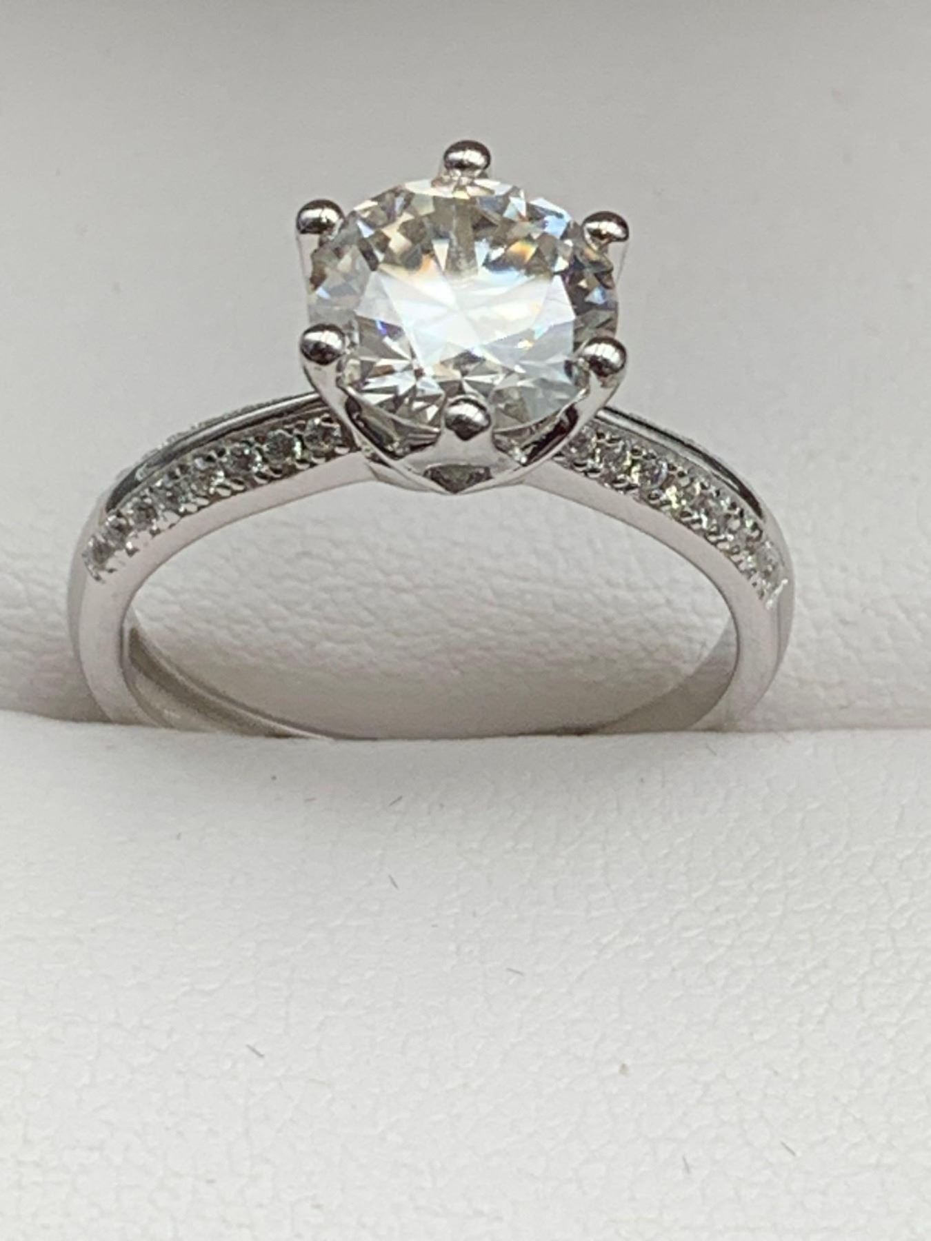 2.00 CT GRA CERTIFIED ROUND CUT MOISSANITE VVS D WITH 16 ROUND CUBIC ZIRCONIUM SET IN EACH SHANK WEIGHING A TOTAL 0.20 CT SET IN STERLING SILVER RETAIL REPLACEMENT VALUE $1,510.00