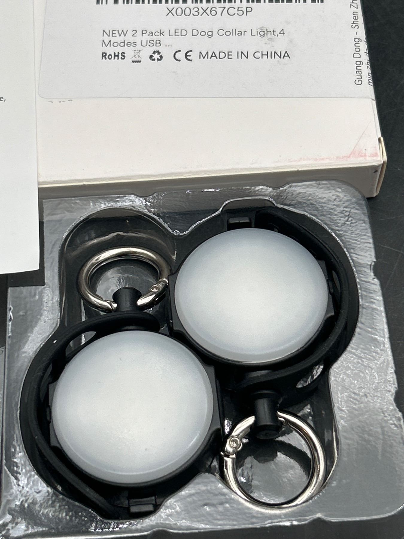 Two LED dog collar lights offering 4 different light modes for visibility and safety. Rechargeable via USB. Includes metal rings for attachment. Model number X003X6T6GP, made in China. RoHS and CE certified.
