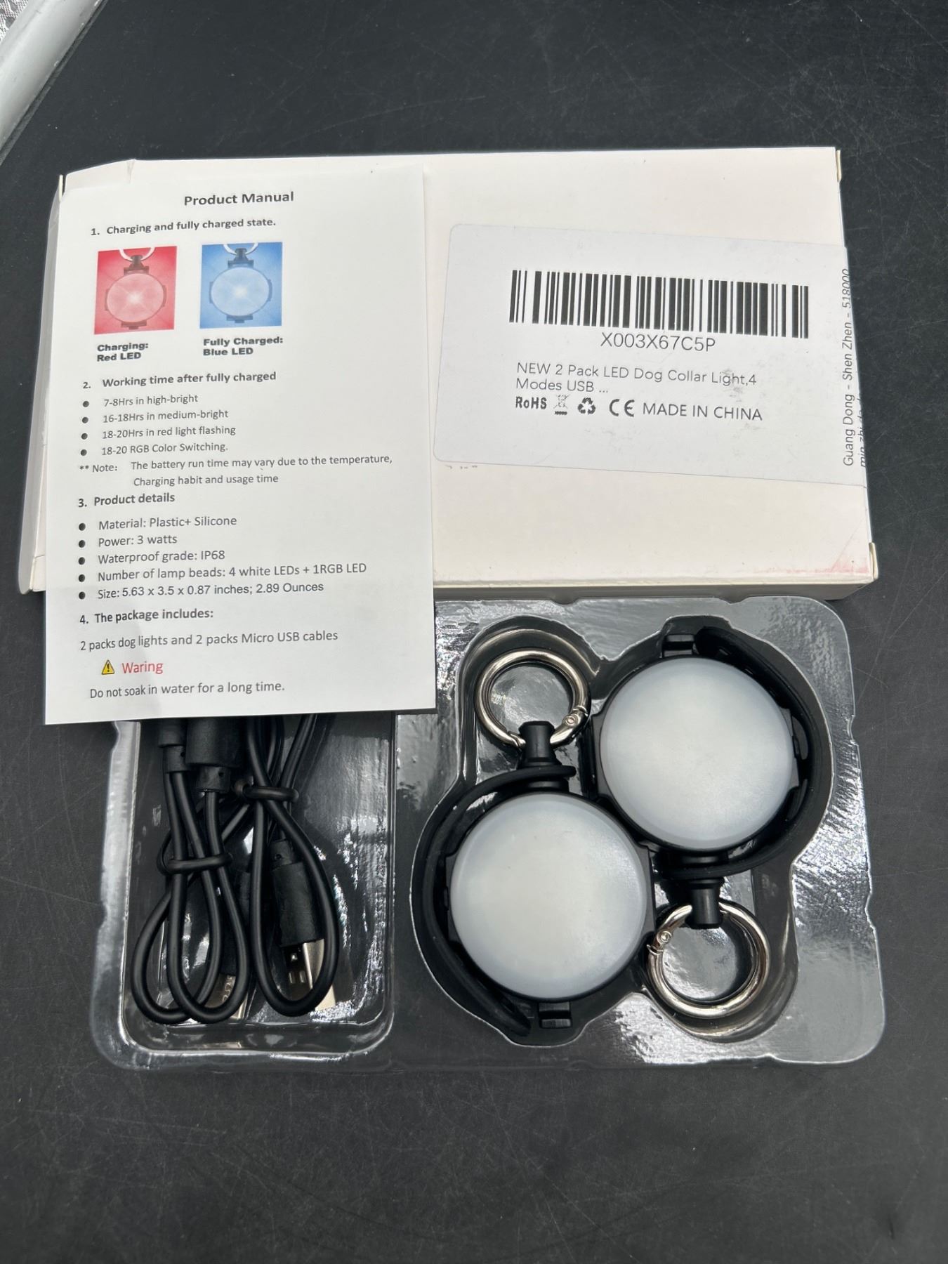 Two LED dog collar lights offering 4 different light modes for visibility and safety. Rechargeable via USB. Includes metal rings for attachment. Model number X003X6T6GP, made in China. RoHS and CE certified.