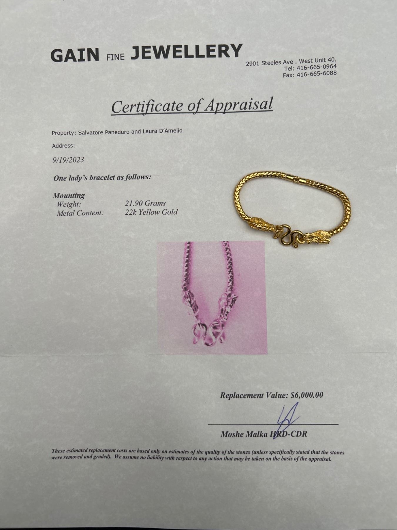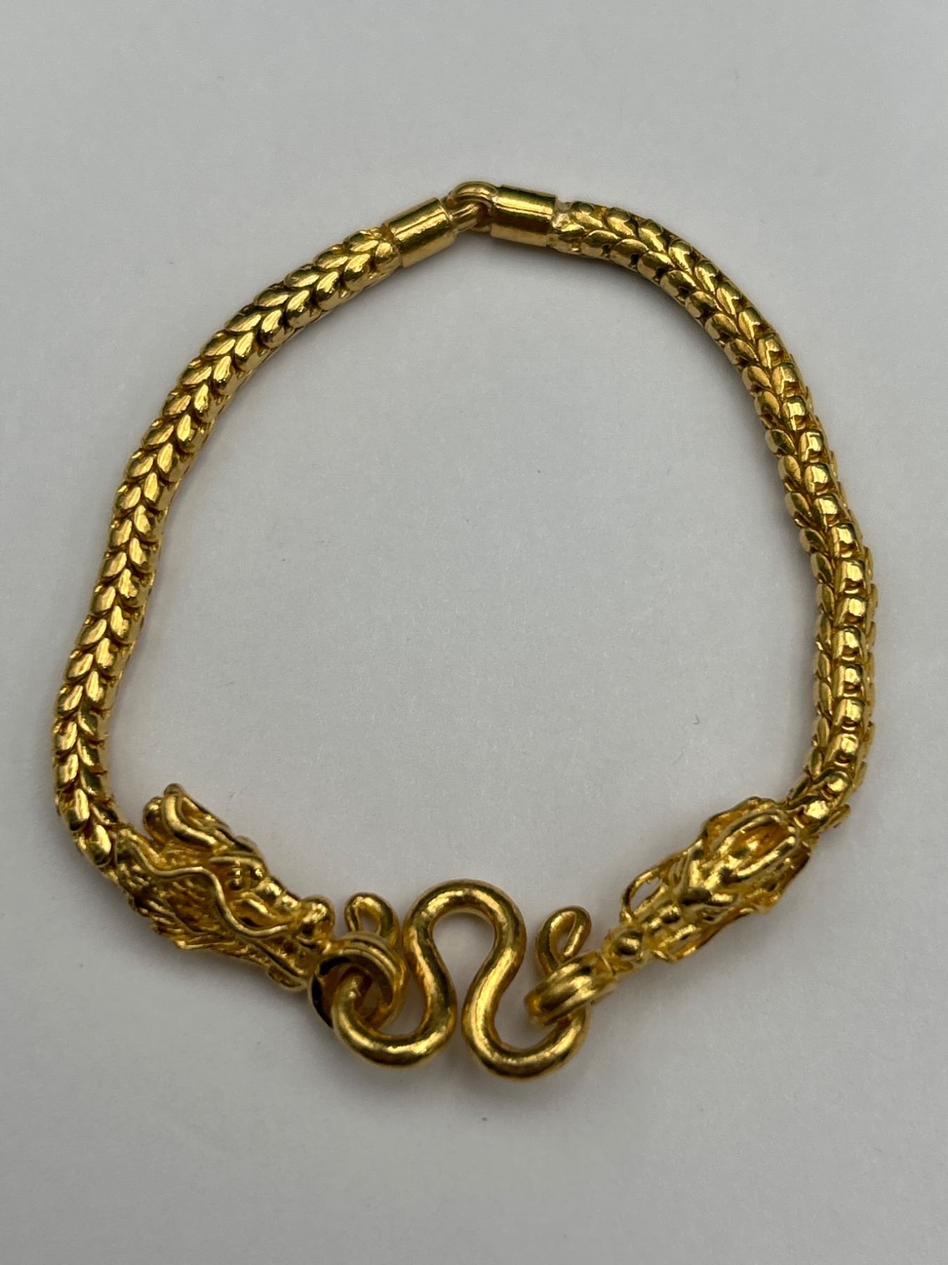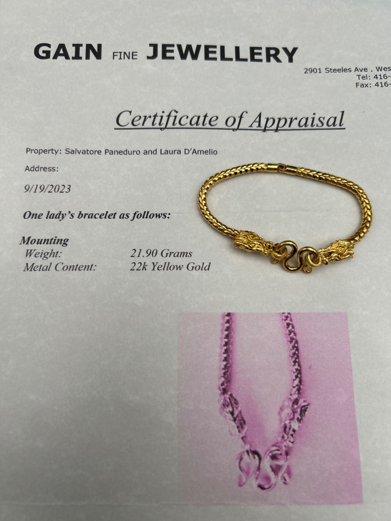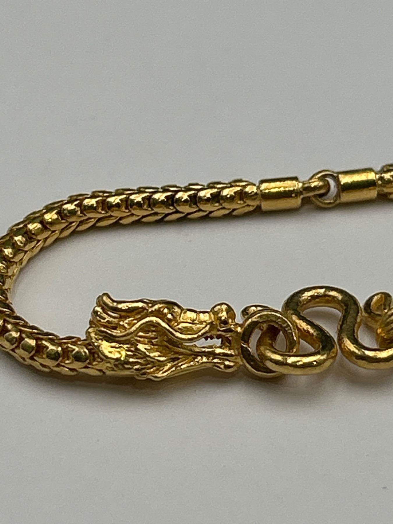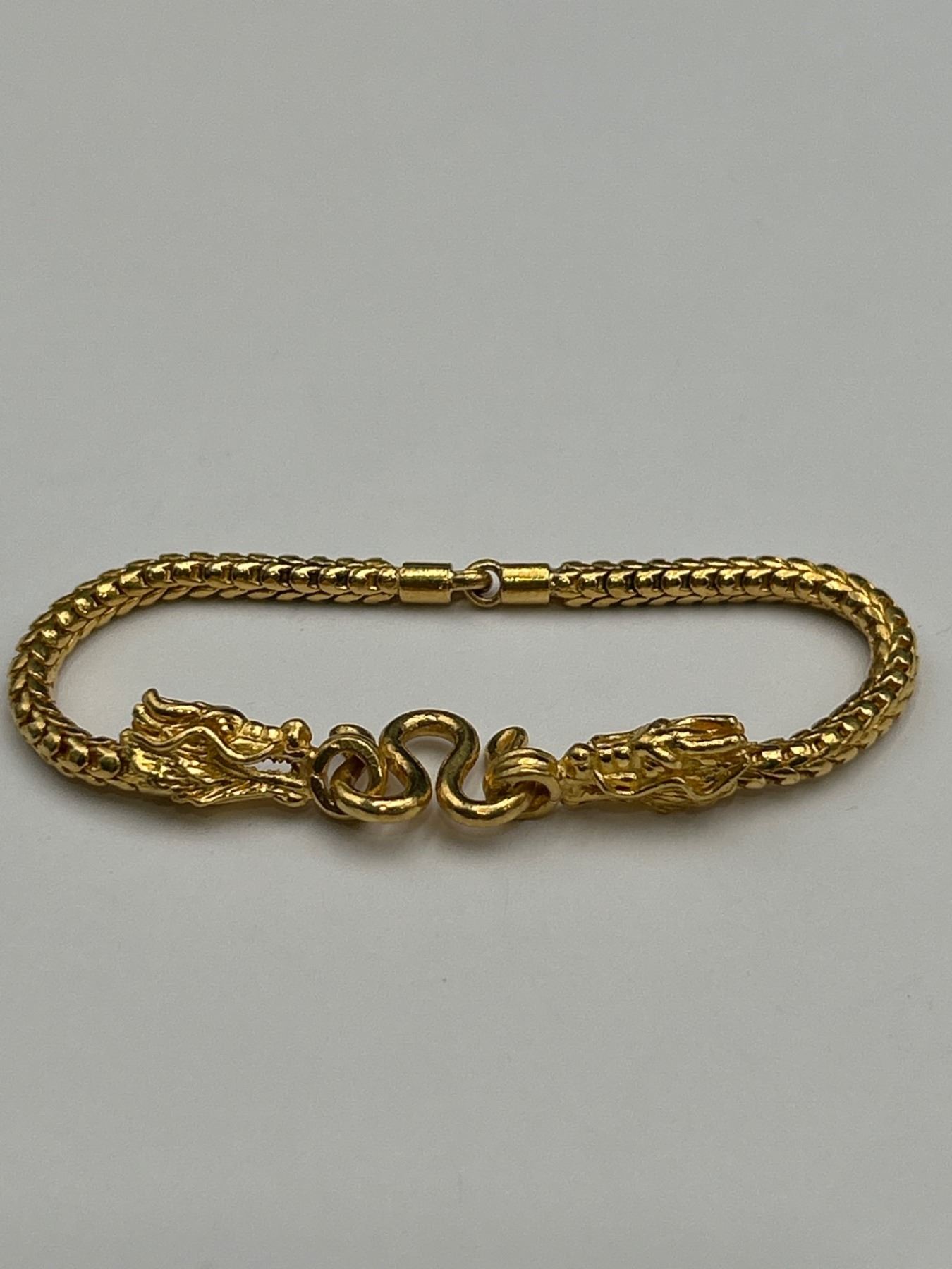 One ladies bracelet featuring a dragon motif design. The bracelet is crafted in 22K yellow gold with a total weight of approximately 21.90 grams. The piece is detailed with intricate dragon heads and a secure clasp mechanism. This item was appraised on 9/19/2023, as documented by Gain Fine Jewellery.