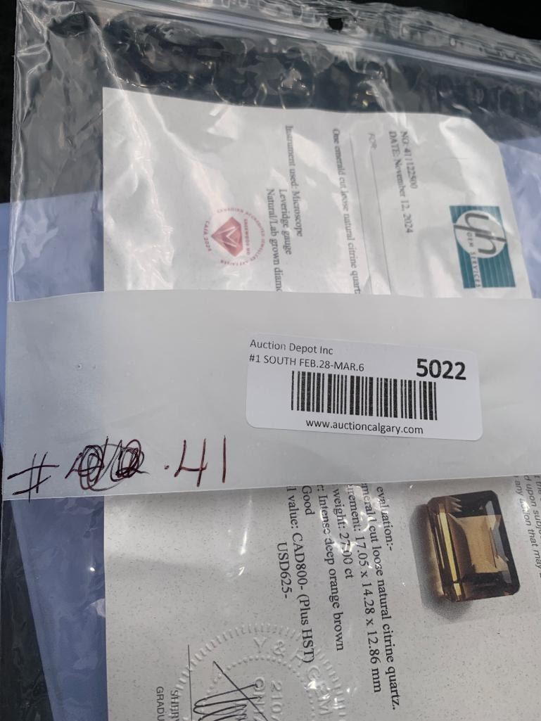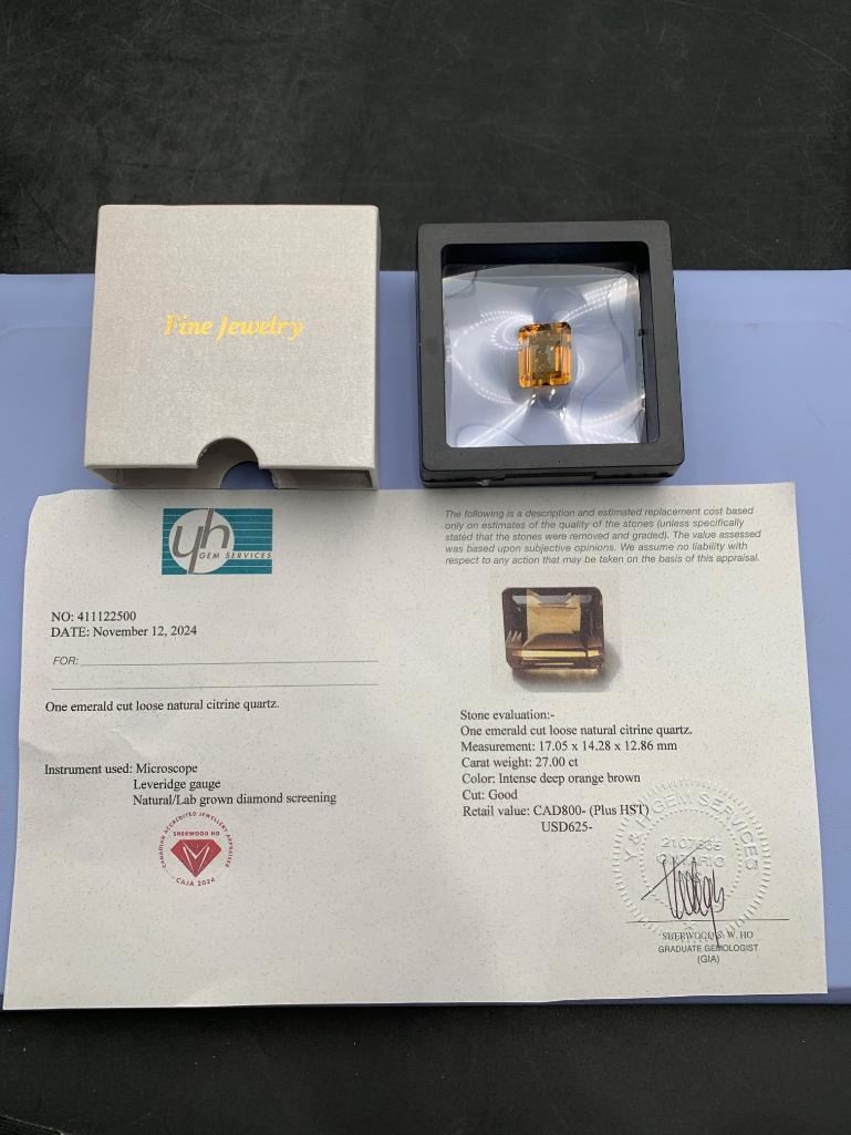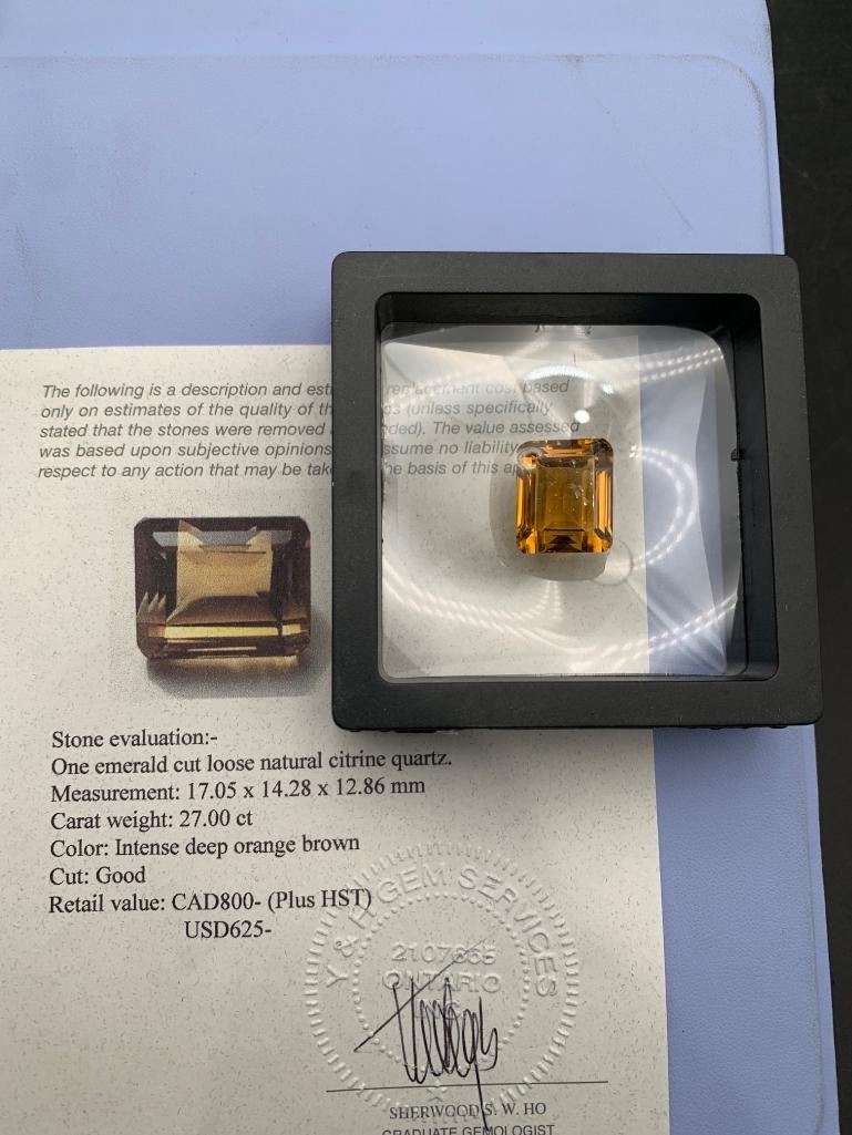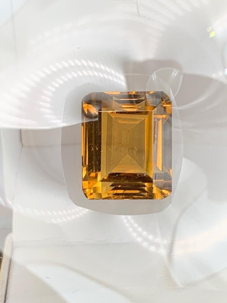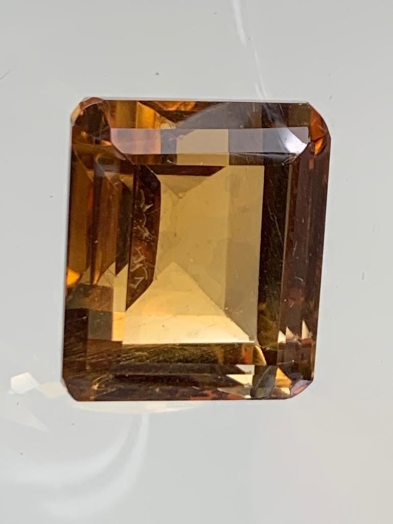 27.00 CARAT INTENSE DEEP ORANGE BROWN NATURAL CITRINE QUARTZ IN EMERALD CUT 17.05 X 14.28 X 12.86 mm RETAIL VALUE $800.00