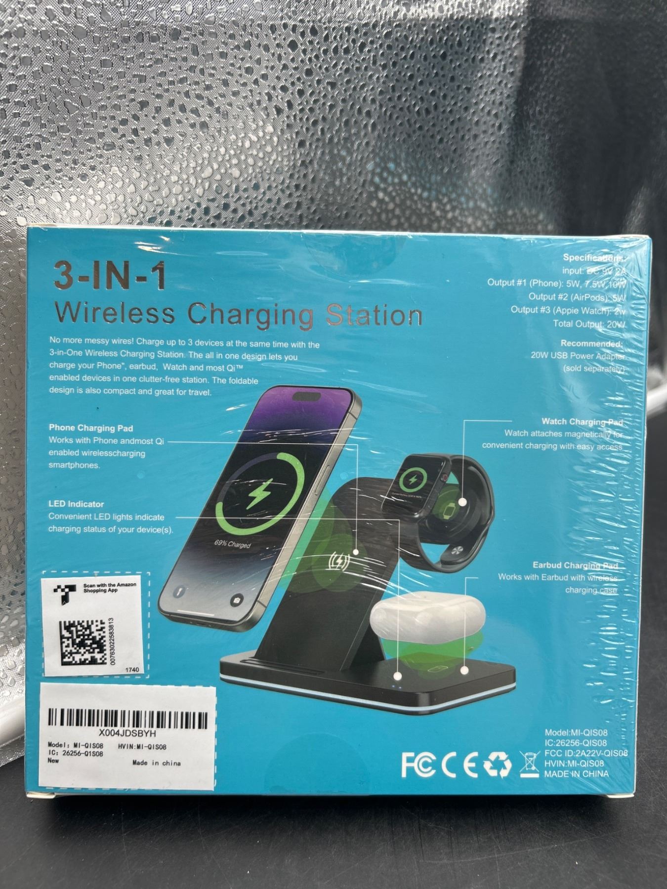 Model M-019SB is a 3-in-1 wireless charging station featuring compatibility for Qi-enabled devices such as smartphones, smartwatches, and wireless earbuds. It includes a phone charging pad, LED indicators for charging status, and a foldable design for versatile use. Complies with FCC and CE standards. Made in China.