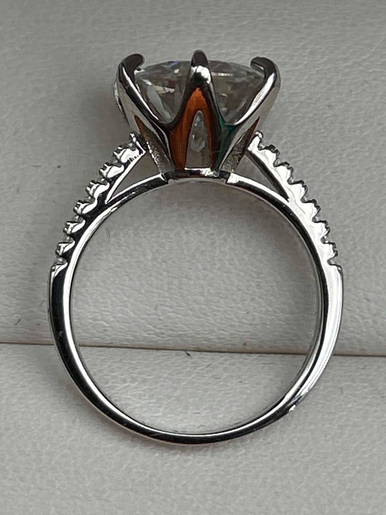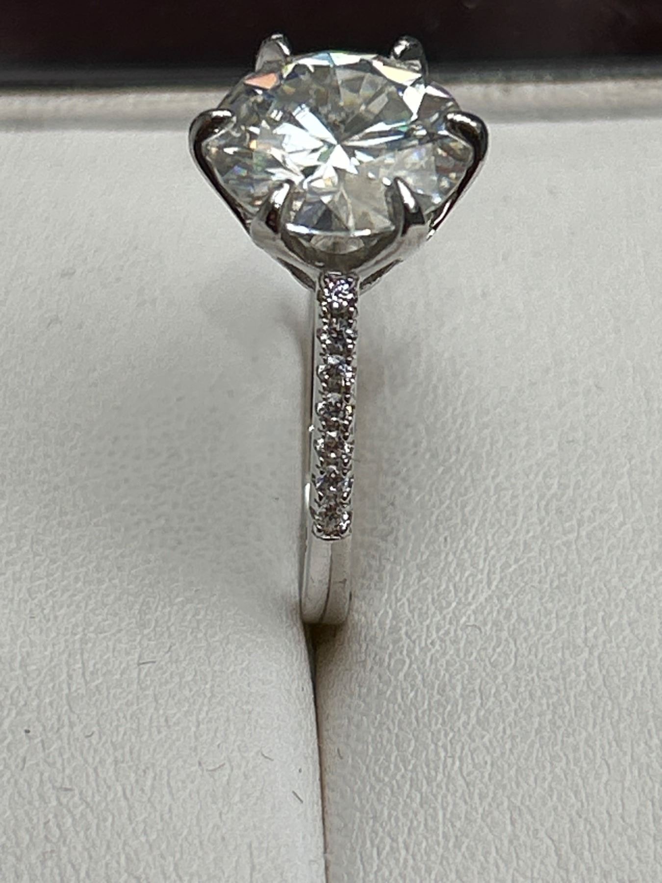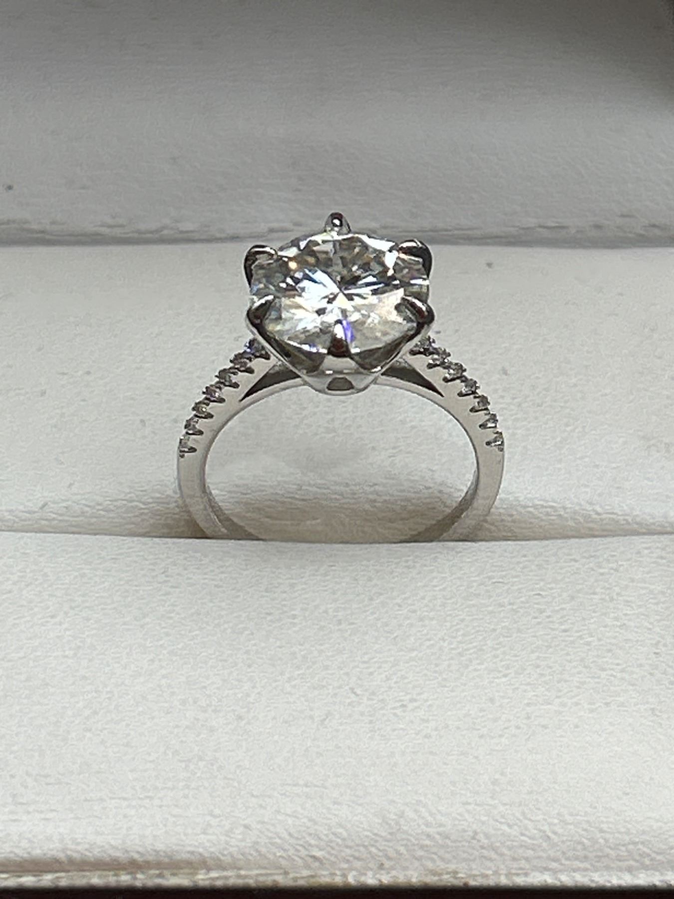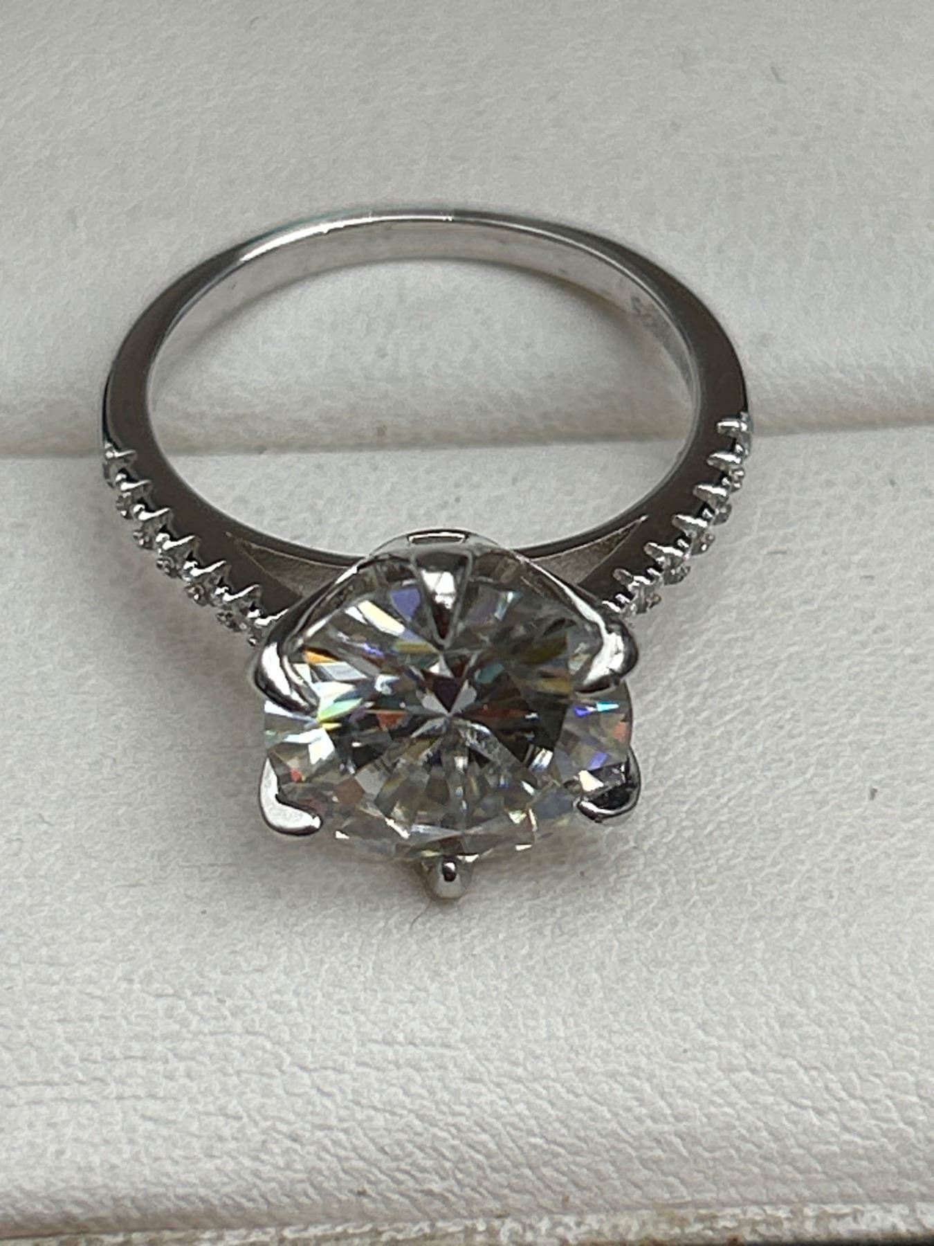 5.00 CT GRA CERTIFIED ROUND BRILLIANT CUT MOISSANITE STONE VVS D COLOR SET IN CENTER WITH 14 ROUND BRILLIANT CUT CUBIC ZIRCONIA AND SET IN SHANK SET IN 925 SILVER RING SIZE 7 RETAIL VALUE $3,145.00