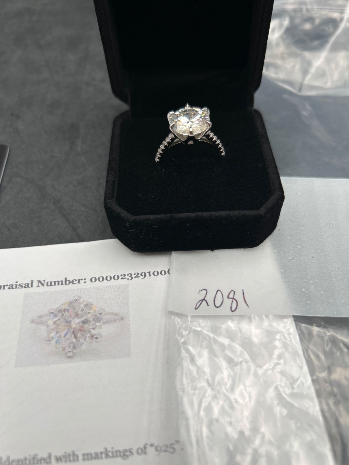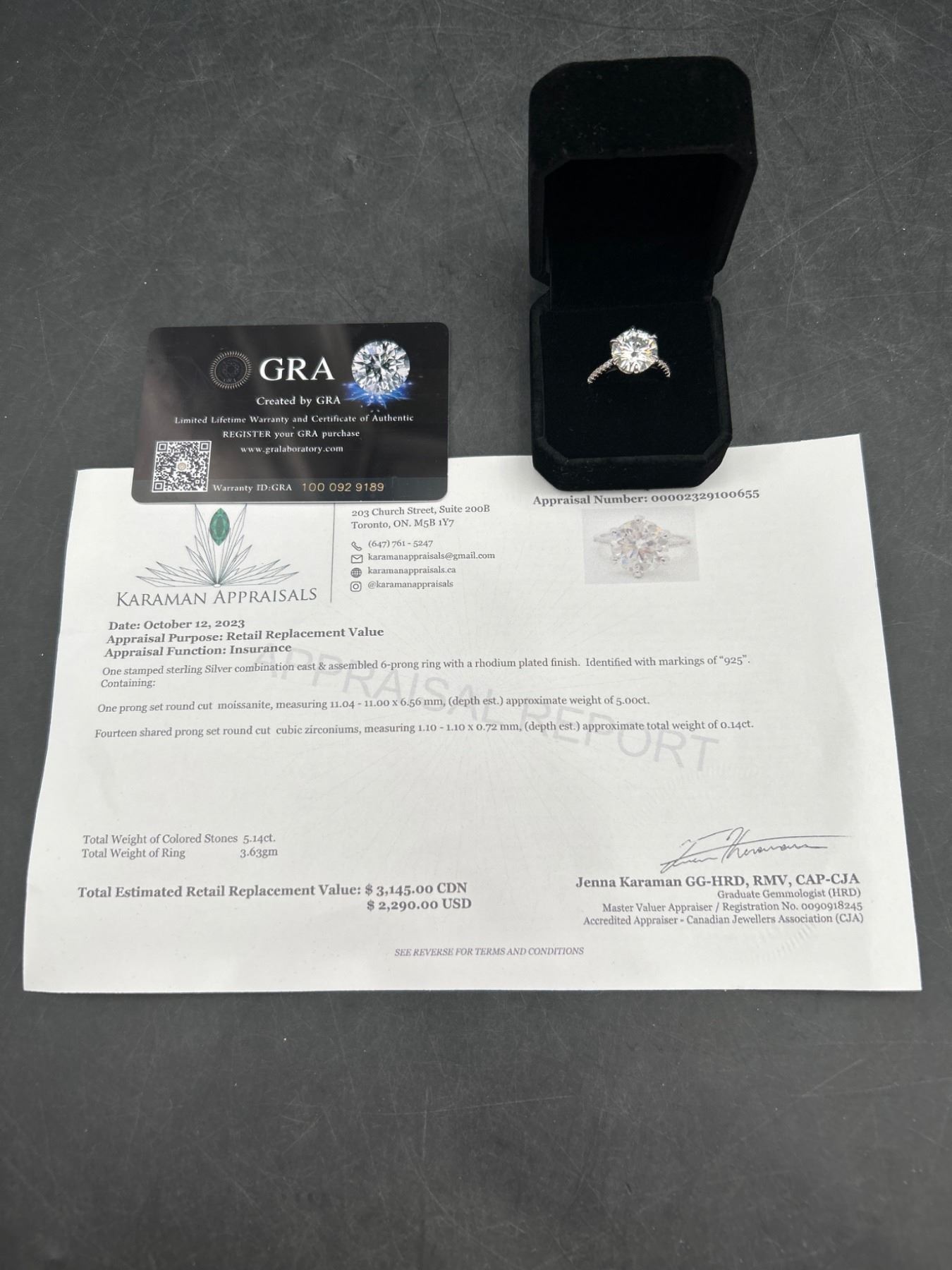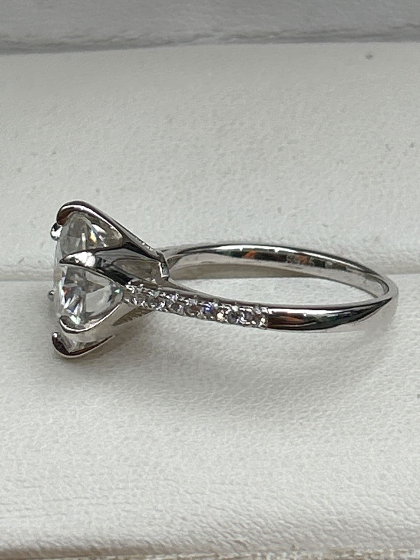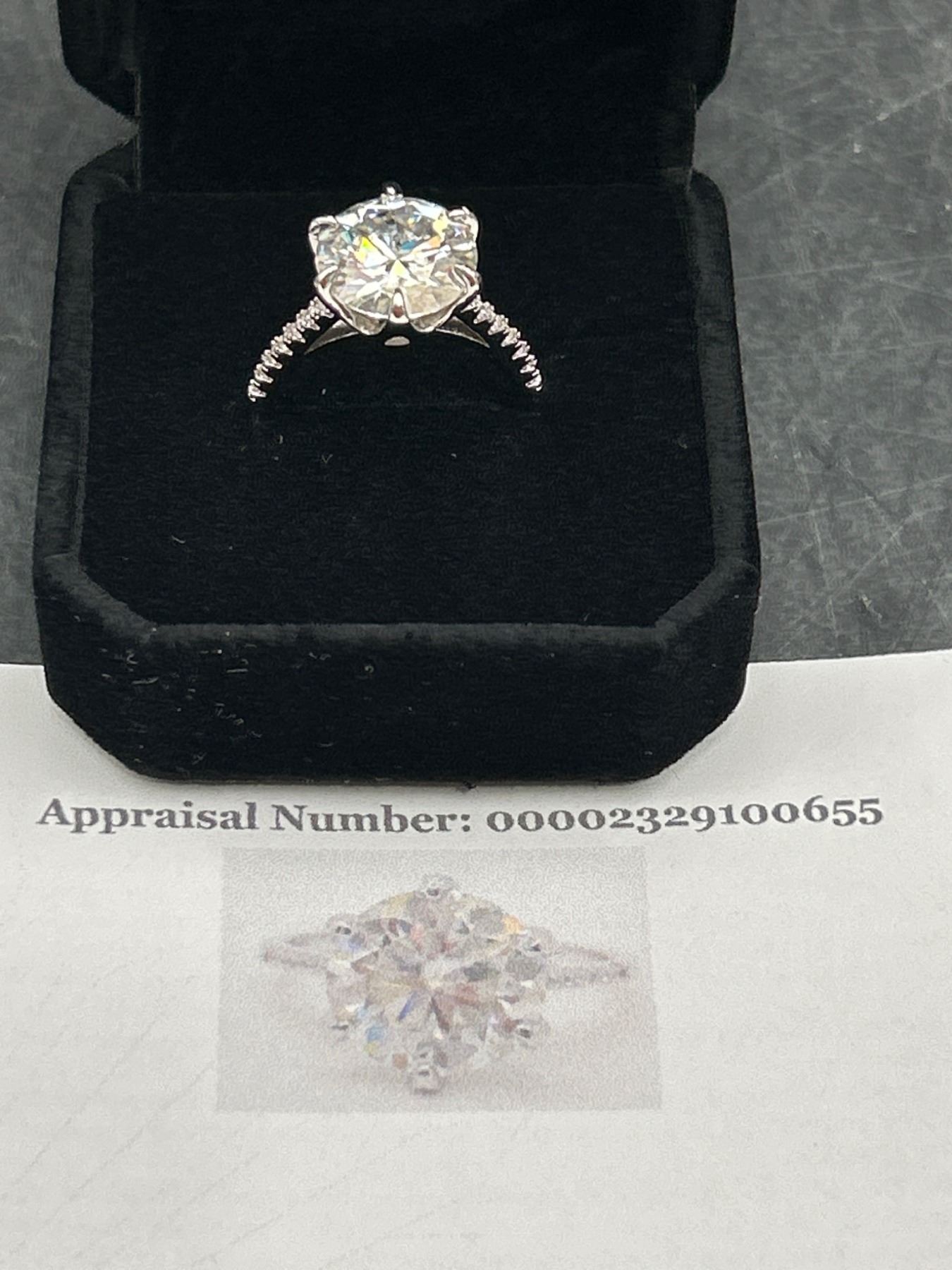 5.00 CT GRA CERTIFIED ROUND BRILLIANT CUT MOISSANITE STONE VVS D COLOR SET IN CENTER WITH 14 ROUND BRILLIANT CUT CUBIC ZIRCONIA AND SET IN SHANK SET IN 925 SILVER RING SIZE 7 RETAIL VALUE $3,145.00