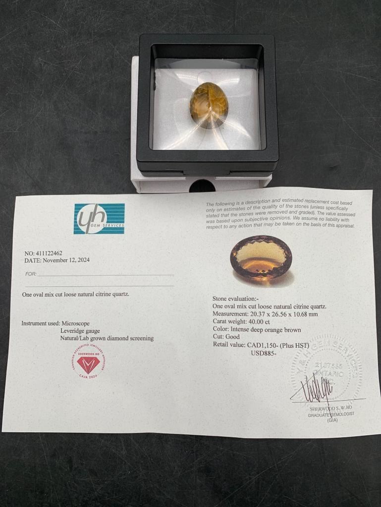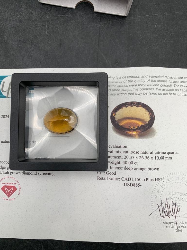 40.00 CARAT INTENSE DEEP ORANGE BROWN NATURAL CITRINE QUARTZ IN OVAL CUT 20.37 X 26.56 X 10.68 mm RETAIL VALUE $1,150.00