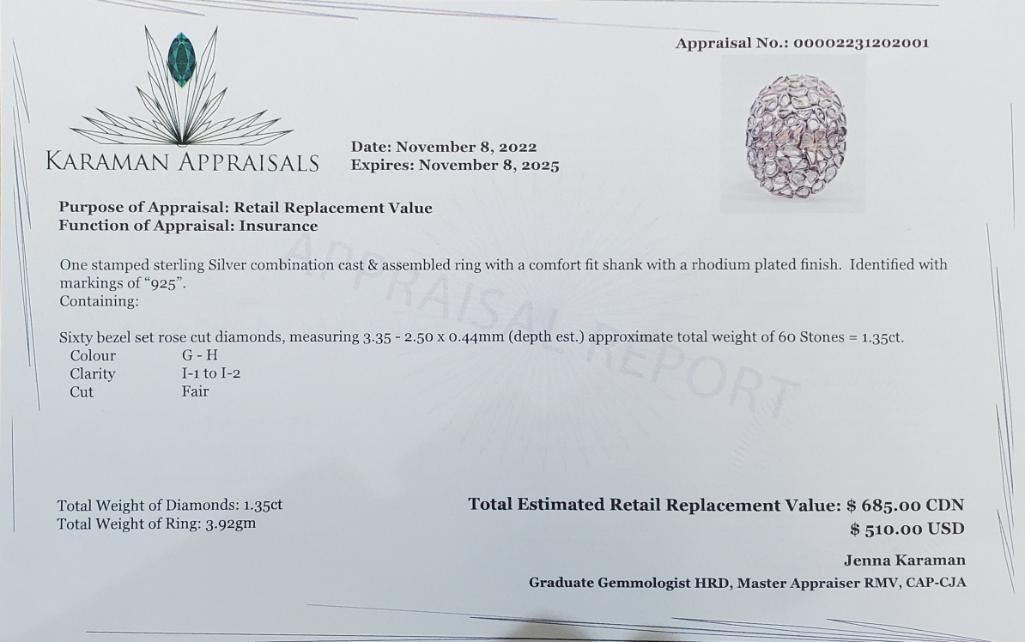 Silver Diamond (1.35ct) Rhodium Plated Ring (~weight 4.25g), Suggested Retail Value $440