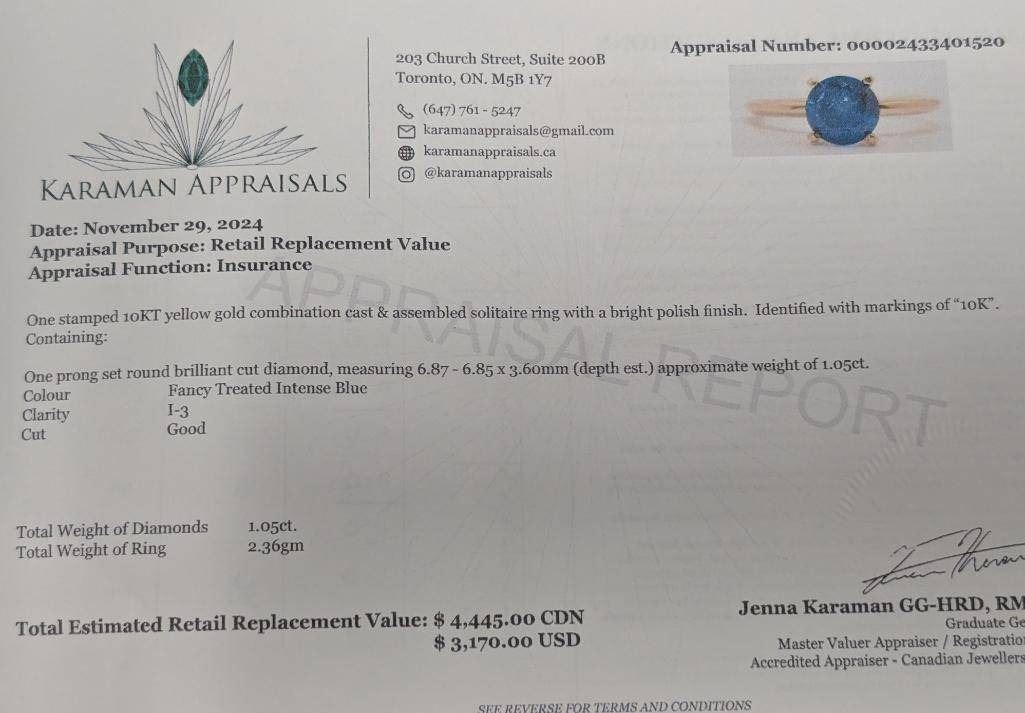 $4445, 10K(2.36g), NATURAL ENHANCE BLUE DIAMOND (1.05ct)RING, size 6.5, appraised value $4445, ring