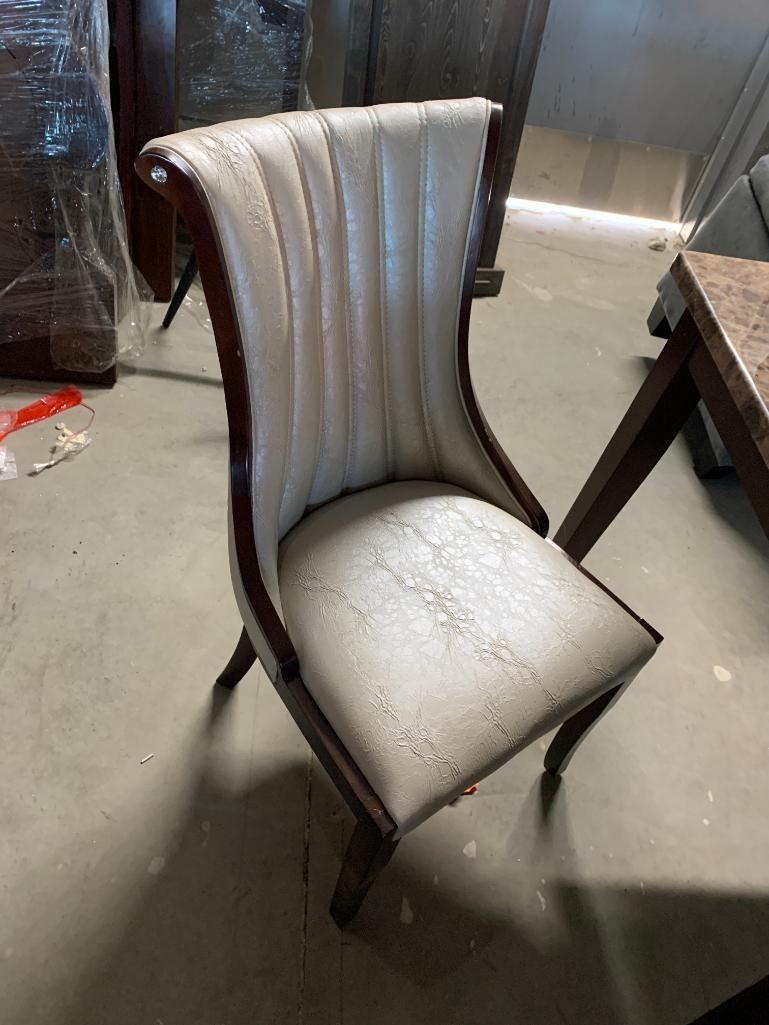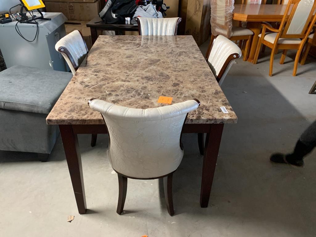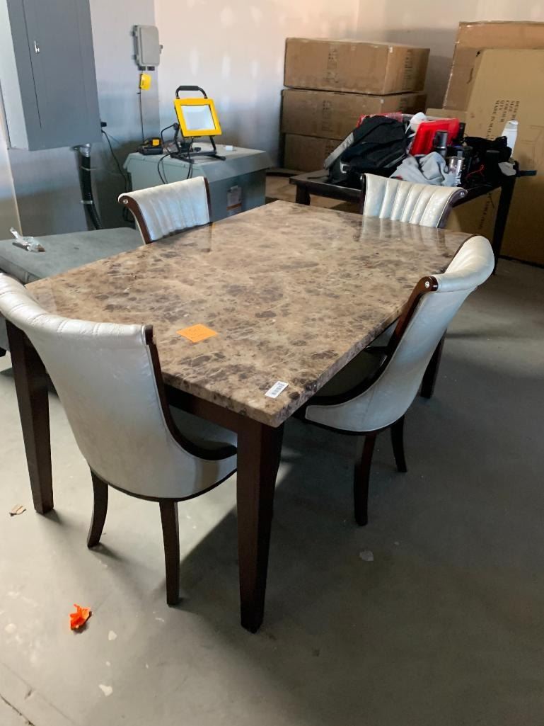 5 Piece Dinning Room Set includes Rectangle Faux Marble Table with 4 white leather style wood trimmed chairs.