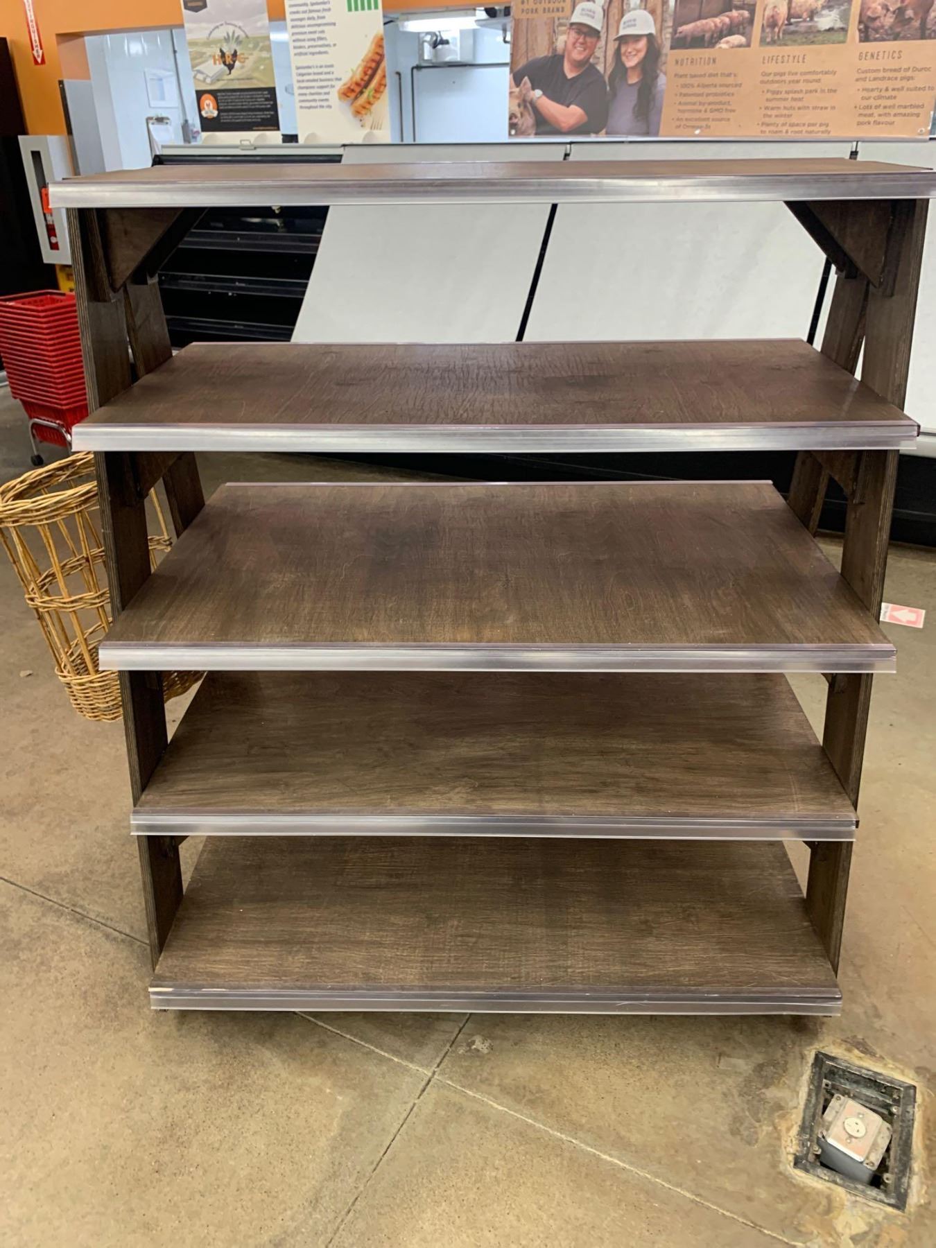 5 Shelf Wooden 2 Sided Display Shelf with Hanging Side Basket approx 4 ft wide on wheels
