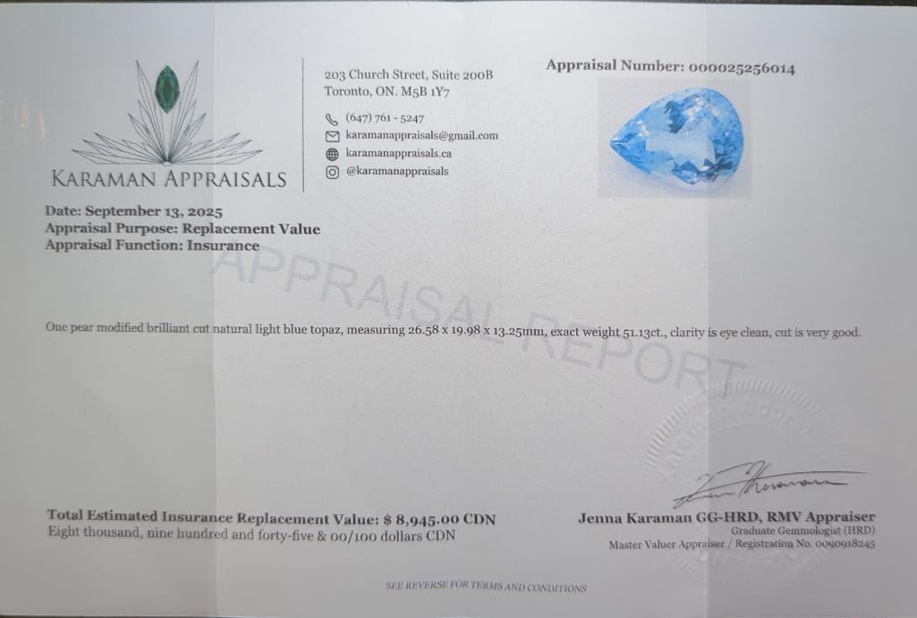51.13 ct Certified Royal Blue Topaz gemstone ($8,945 Appraisal)