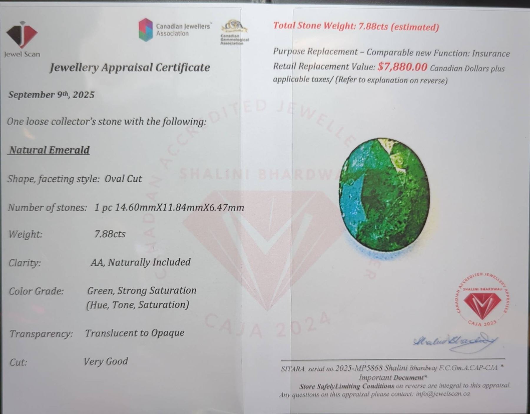 7.88 ct Certified Emerald gemstone ($7,880 Appraisal)