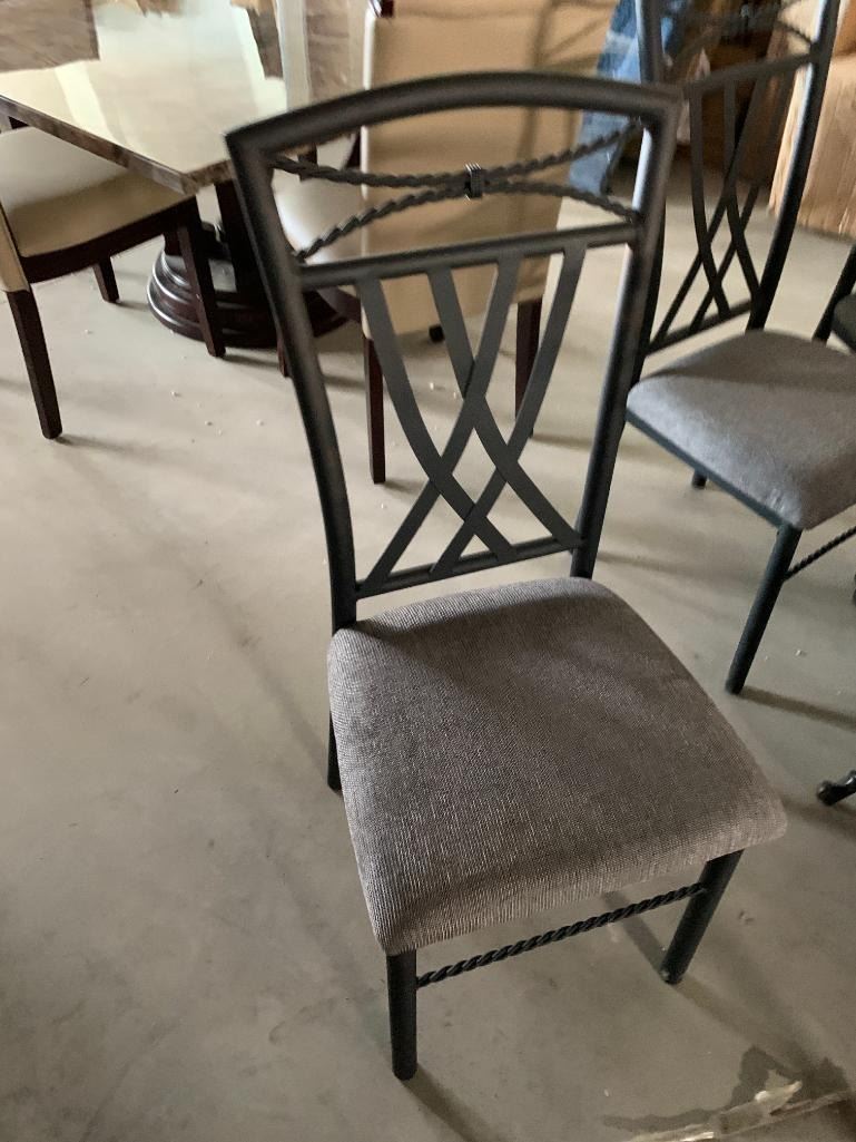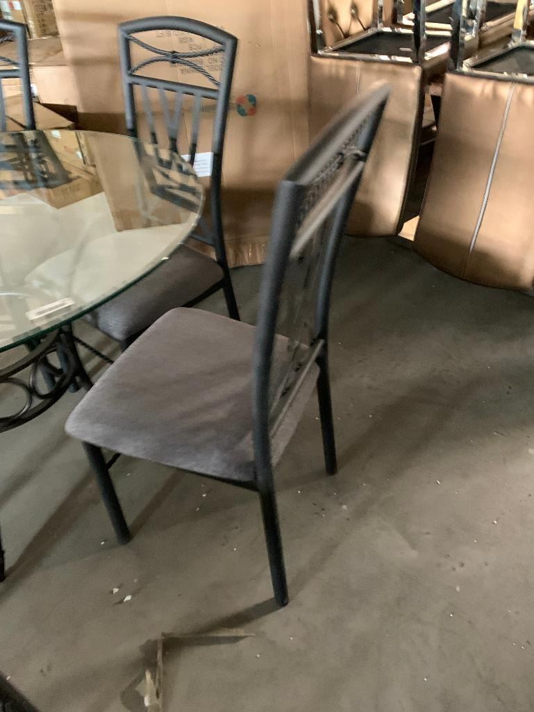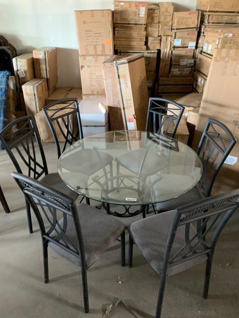 7 Piece Dinette Suite includes Round Glass top wrought iron style table with 6 matching upholstered chairs