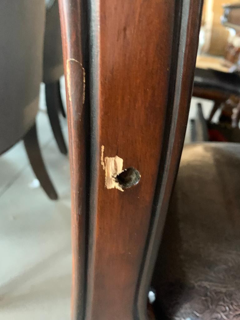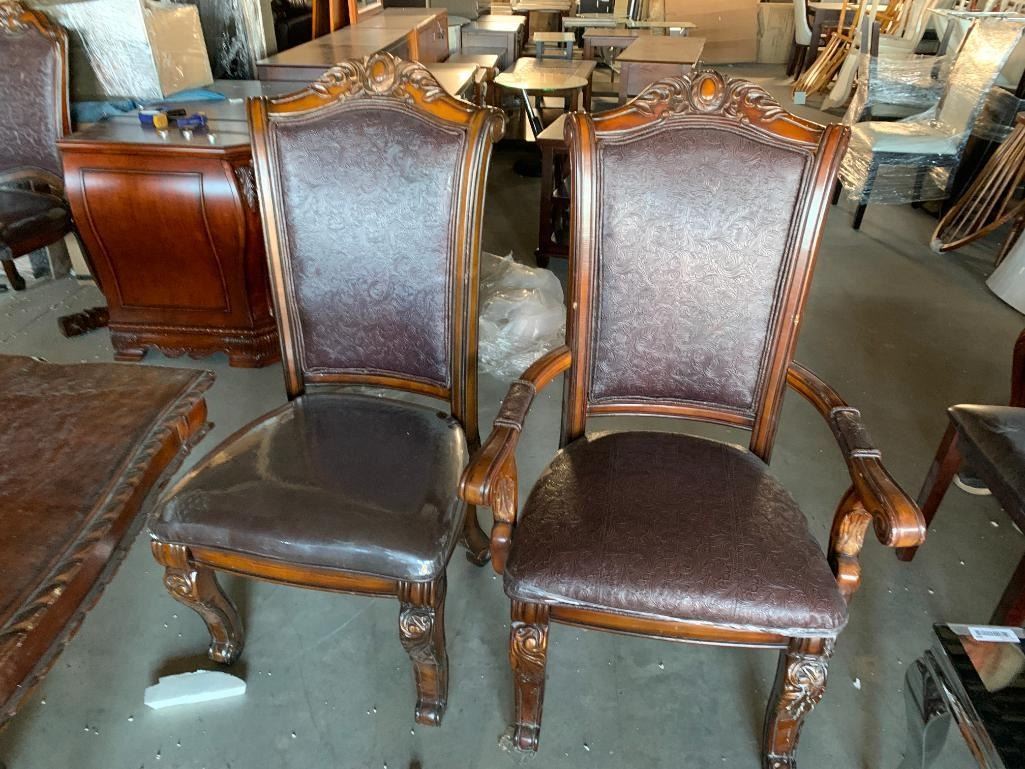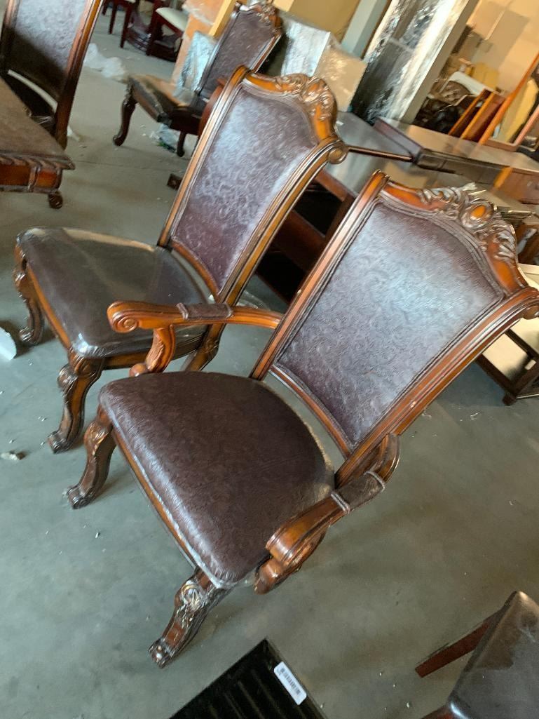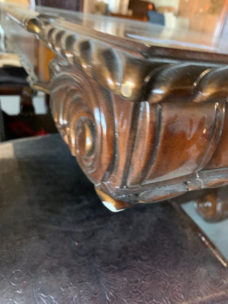 7 Piece Dinning Room suite includes large ornate walnut rectangular table and 6 matching carved wood & leather chairs