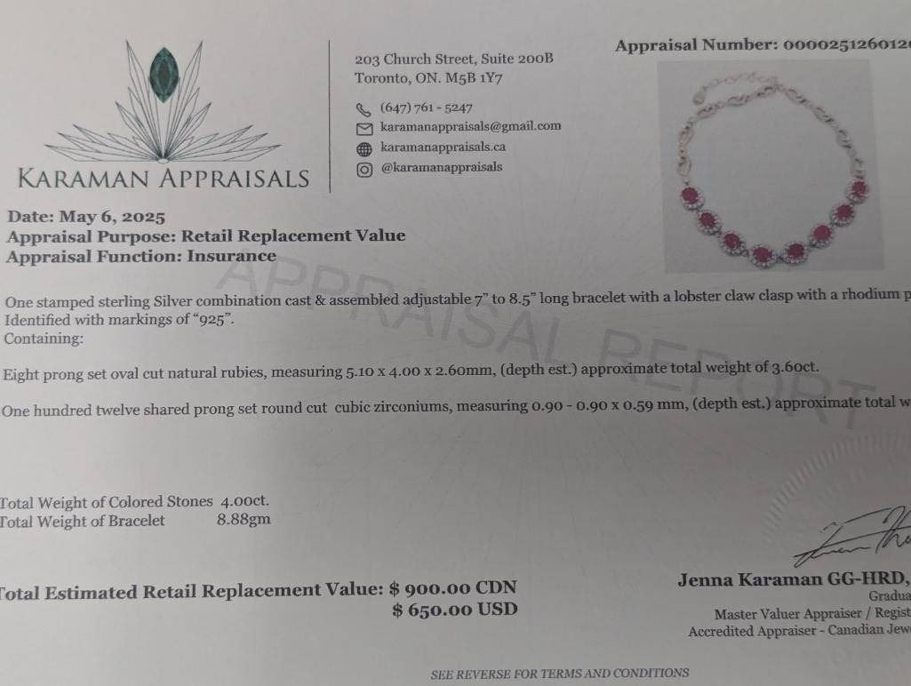 $900, SILVER(8.88g), RUBY (4ct)BRACELET 7-8″, appraised value $900