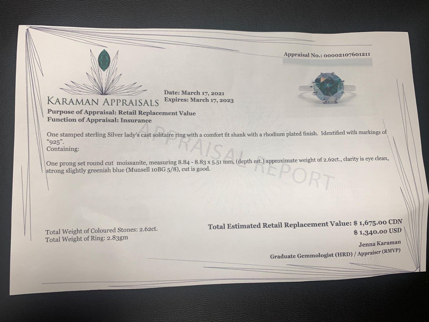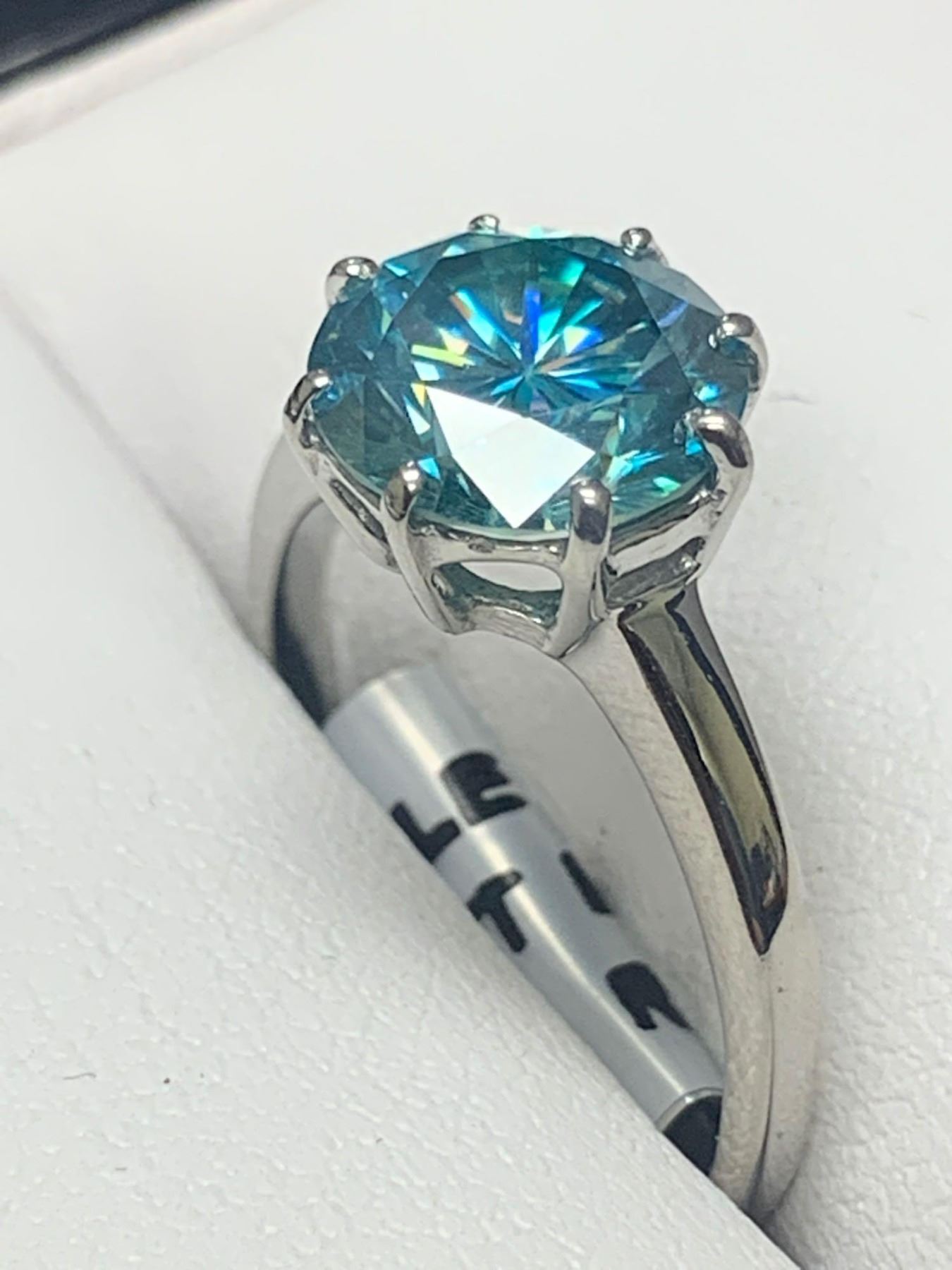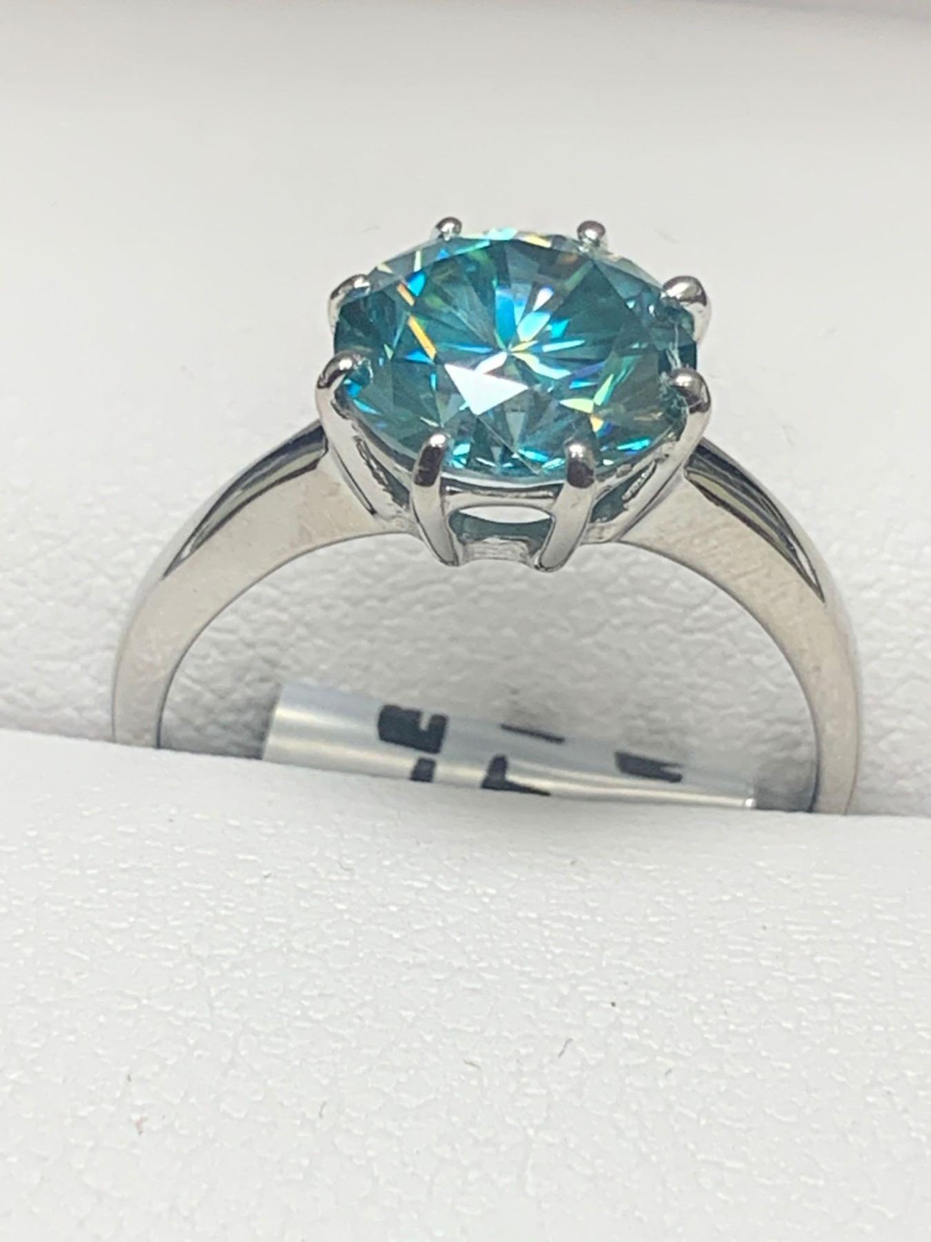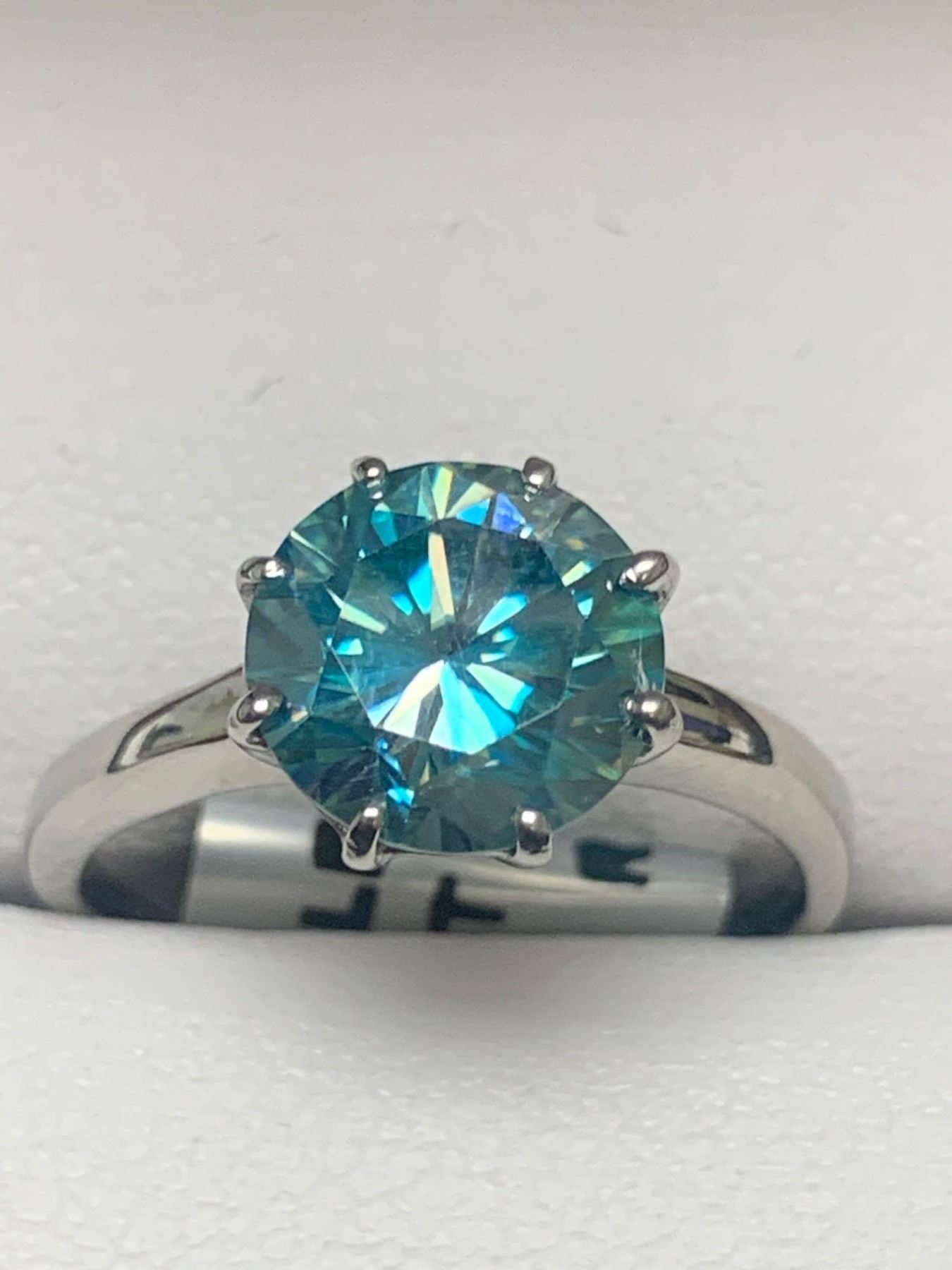 925 Silver Rhodium Plated ladies 2.62 Carat Solitaire ring green.blue moissanite gemstone with appraisal report $1675.00