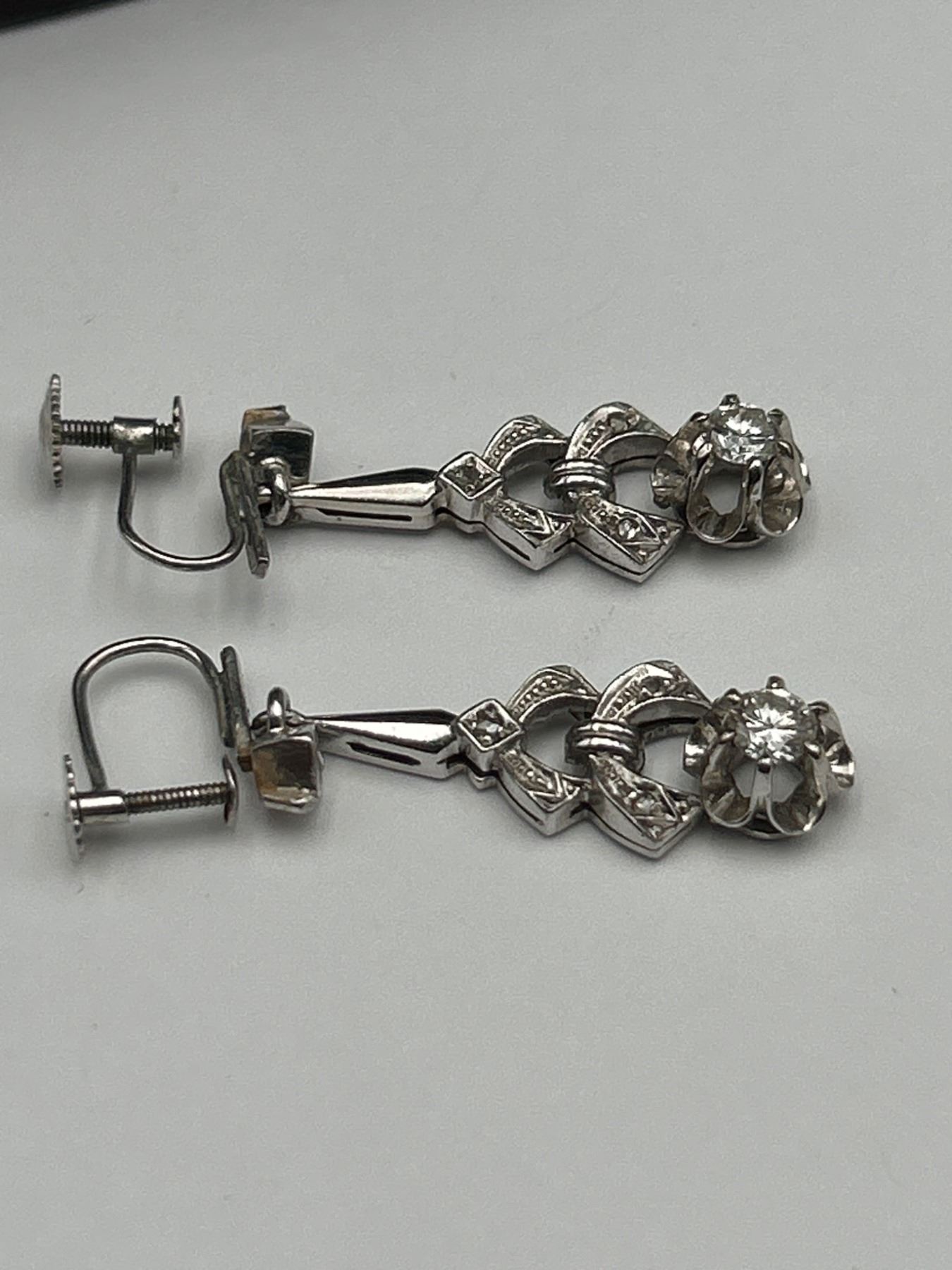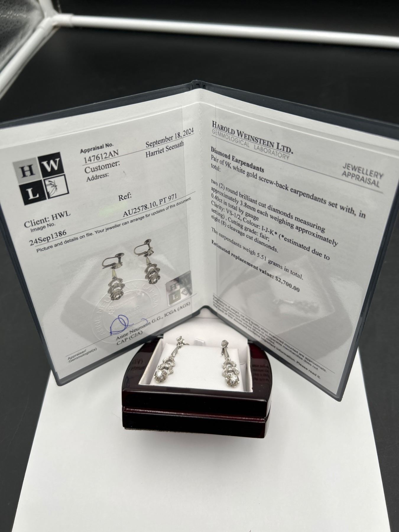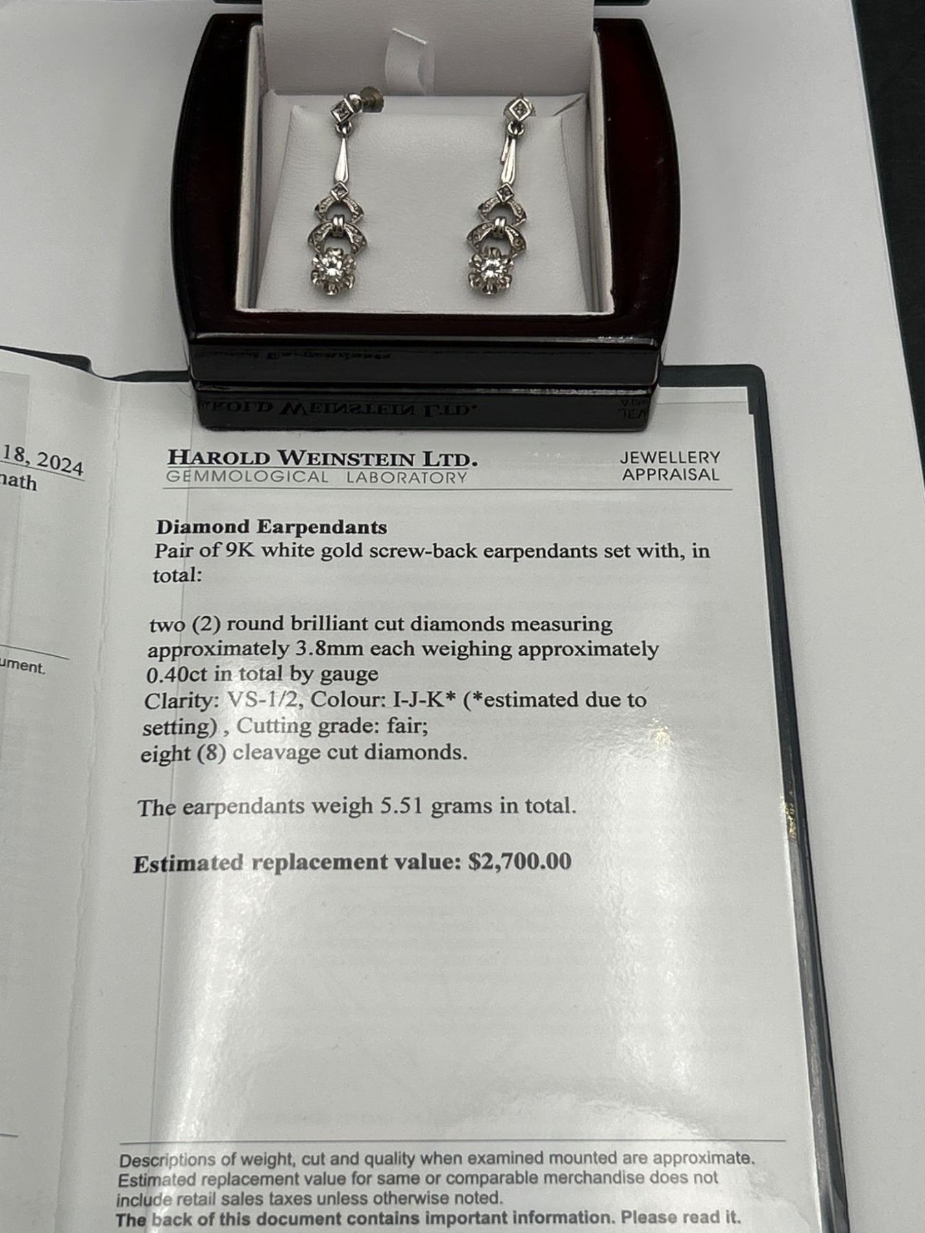 This listing offers a pair of 9K white gold screw-back earrings set with two round brilliant cut diamonds. Each diamond weighs approximately 0.40ct, with estimated clarity of VS-1/VS-2 and color range I-J-K. The total combined weight of the diamonds is 0.80ct. The earrings have a total weight of 5.51 grams, and the craftsmanship includes intricate detailing. An appraisal document dated September 18, 2024, estimates the replacement value at $2,700. These earrings are presented in pristine condition.