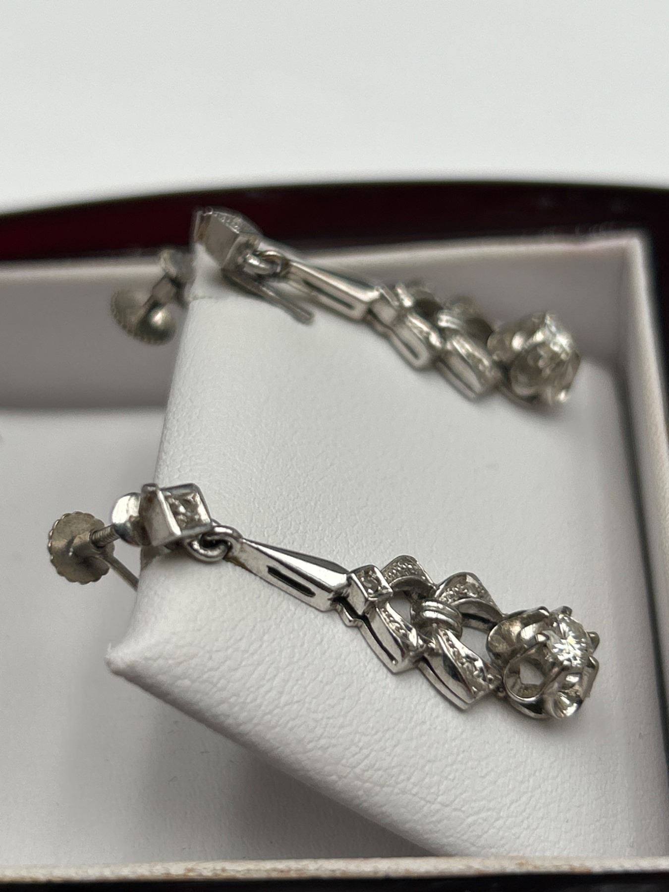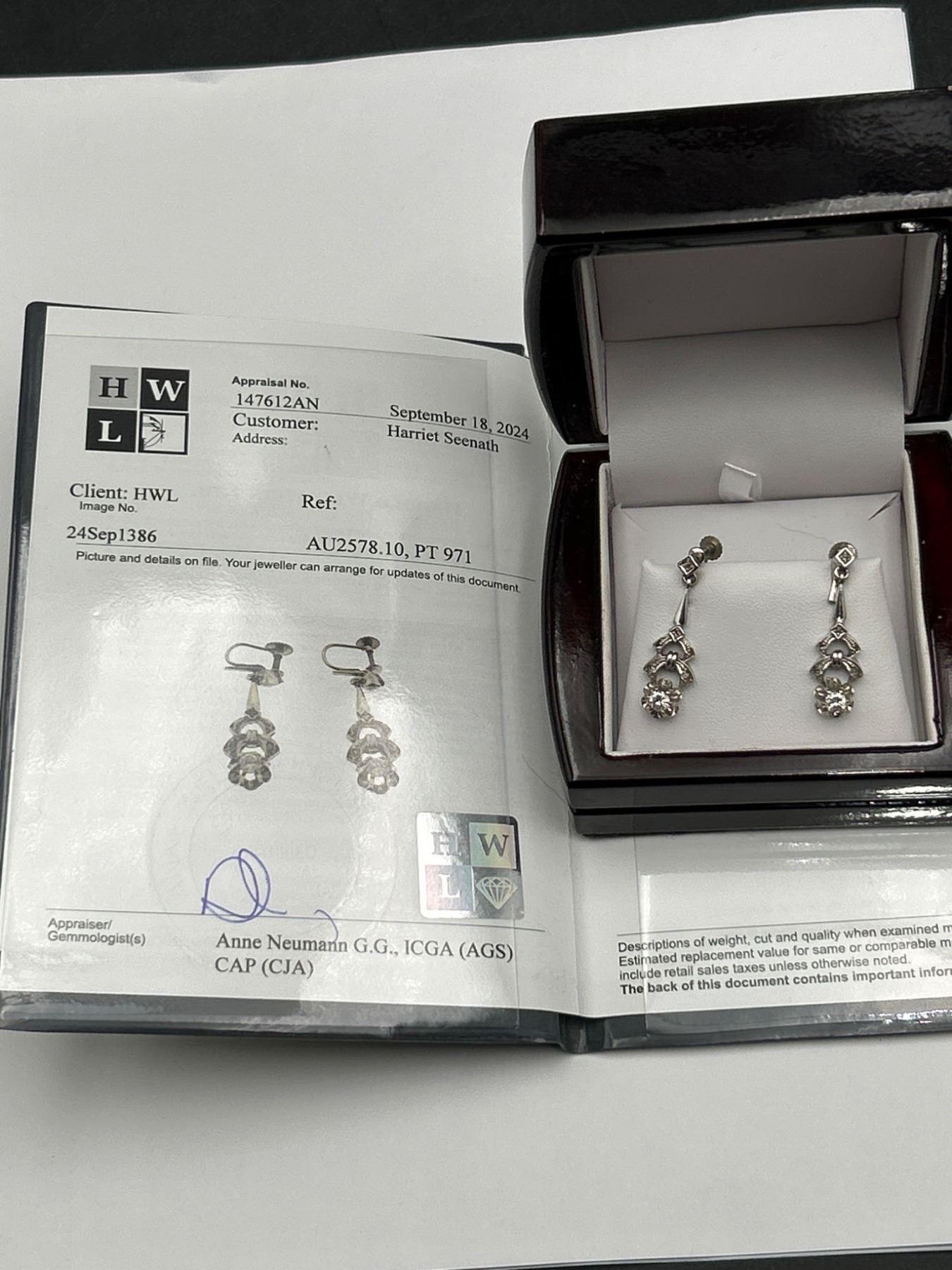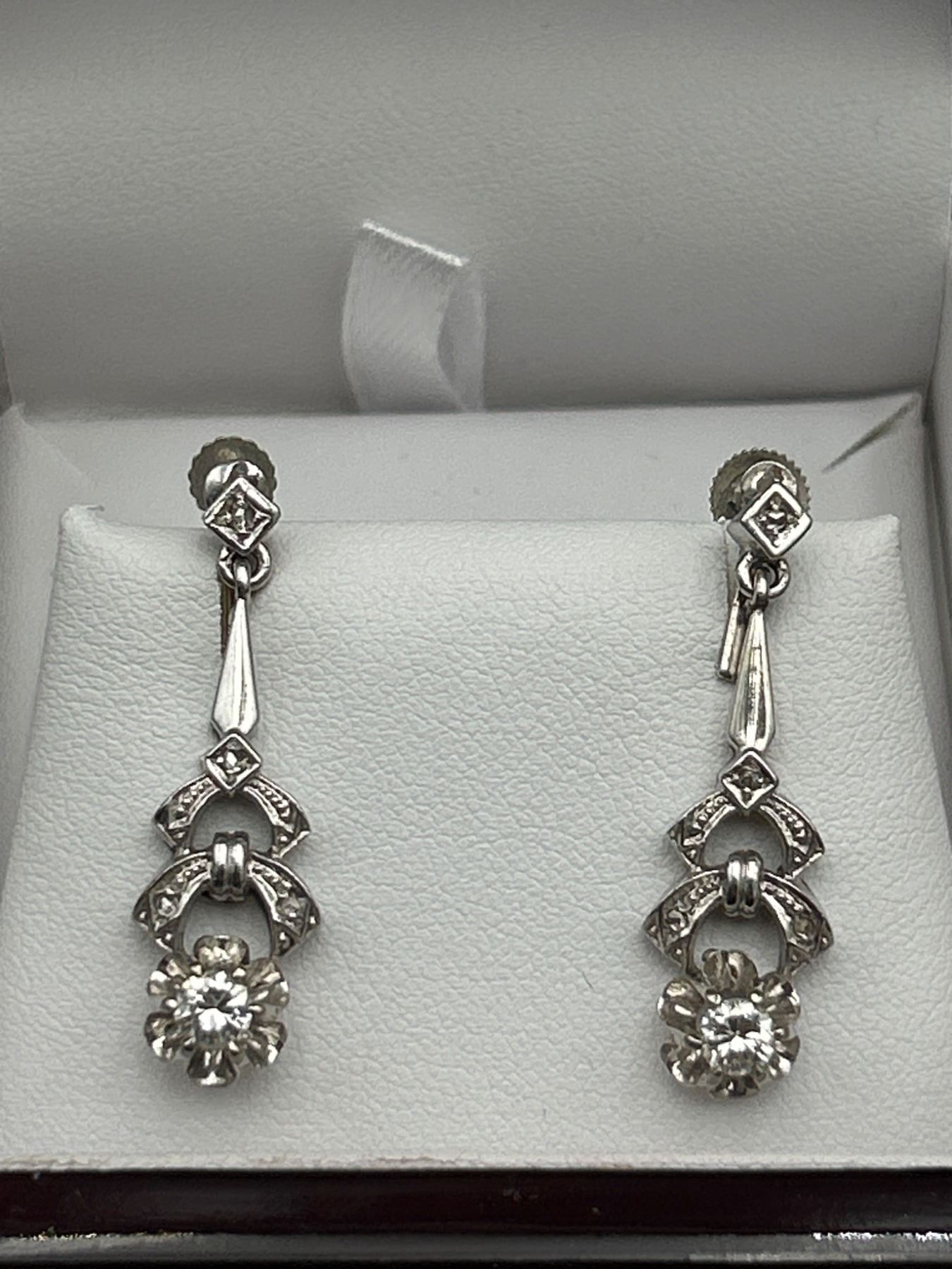 This listing offers a pair of 9K white gold screw-back earrings set with two round brilliant cut diamonds. Each diamond weighs approximately 0.40ct, with estimated clarity of VS-1/VS-2 and color range I-J-K. The total combined weight of the diamonds is 0.80ct. The earrings have a total weight of 5.51 grams, and the craftsmanship includes intricate detailing. An appraisal document dated September 18, 2024, estimates the replacement value at $2,700. These earrings are presented in pristine condition.