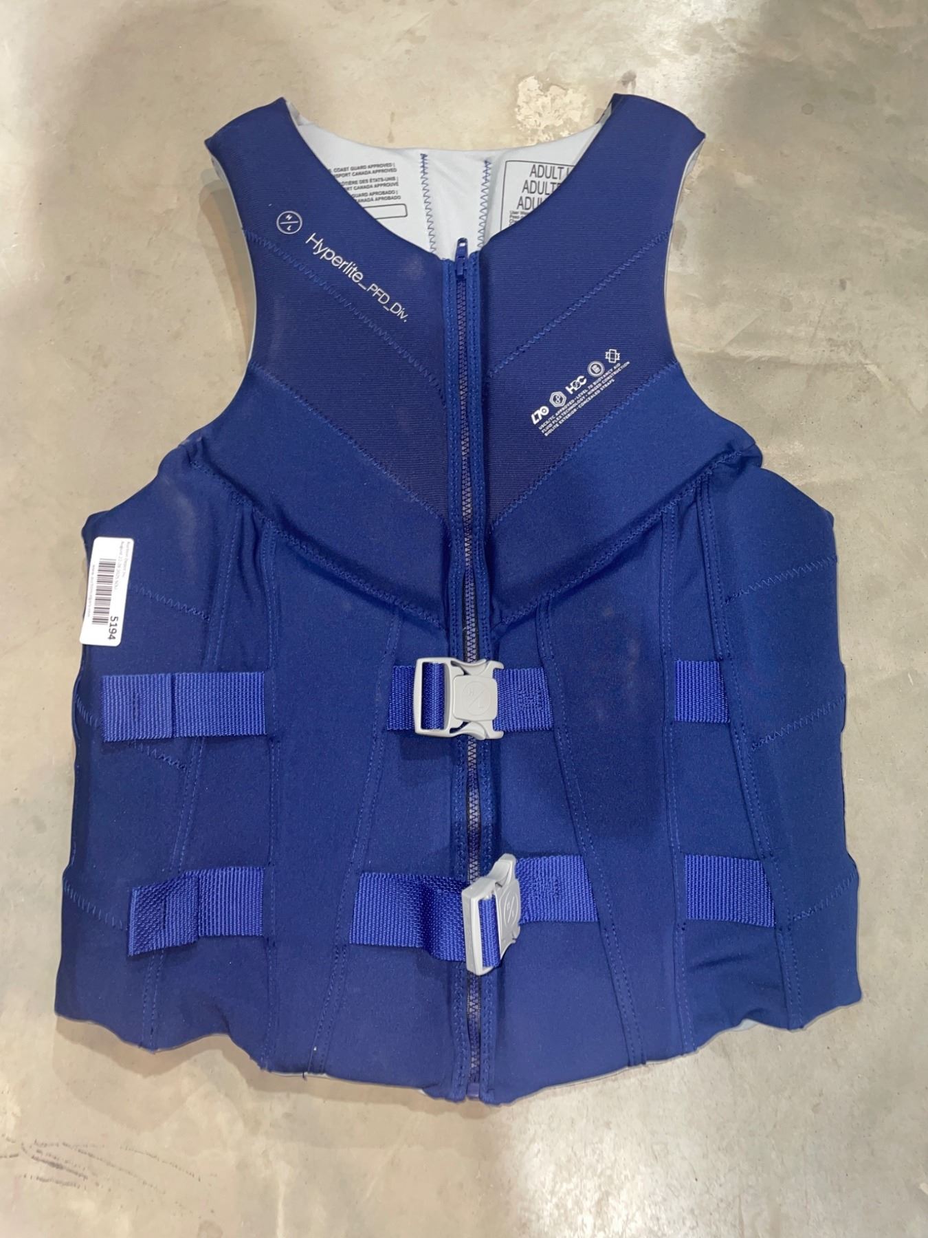 Hyperlite IND life vest, designed for men. Features include dual buckle closures and a front zipper for secure fitting. Provides optimal flotation for water activities. The model is crafted with durable materials and advanced design features for reliability.
