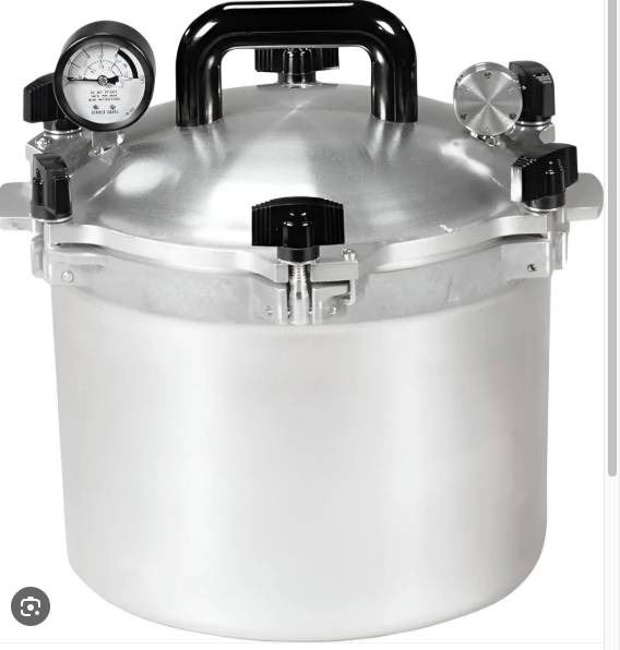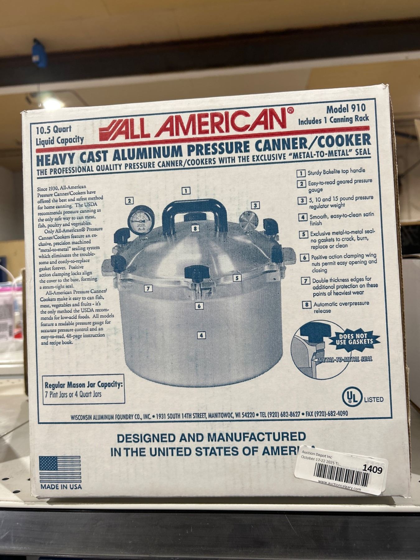All American Model 910 Heavy Cast Aluminum Pressure Canner/Cooker with a total capacity of 10.5 quarts. Professionally engineered with a metal-to-metal seal system and includes a canning rack for effective canning and cooking. Made in the United States and UL-listed for compliance. Designed for safe and efficient use in food preparation and preservation.