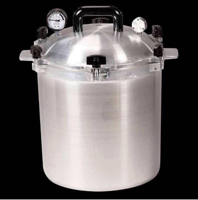 All American 25 Quart Heavy Cast Aluminum Pressure Cooker/Canner, Model 925. Features a precision machined metal-to-metal sealing system with no gaskets. Includes automatic overpressure release, exclusive metal clamping locks, and geared steam gauge. Made in the USA and UL Listed. Designed for home canning and large batch cooking. Measures 17.75 in diameter and 19.5 in height.