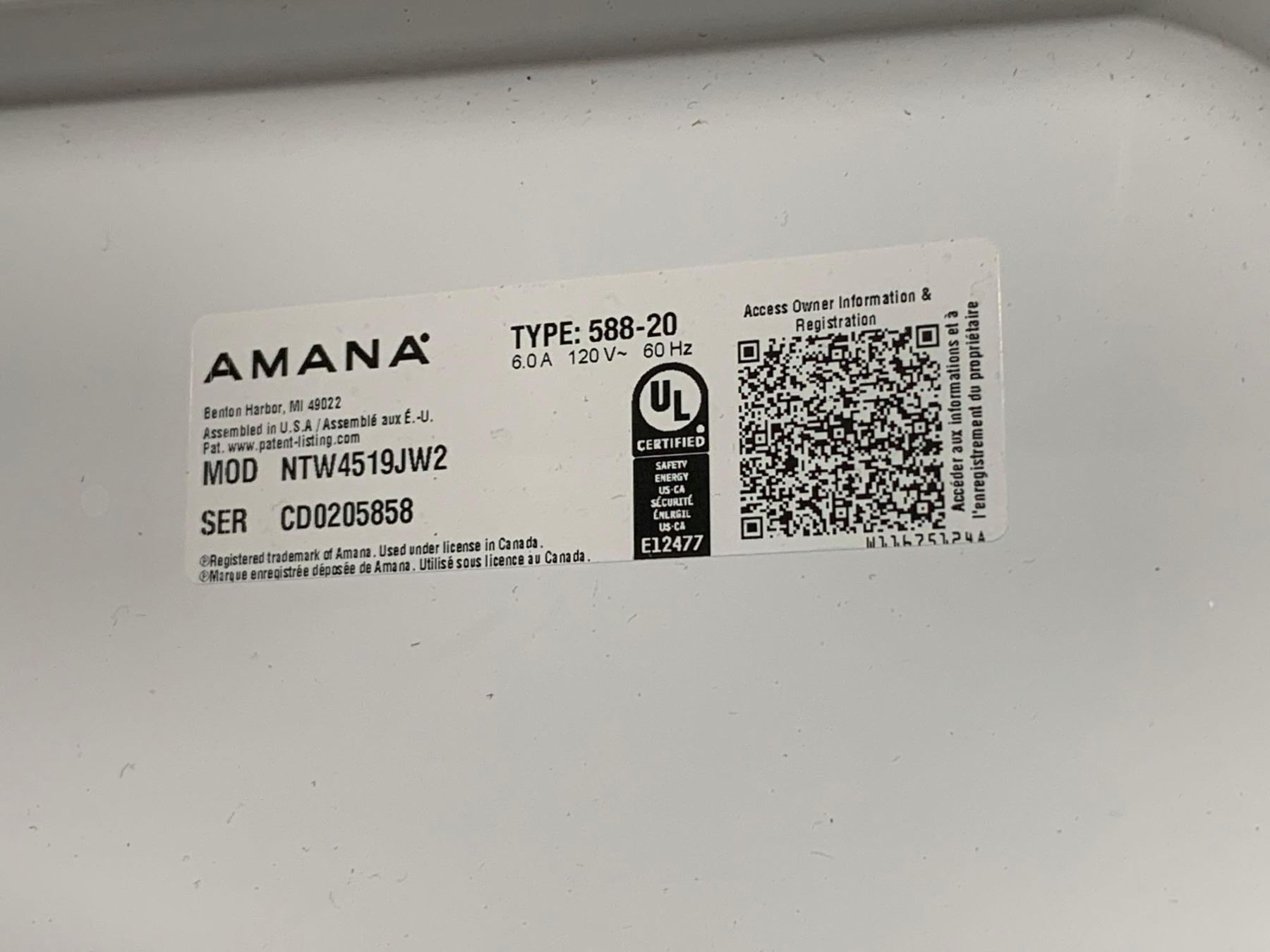 Amana top load washing machine. Model number NTW4519JW2