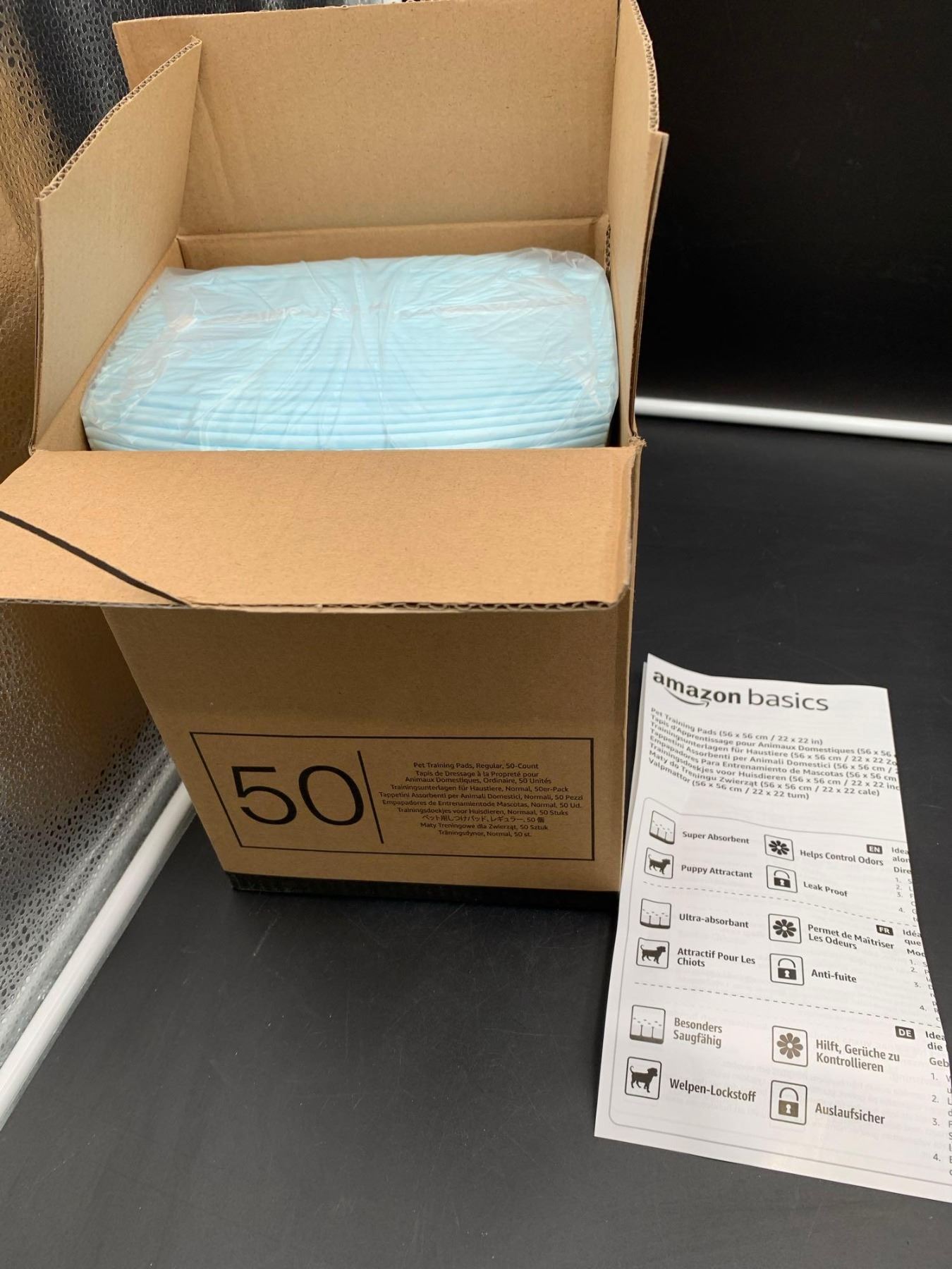Amazon Basics Dog and Puppy Pads, Leak-proof 5-Layer Pee Pads with Quick-dry Surface for Potty Training, Regular (22 x 22 Inches) - Pack of 50