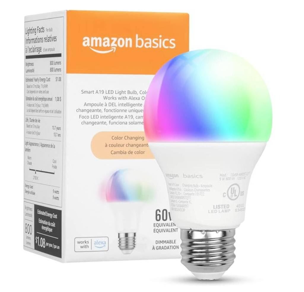 Amazon Basics Smart A19 LED Light Bulb, Color Changing, 60W Equivalent