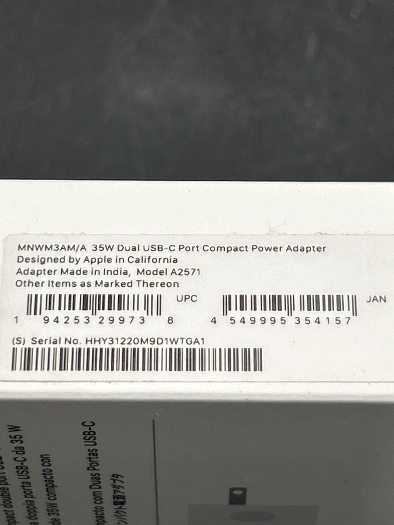 Apple 35W Dual USB-C Port Compact Power Adapter, Model A2571