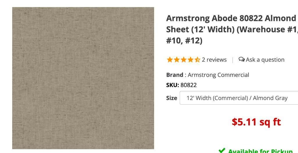 Armstrong Abode Rough Linen Vinyl Sheet Flooring , 15 year Residential, .08 inch, Almond Grey, 12 ft width, NEW FULL ROLL of 630 SQUARE FEET