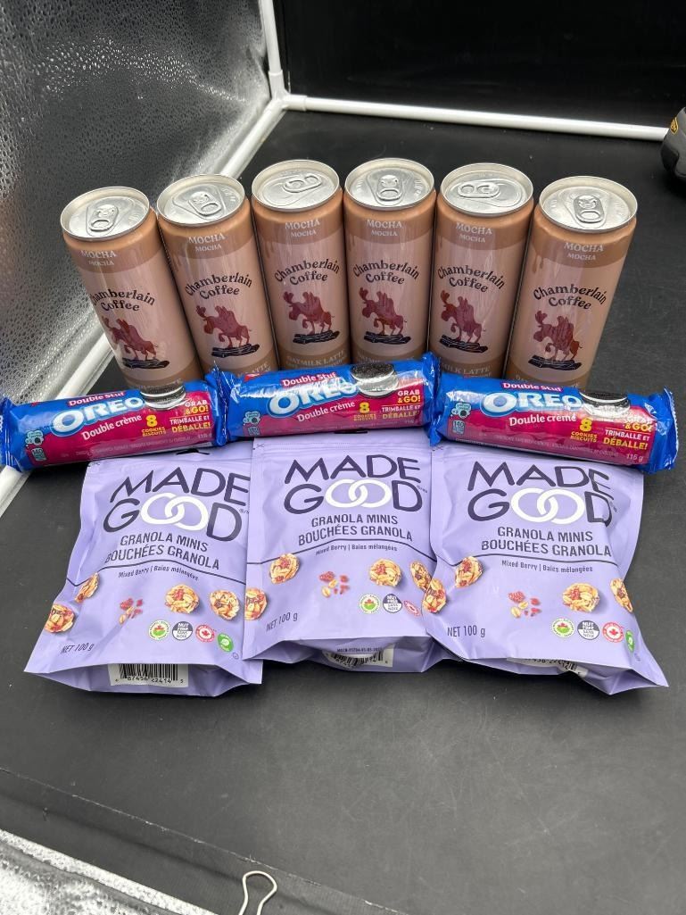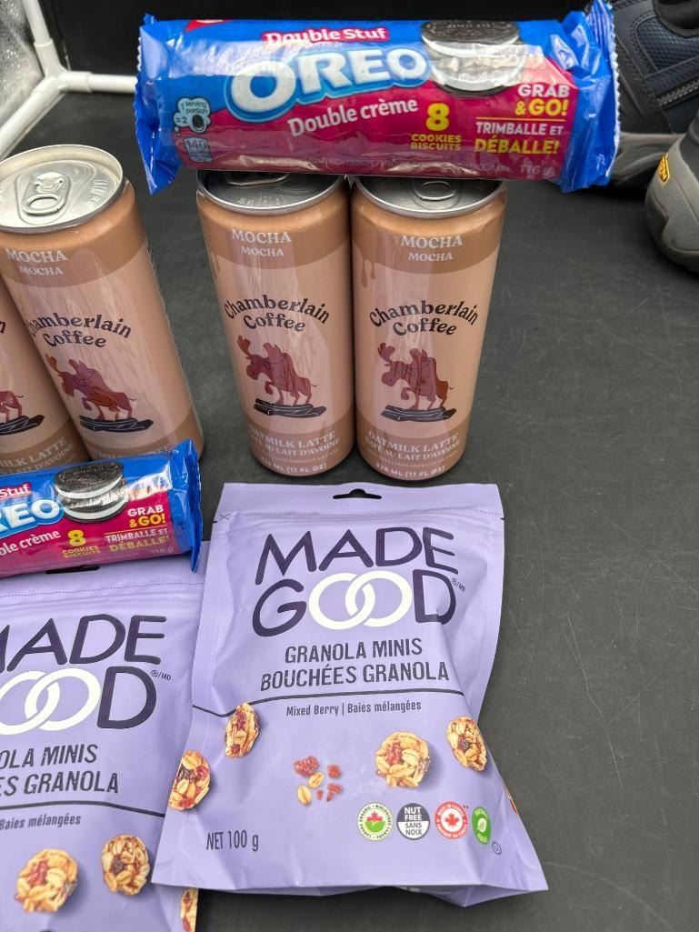 Assorted Snack Lot With Chamberlain Coffee Cans, Oreo Packs, and Made Good Granola Minis