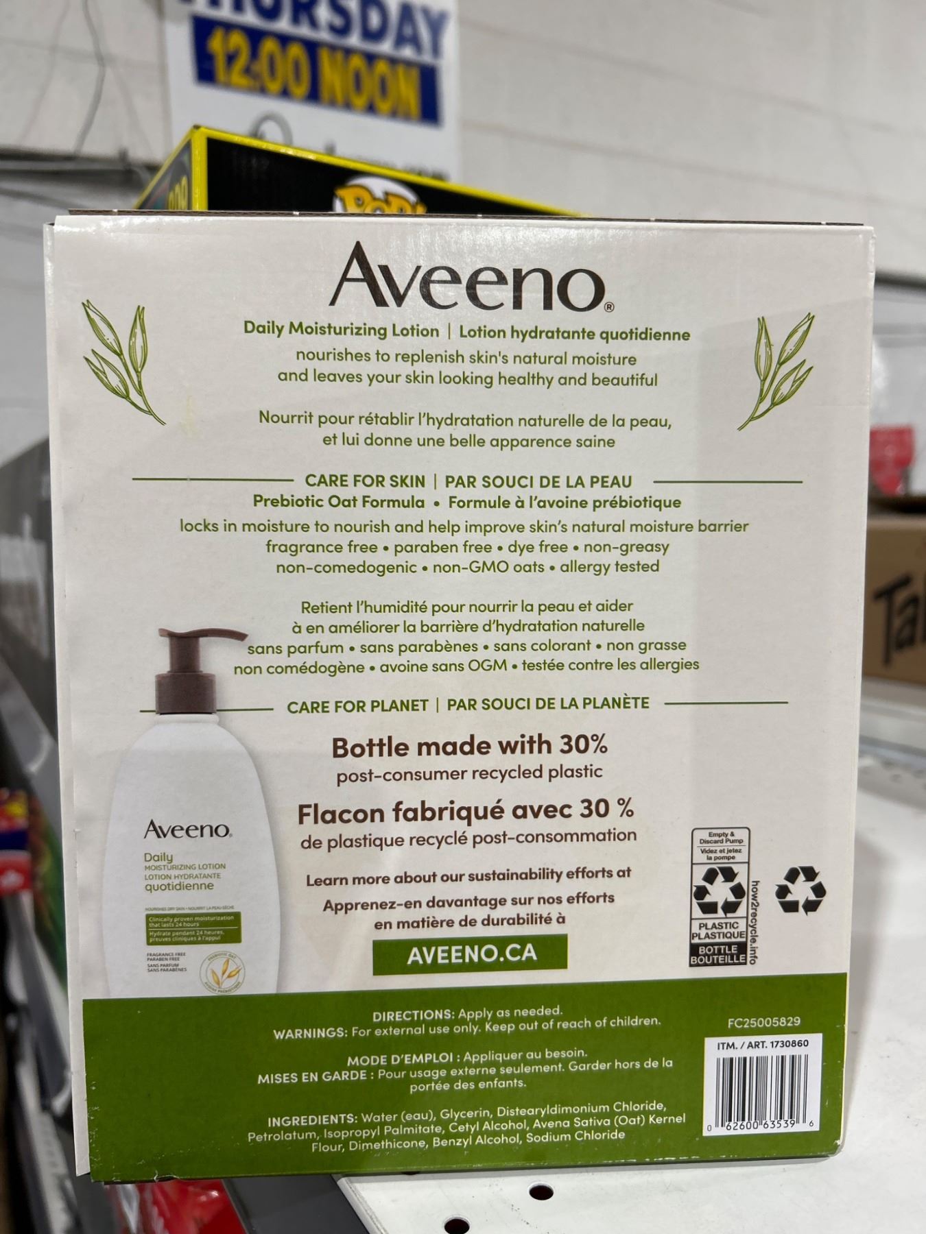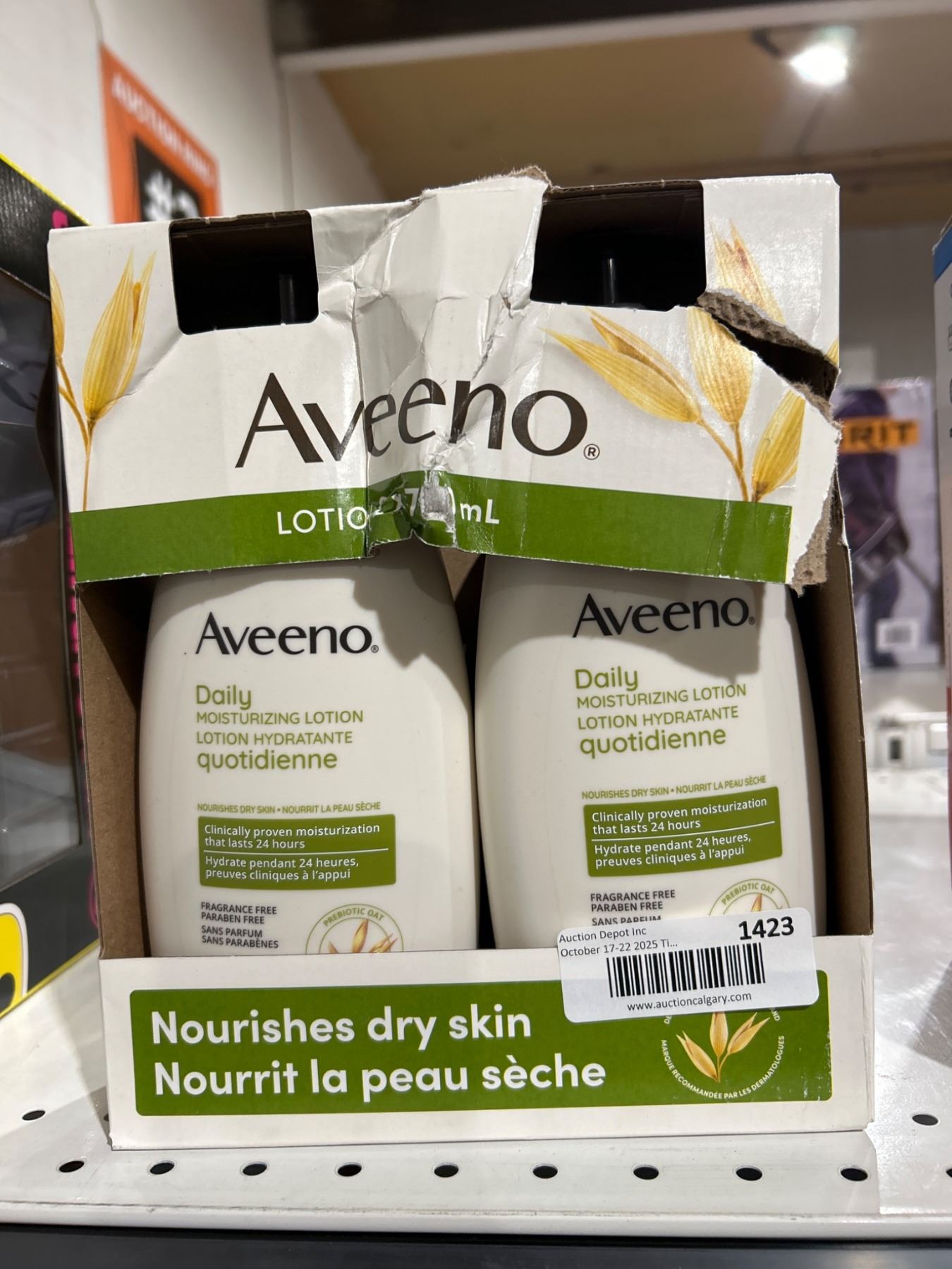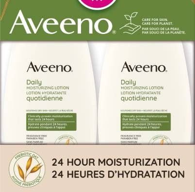 This is a two-pack of Aveeno Daily Moisturizing Lotion, each containing 532 mL. The lotion is formulated to help nourish dry skin and is made with a special oat formula. The bottles are made with 30 percent post-consumer recycled plastic. Suitable for daily use, product details and care instructions are printed on the reverse of the item.