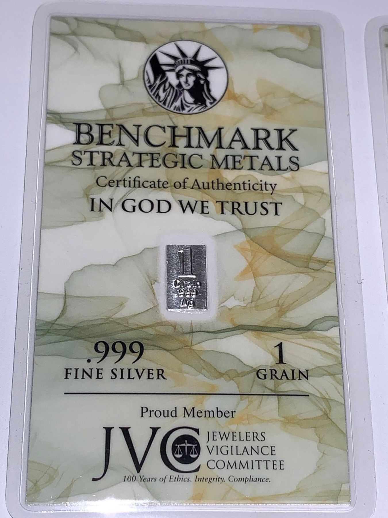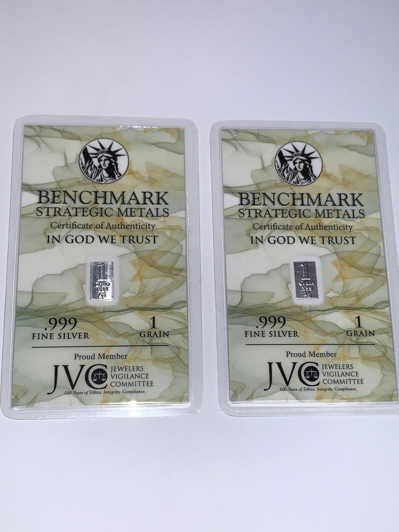 Benchmark Strategic Metal . 1 grain .999 Pure Silver Wafer Bars - Lot of 2