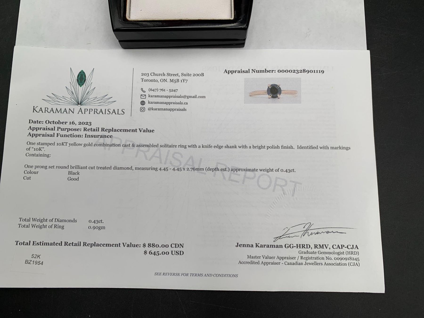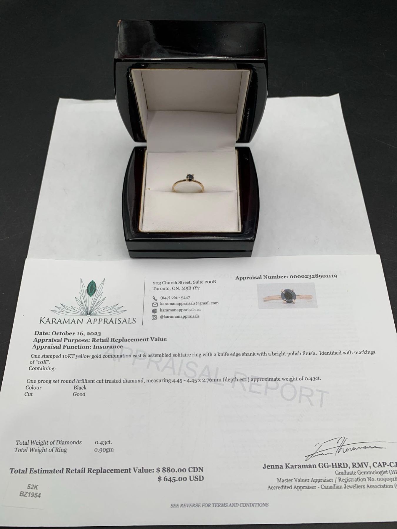 Black Diamond .43 Carat Round Cut Solitaire 10K Gold with appraisal Value $880.00