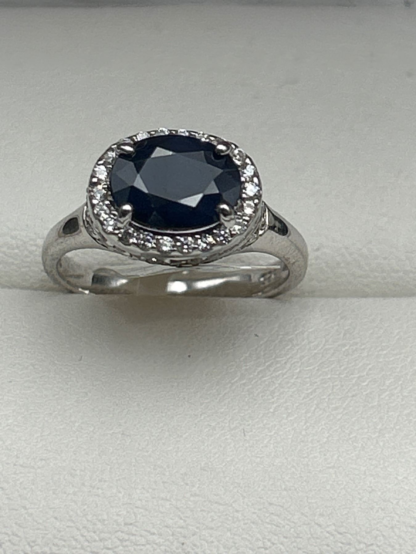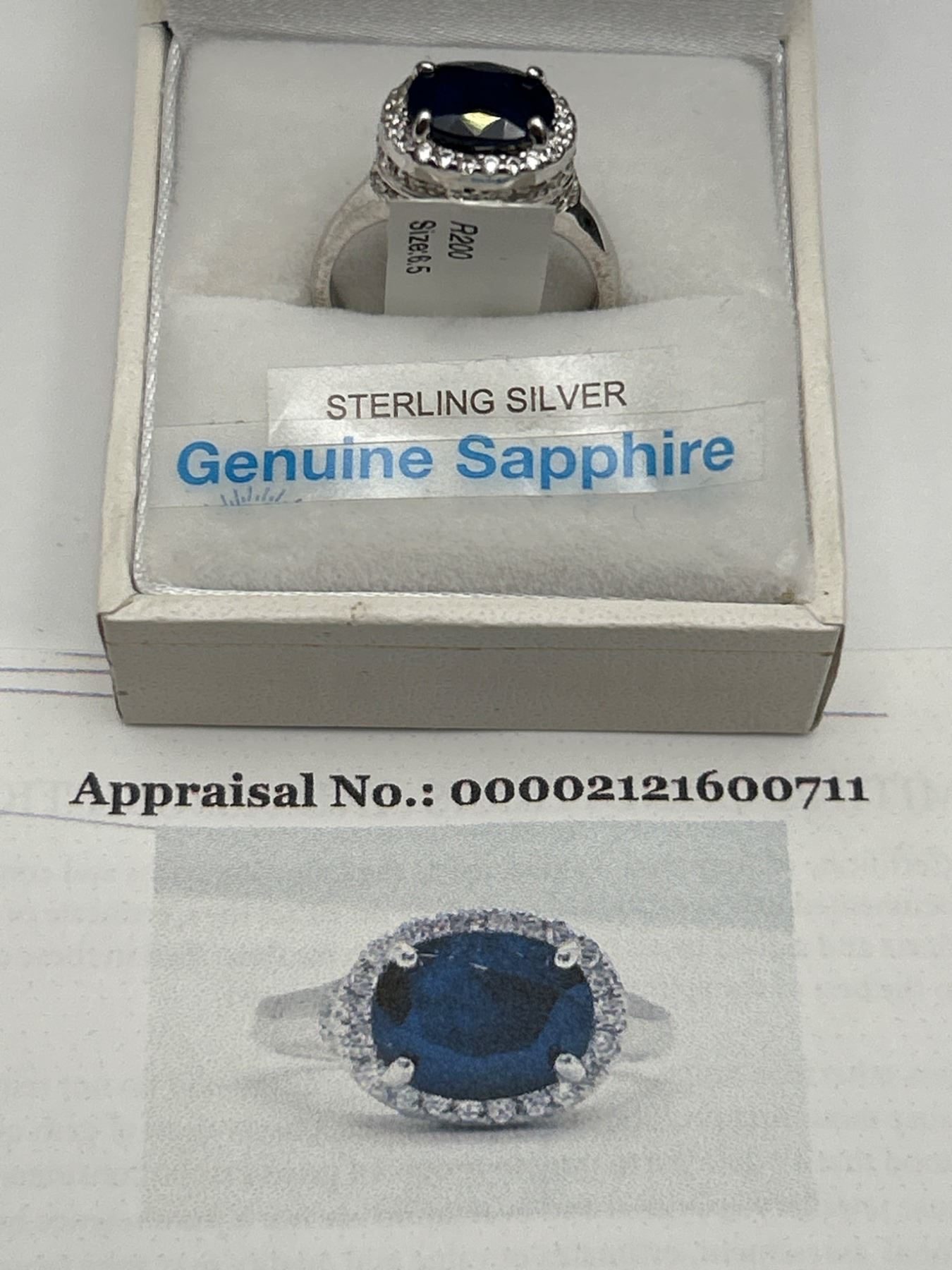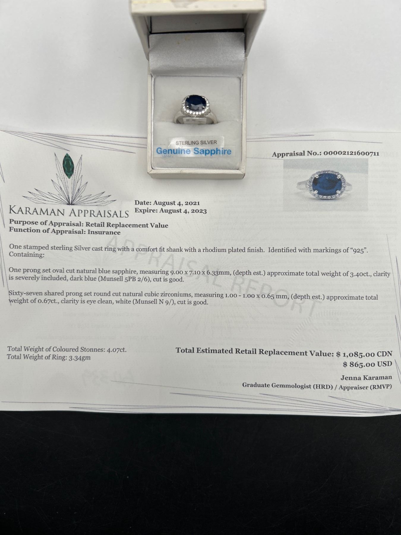 Sterling silver ring set with a genuine 3.40 Carat sapphire at its center, surrounded by a halo of cubic zirconium stones. The sapphire has an oval cut, and the ring has a band with intricate detailing. Includes an appraisal document indicating an instrumented retail replacement value of $1085. The ring is designated as size 6.5