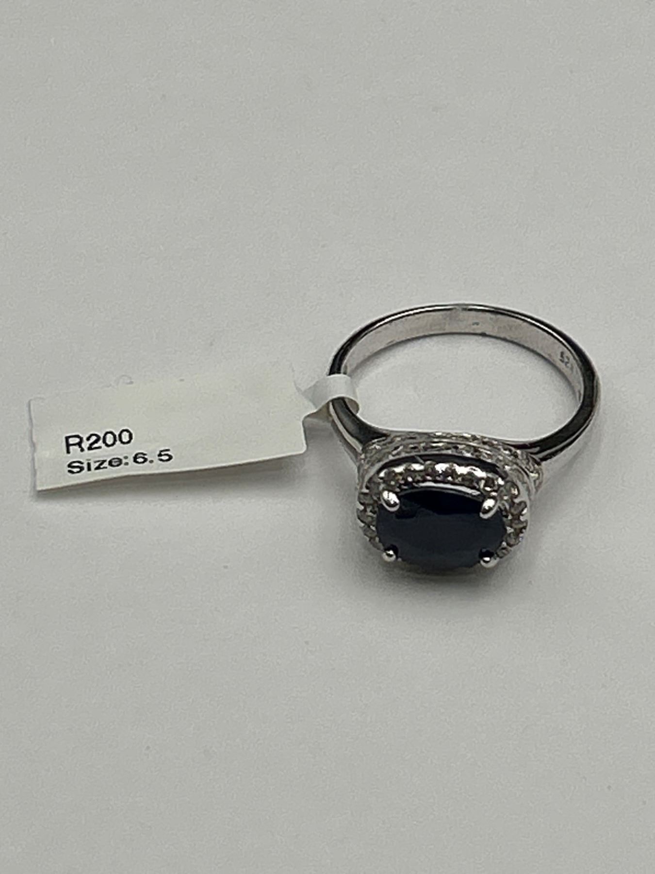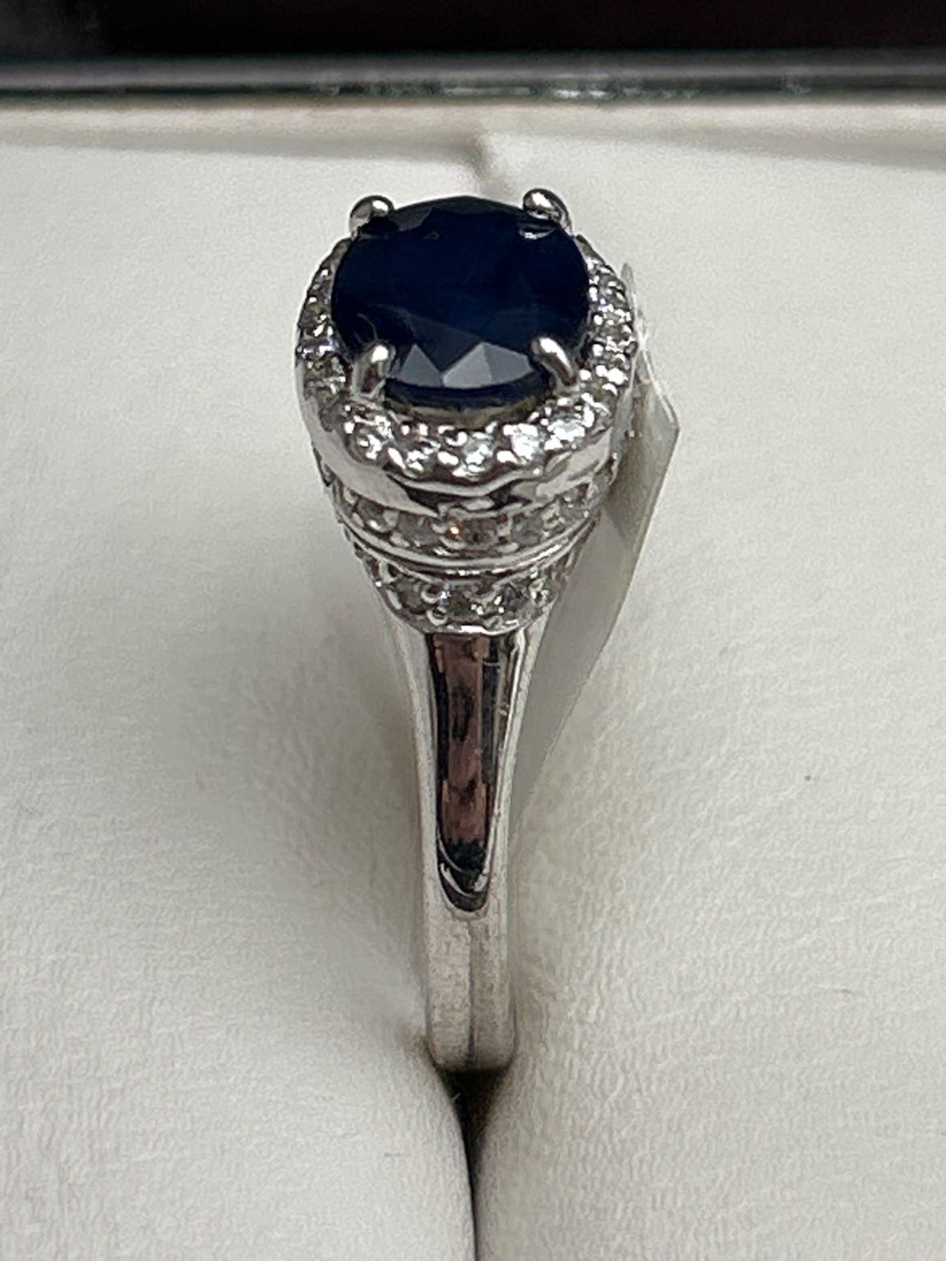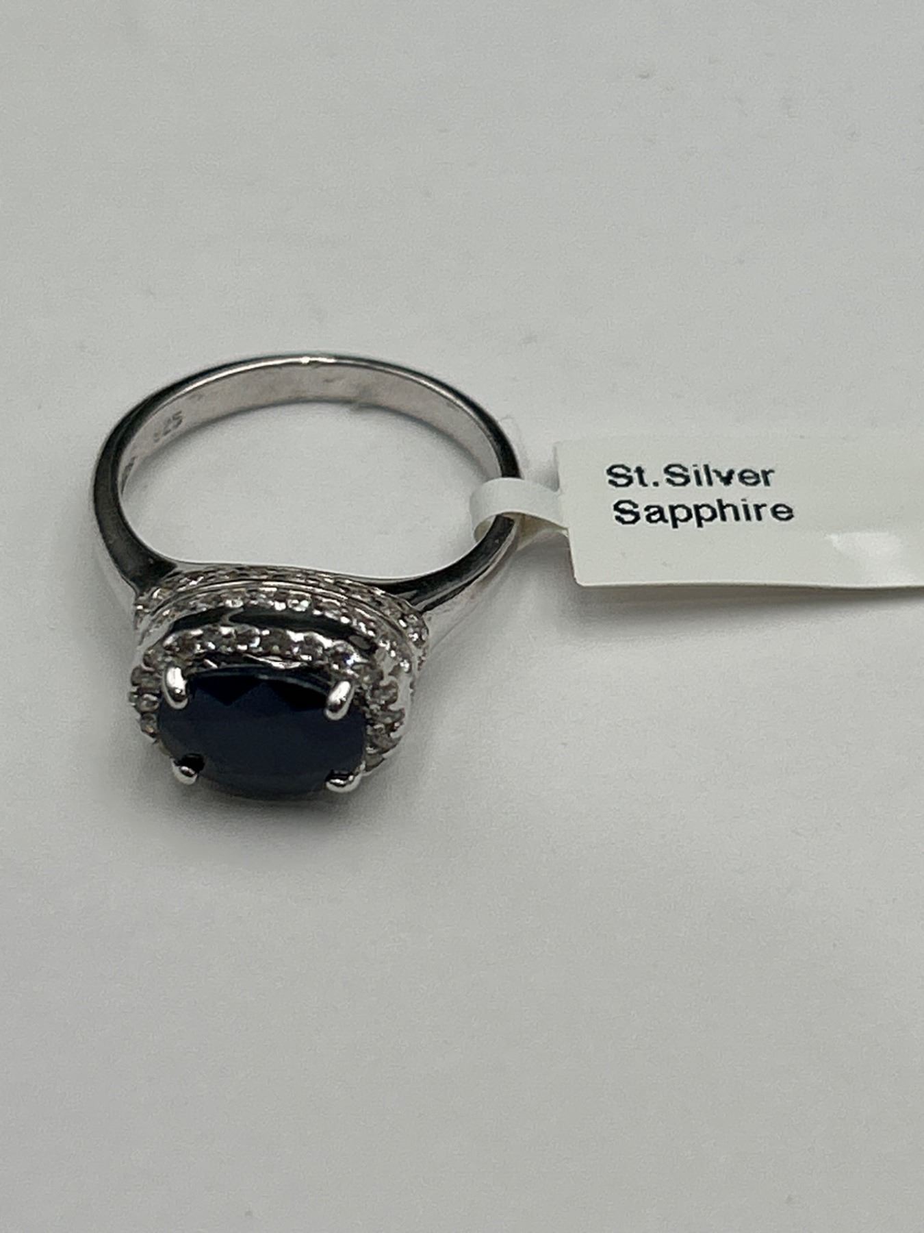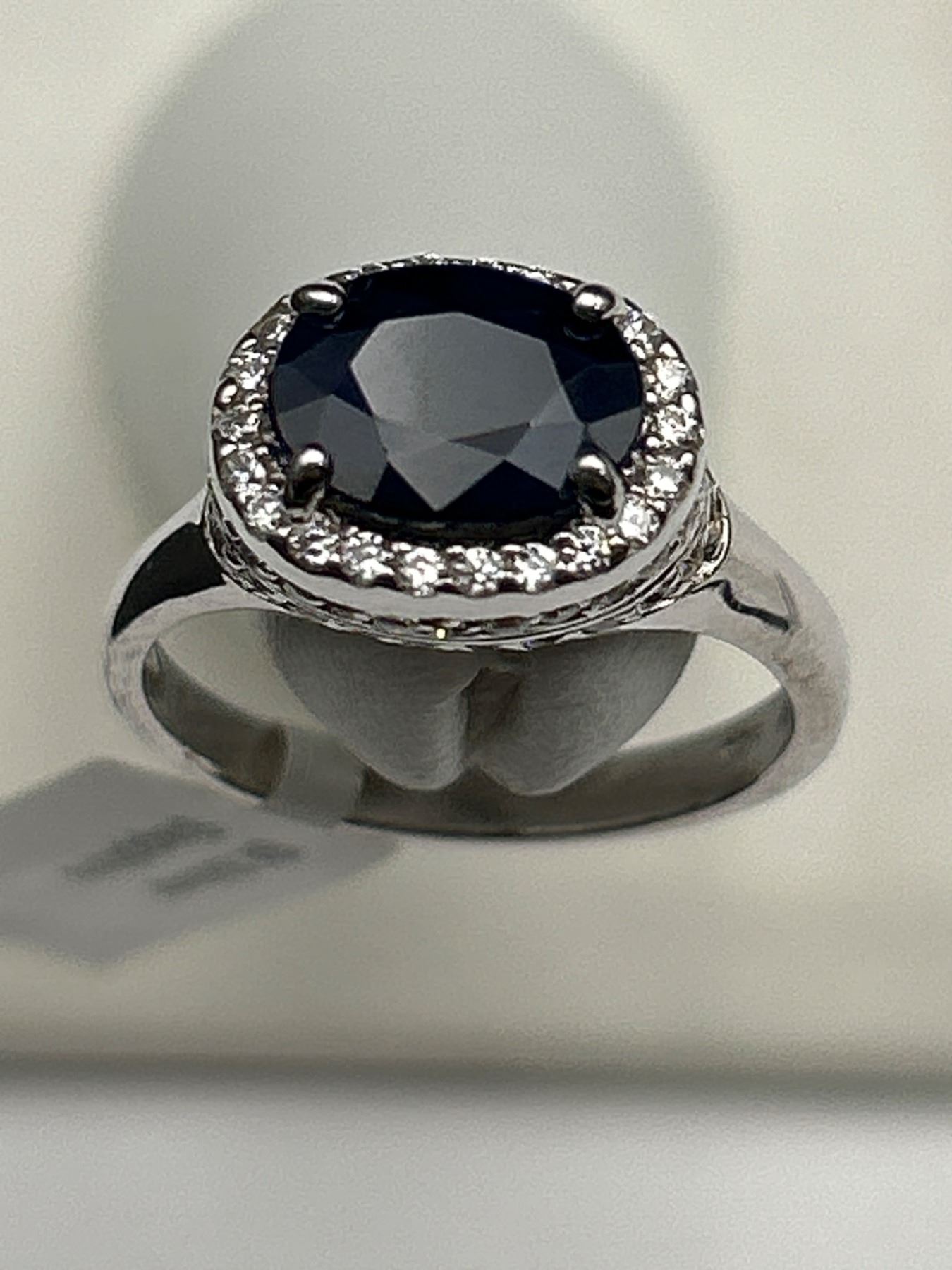 Sterling silver ring set with a genuine 3.40 Carat sapphire at its center, surrounded by a halo of cubic zirconium stones. The sapphire has an oval cut, and the ring has a band with intricate detailing. Includes an appraisal document indicating an instrumented retail replacement value of $1085. The ring is designated as size 6.5