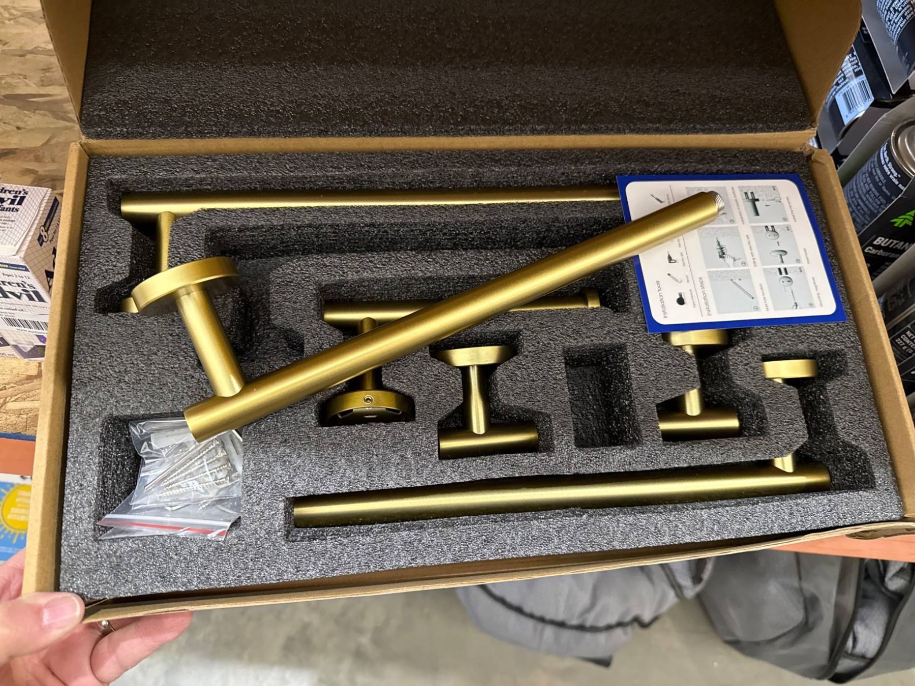 Brass Hardware Set with Mounting Components and Installation Overview
