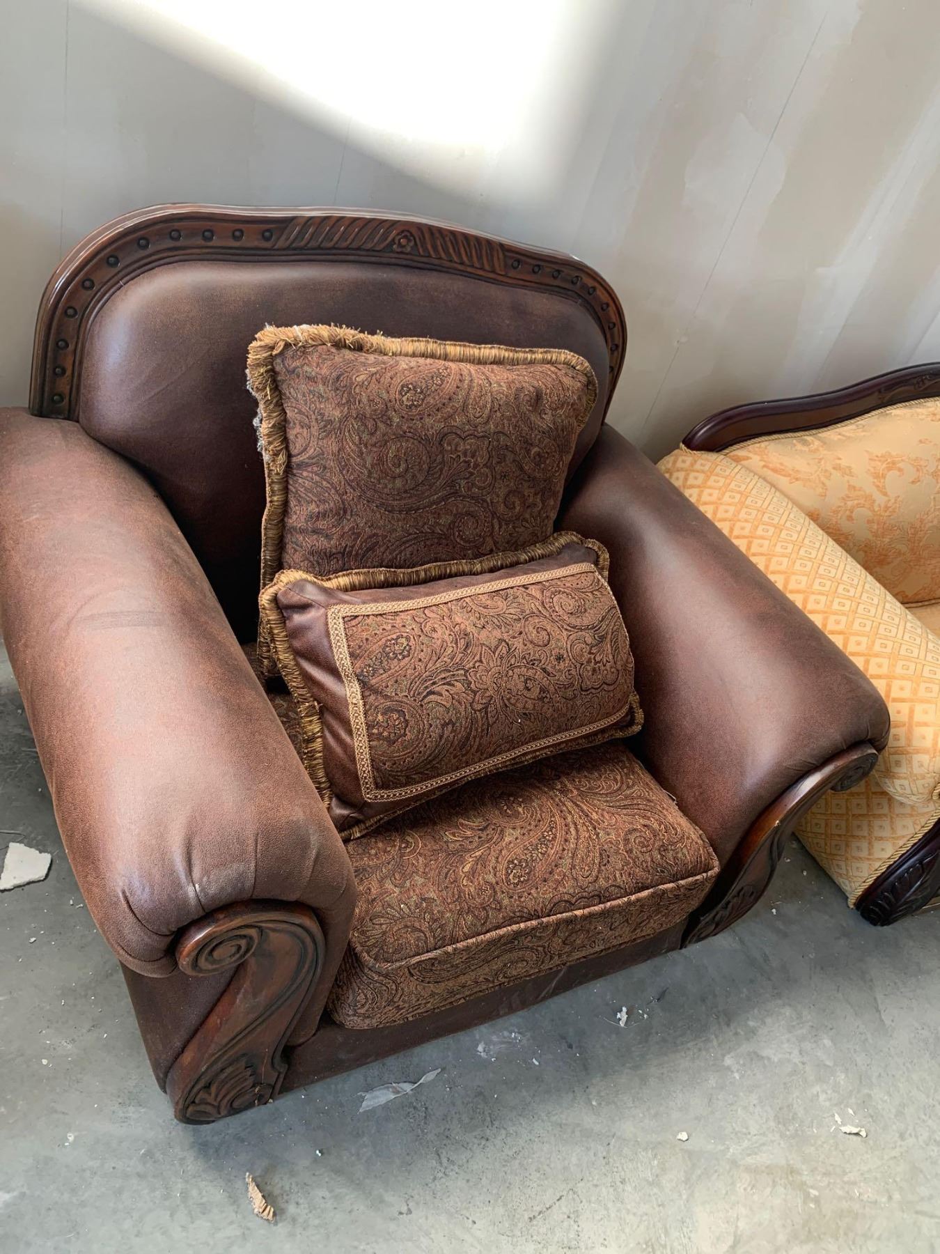 Brown Leather & Upholstered Living room Chair with throw cusions no legs FLOOR DISPLAY MODEL- pick up Dec. 30 from 9-3, off site location 4231-109 AVE NE