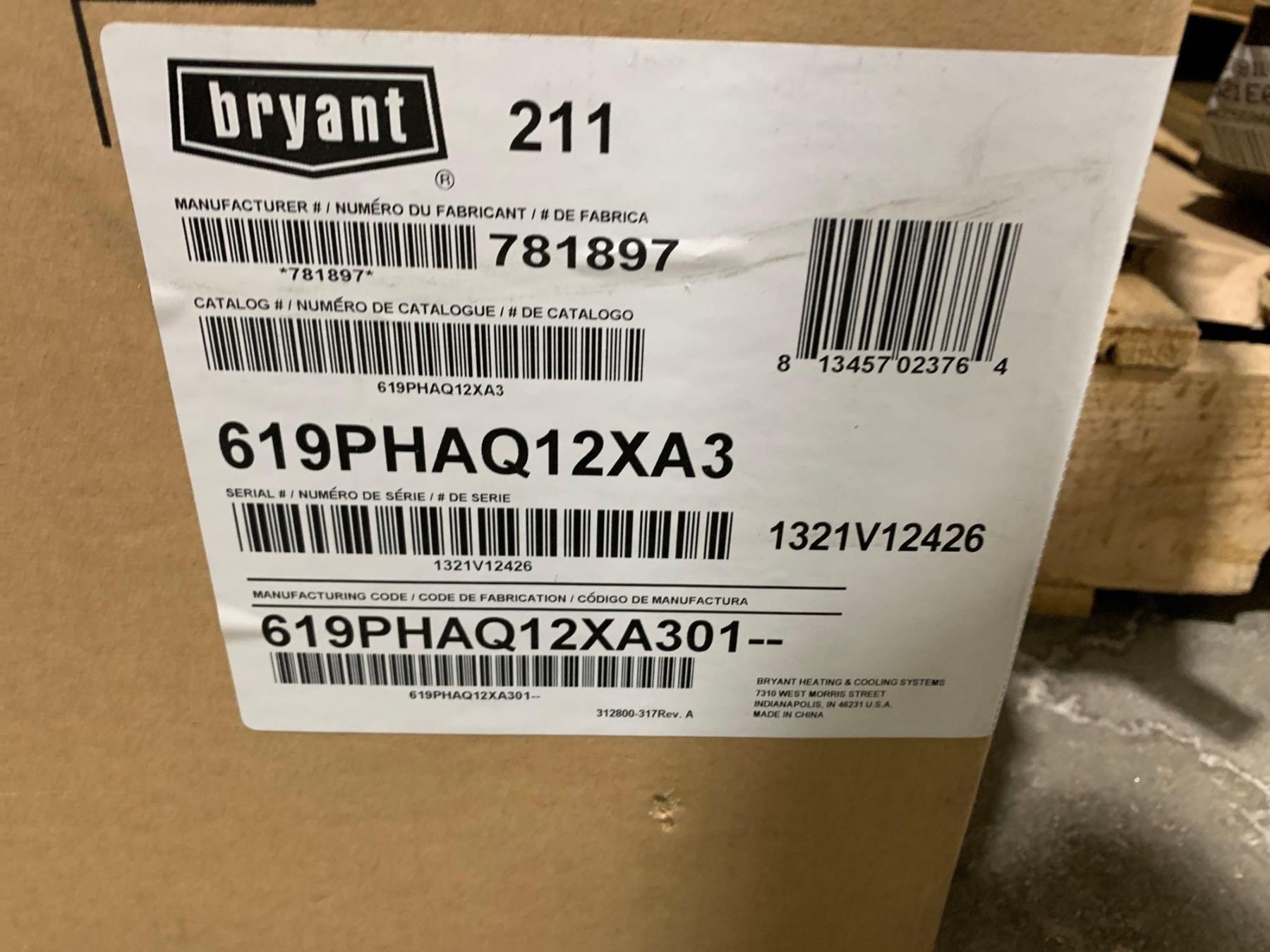 Bryant Model 619PHAQ12XA3 1 Ton Ductless Heat Pump High Wall Fan Coil Unit
