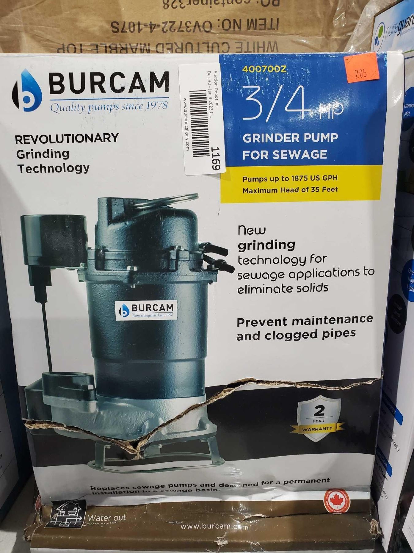 Burcam 3/4 hp Grinder Pump for sewage 1875 us gph some damage to box  as seen in pictures
