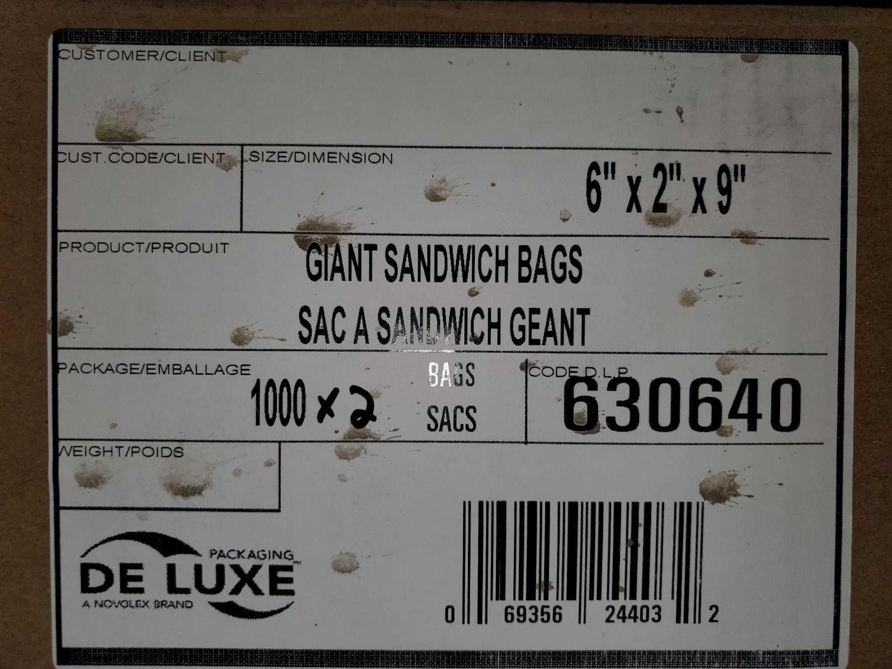 CASE LOT DeLuxe Giant Sandwich bags 6"x2"x9" 1000x2