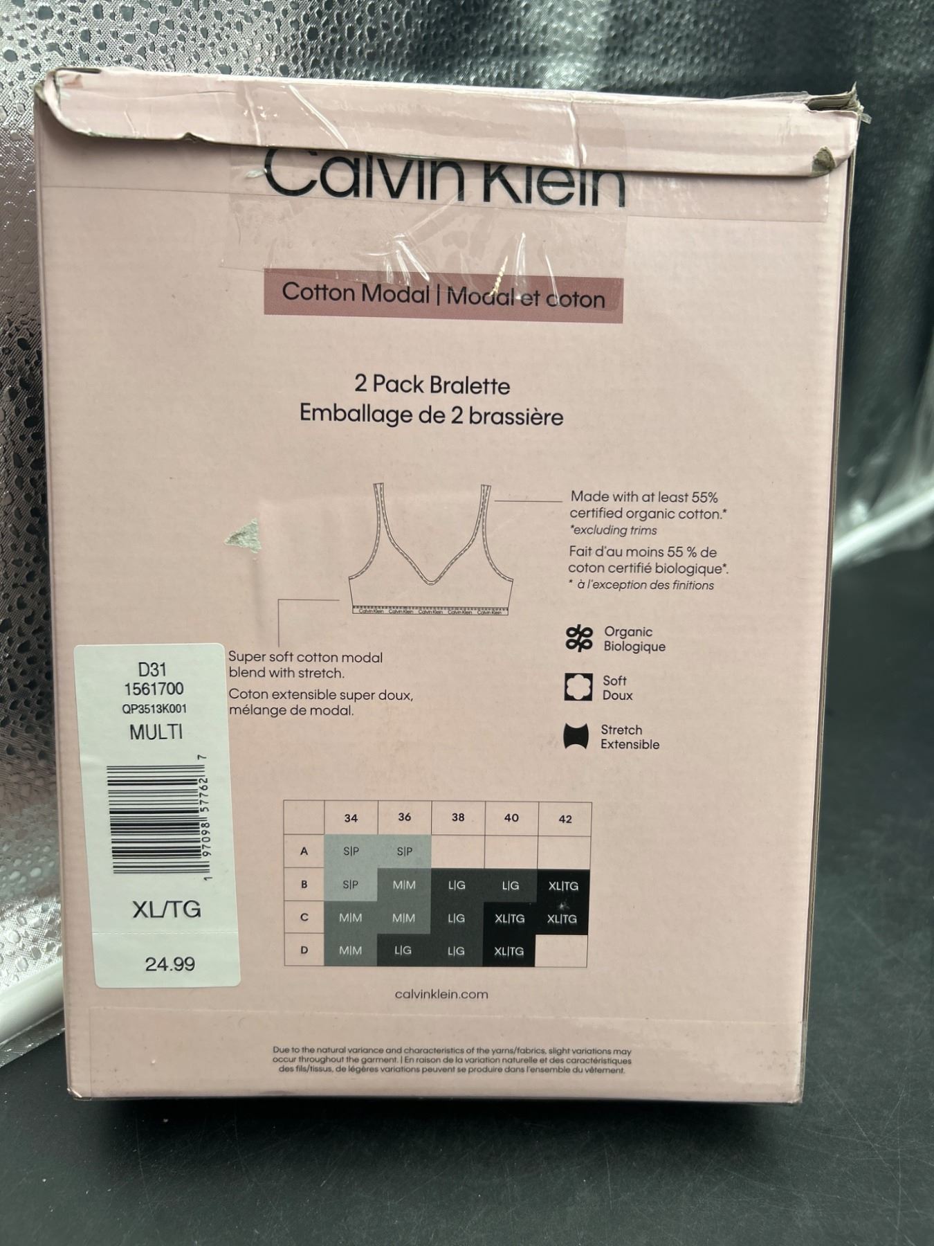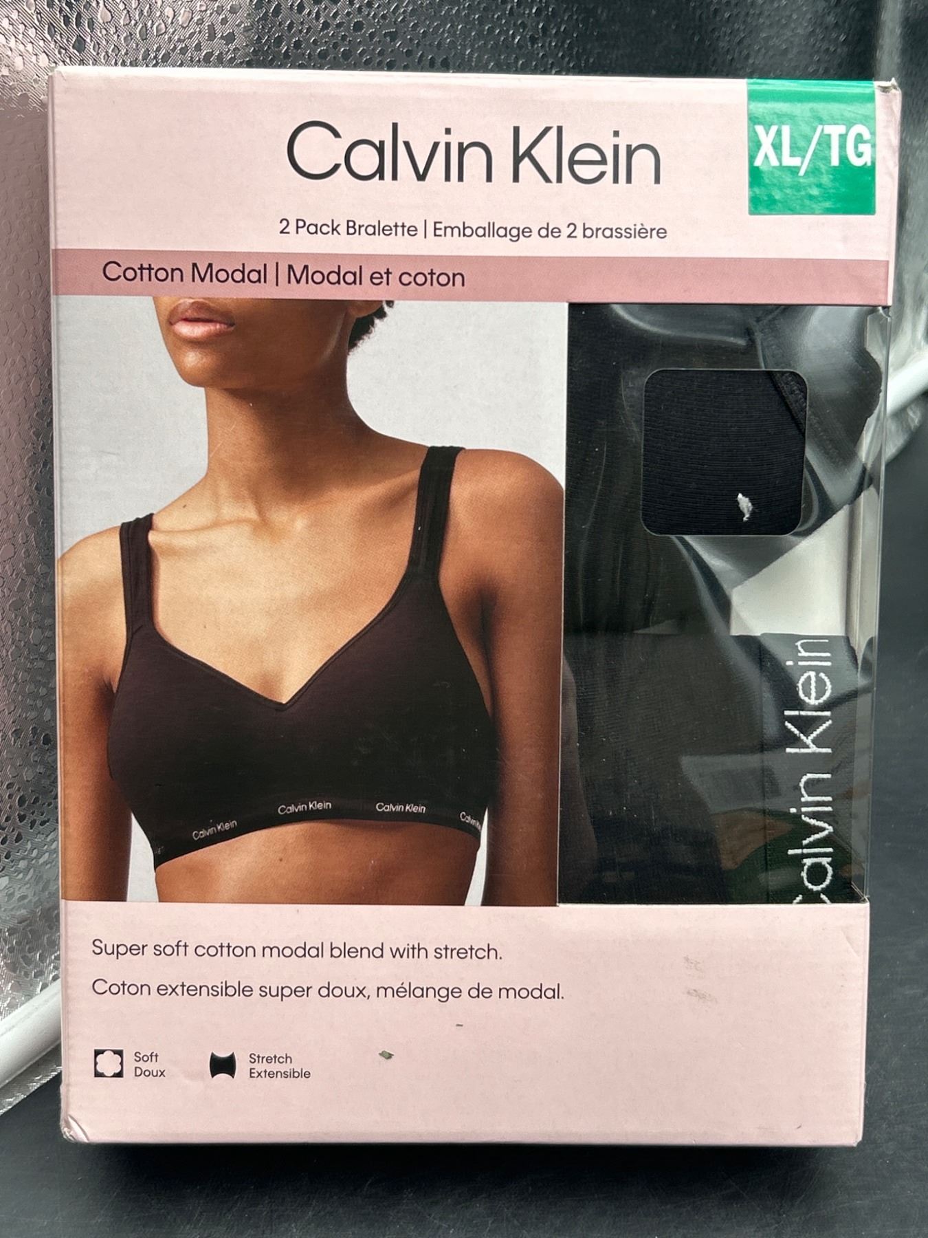 This listing features a 2-pack bralette set from Calvin Klein. This set is crafted from a cotton modal blend with stretch for added comfort. Size is XL/TG, and product code is CJ1 1913740. The color is black as marked by the 'MULTI' identifier on the label. The bralettes are designed with a scoop neckline and adjustable straps.