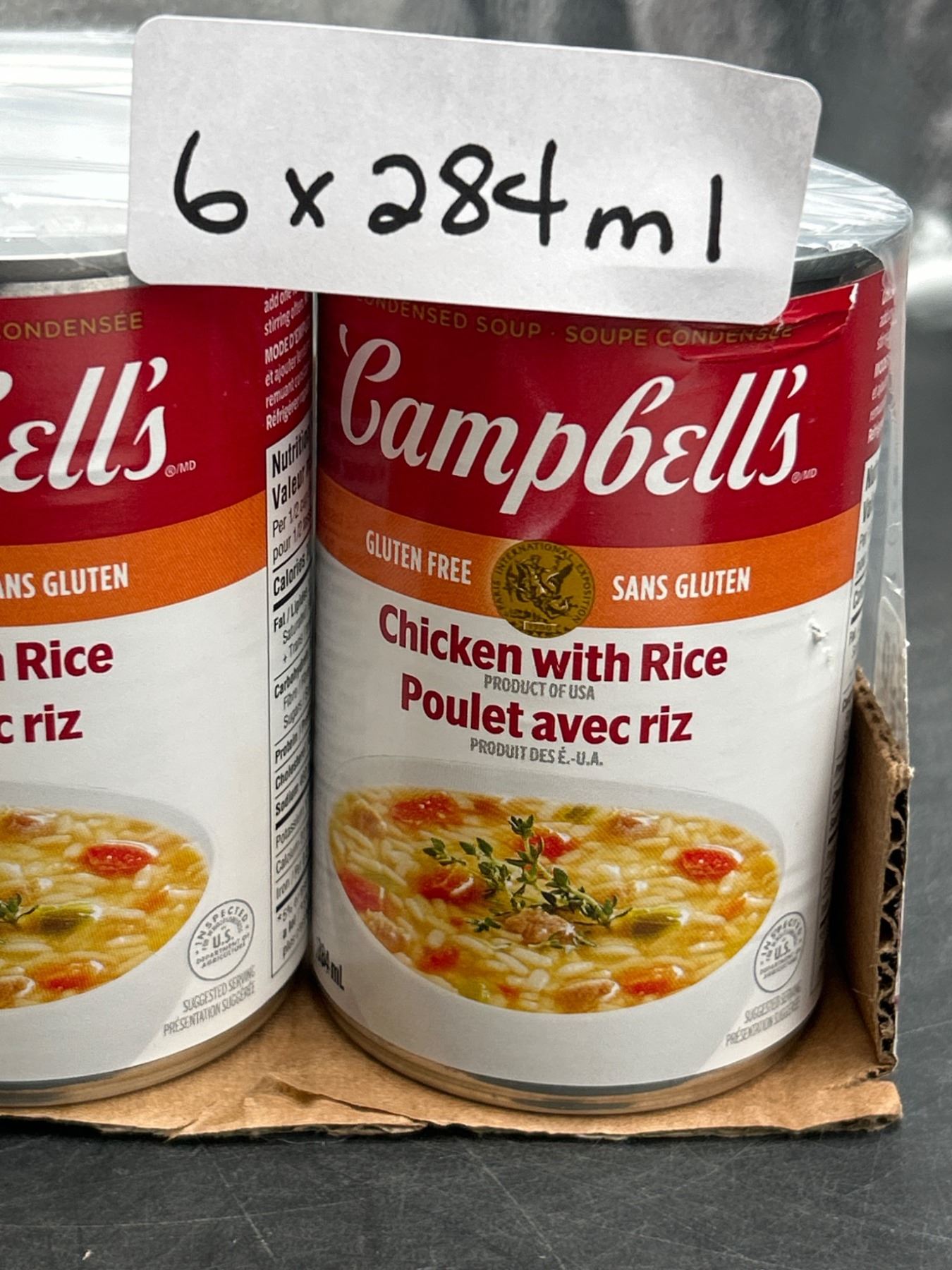 This lot consists of six cans of Campbell's Chicken with Rice Soup, each with a volume of 284 mL. The product is labeled as gluten-free and features bilingual English and French text. Suitable for various culinary uses.