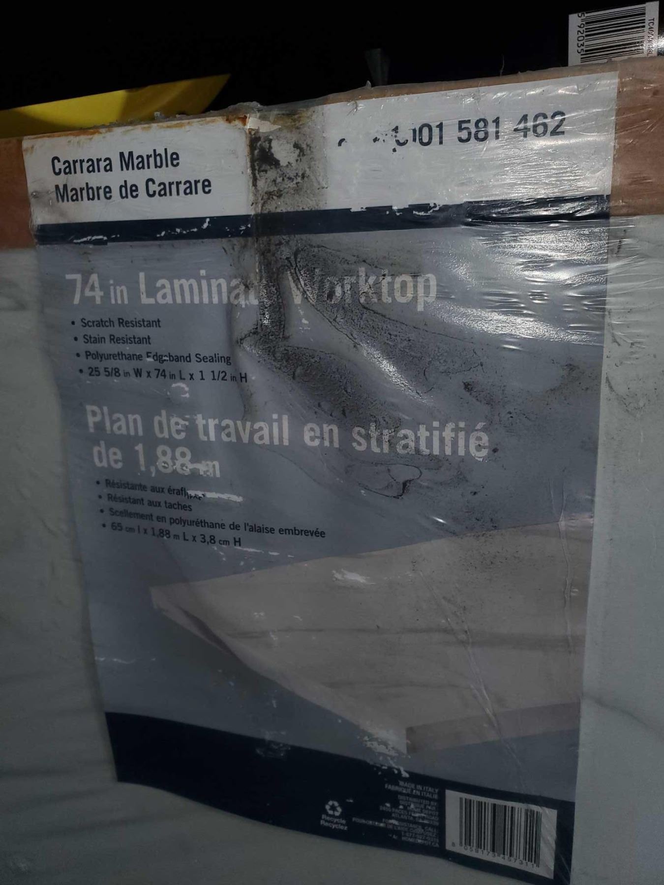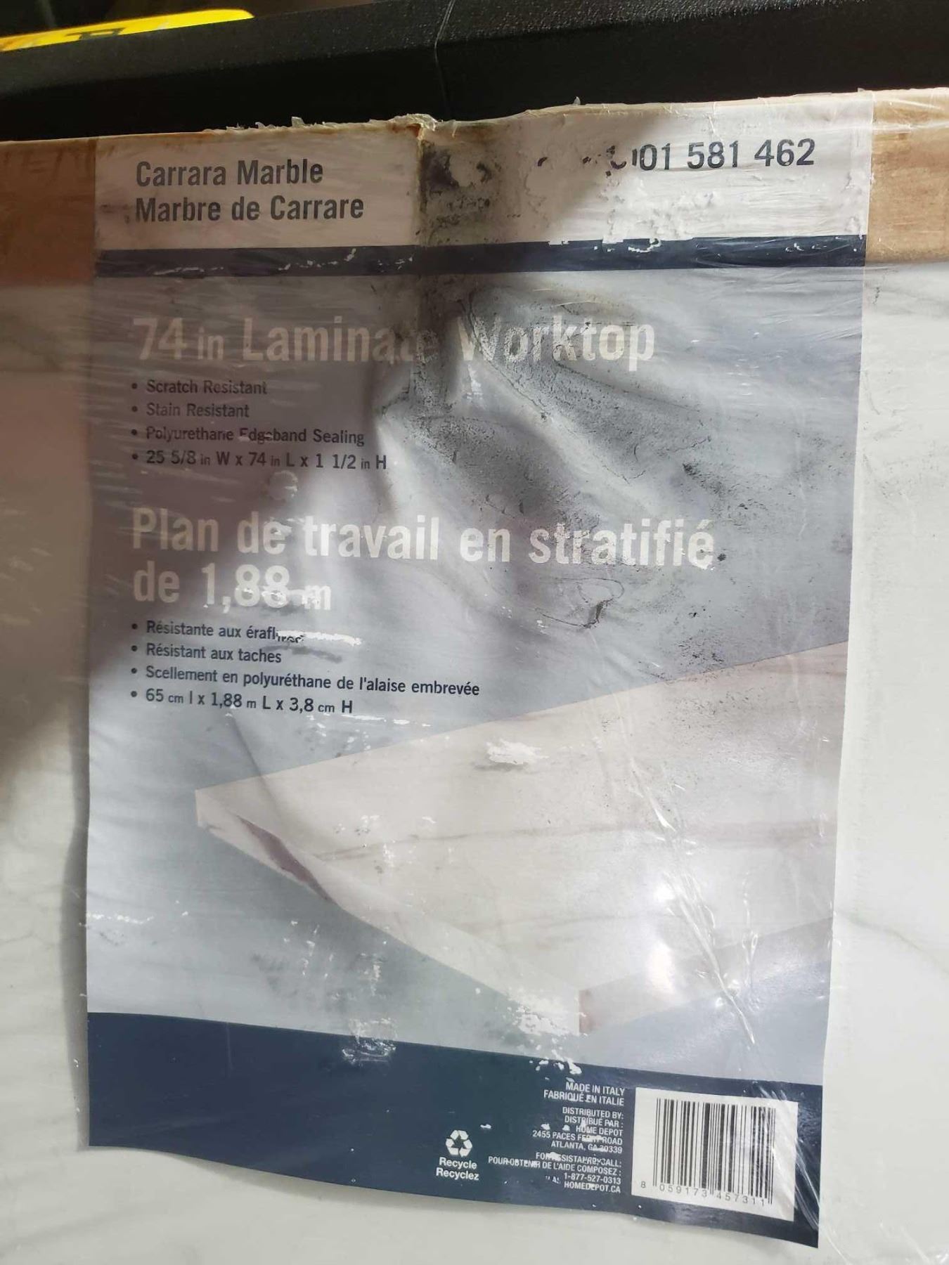 Carrara Marble, 74" laminate worktop, scratch & stain resistant, polyurethane edge band ceiling, 25 5/8" by 74" by 1- 1/2 inches