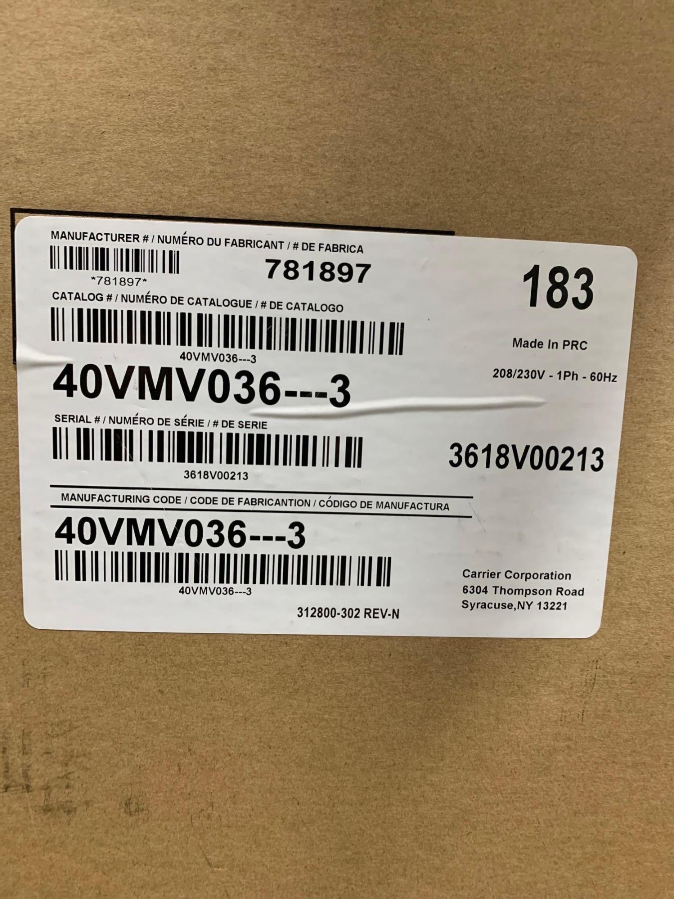 Carrier Model 40VMV036---3  36K CARRIER VRF VERTICAL Air Handling Unit new in box