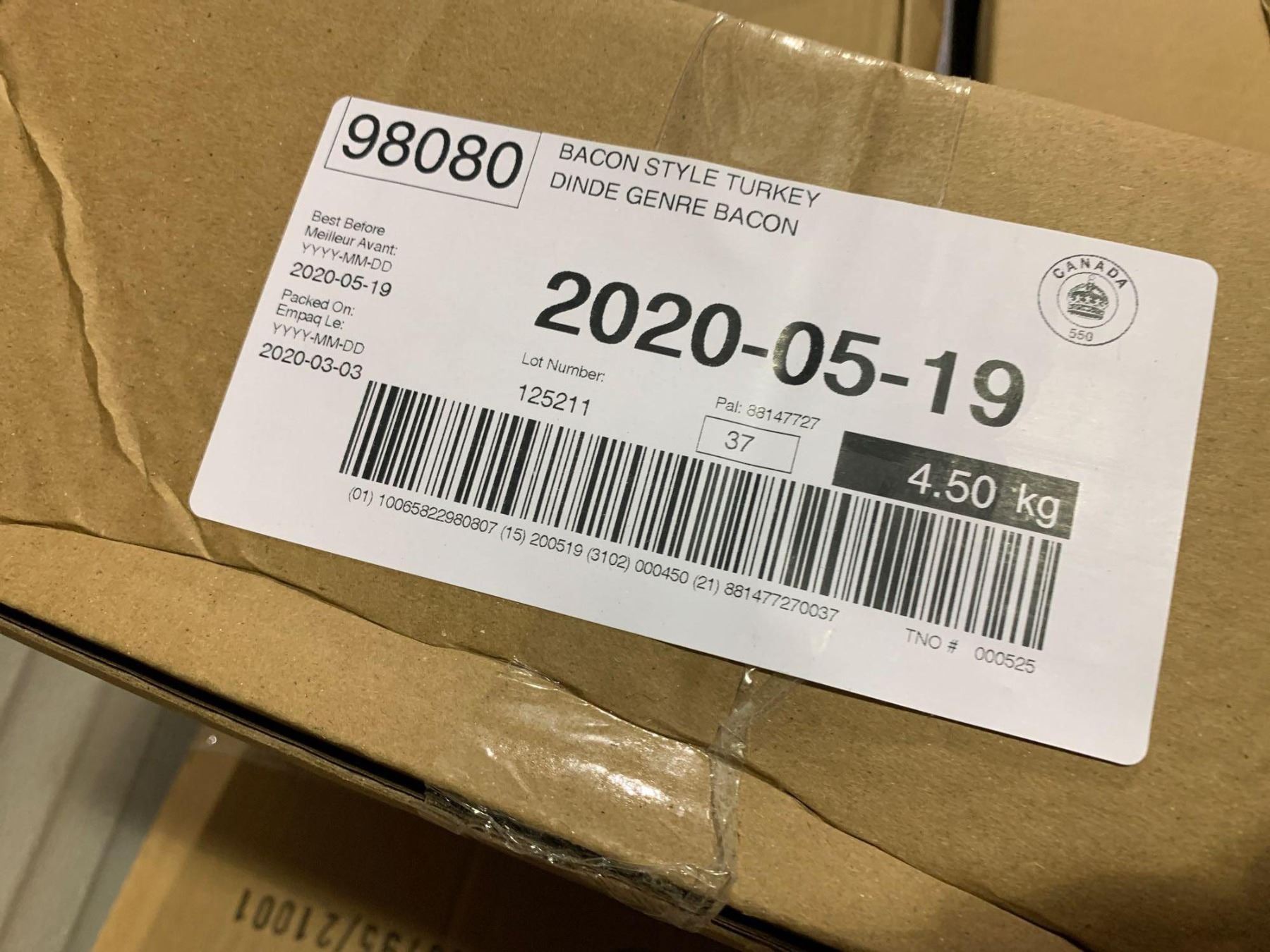 Case lot of 12 x 375 gram Butterball Turkey Bacon frozen
