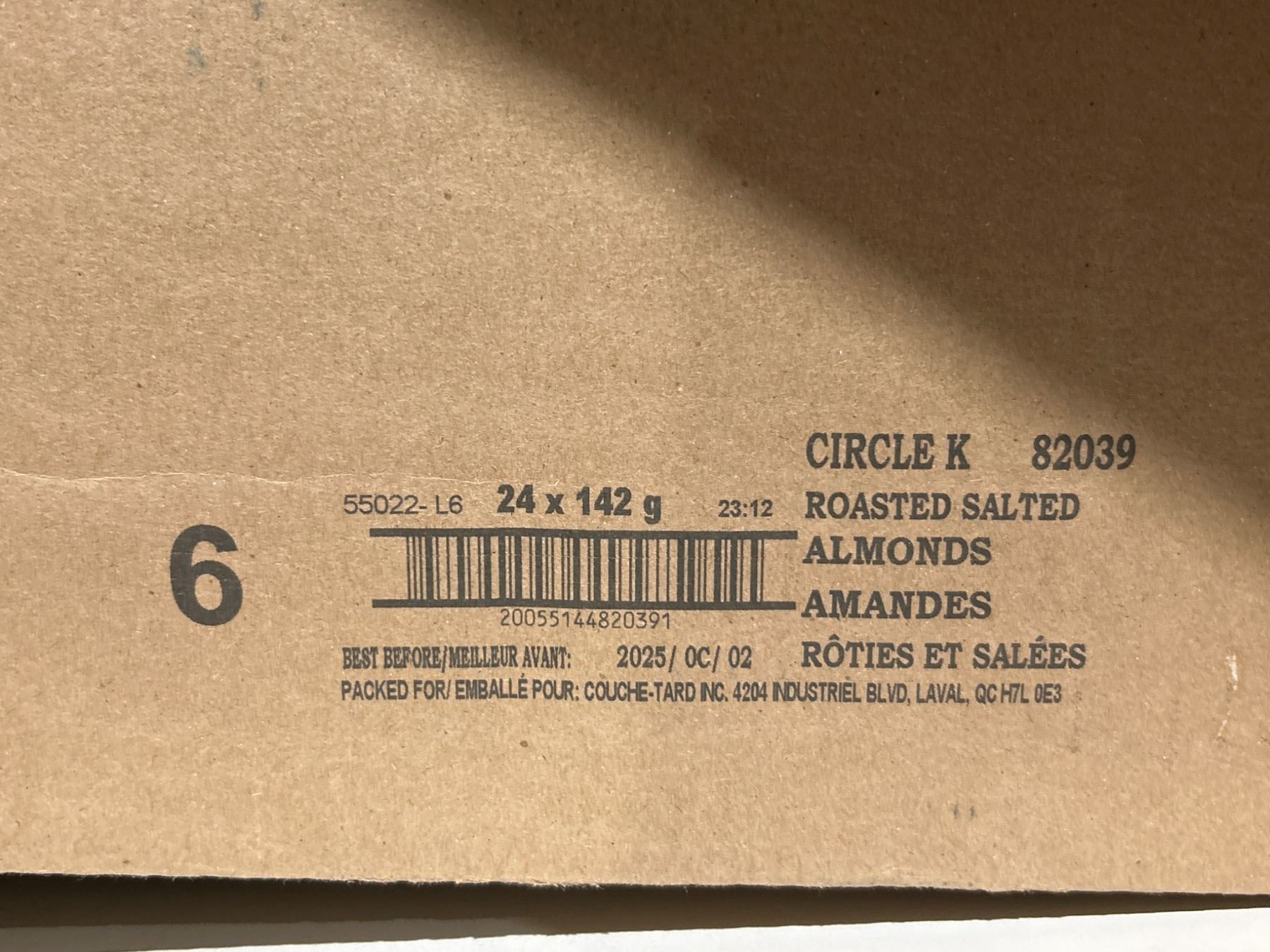 A case containing 24 units of Circle K Roasted Salted Almonds, each weighing 142g. The almonds are labeled in English and French (Roasted Salted Almonds/Amandes Roties et Salees). Product code 82039 and packaging date code visible. Packed for Couche-Tard Inc., Laval, QC H7L 0E5.