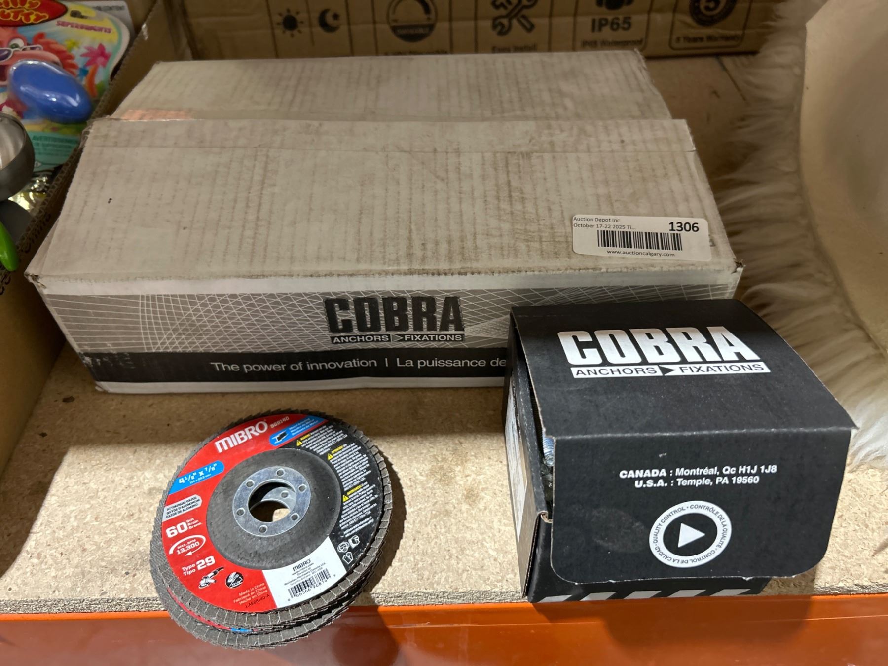 The lot includes 300 pieces of Cobra Para Wedge Concrete Anchors, model 010-C-3572 (3/8 inch x 3 inch), as indicated on the white label, and 50 additional pieces of the same model on the black label. Also included are MIBRO 4-1/2 inch flap discs (60 grit, Type 29). These items are suitable for concrete applications and surface grinding needs.